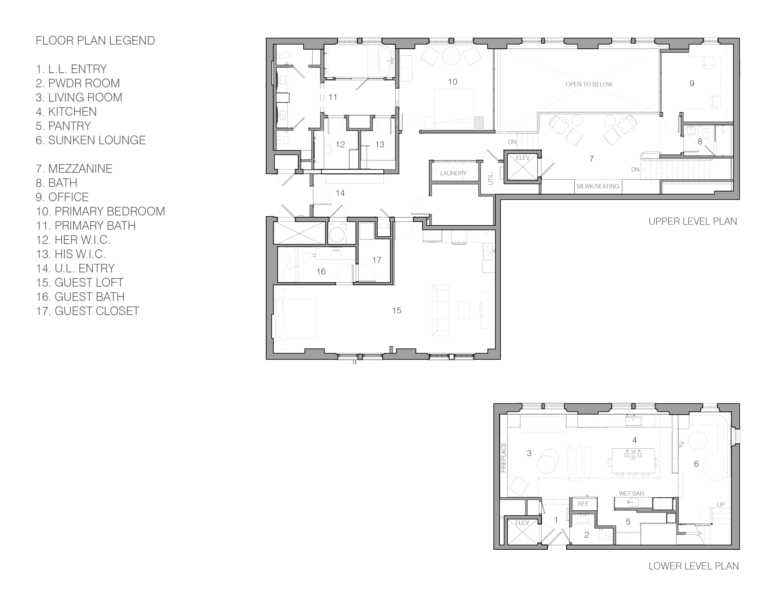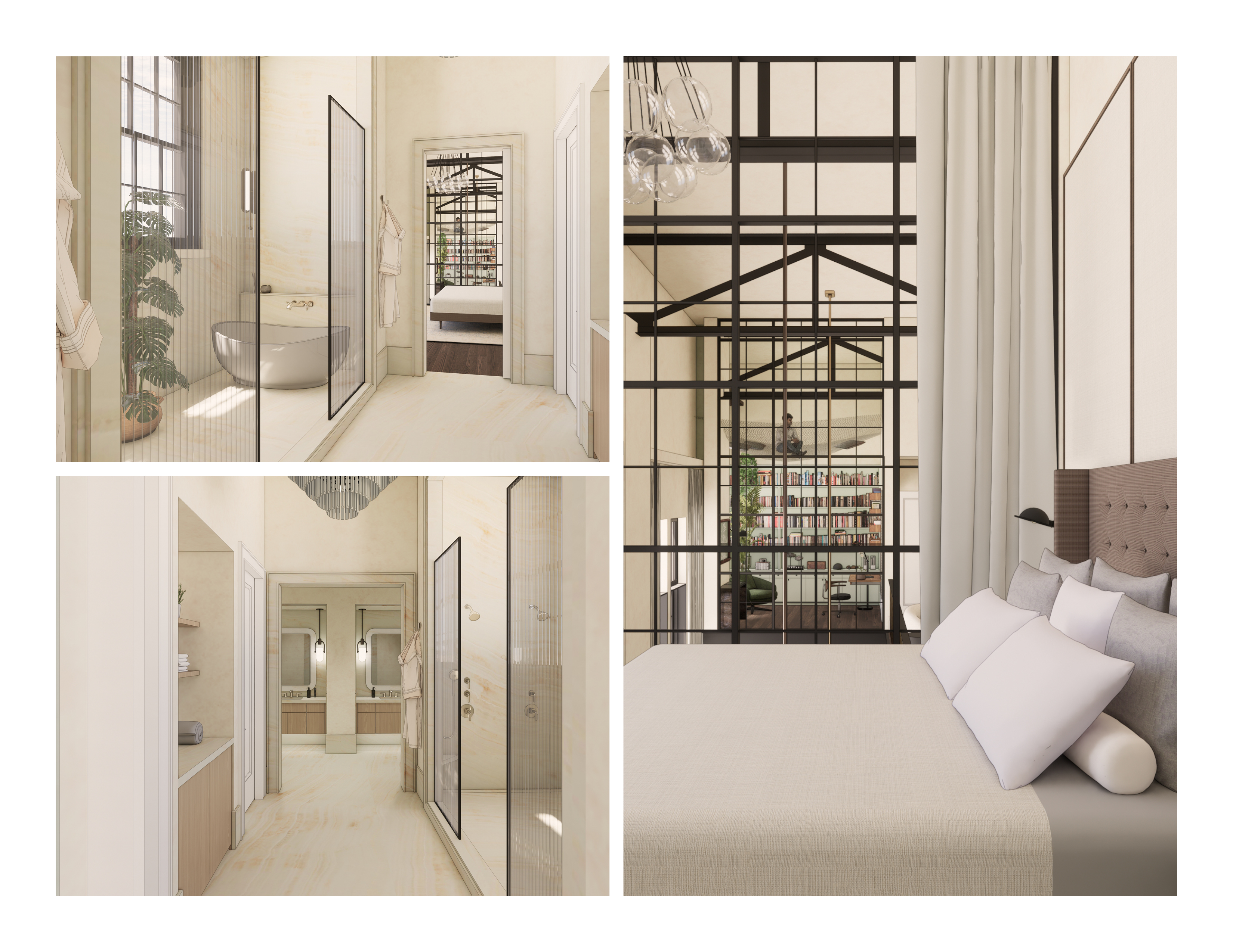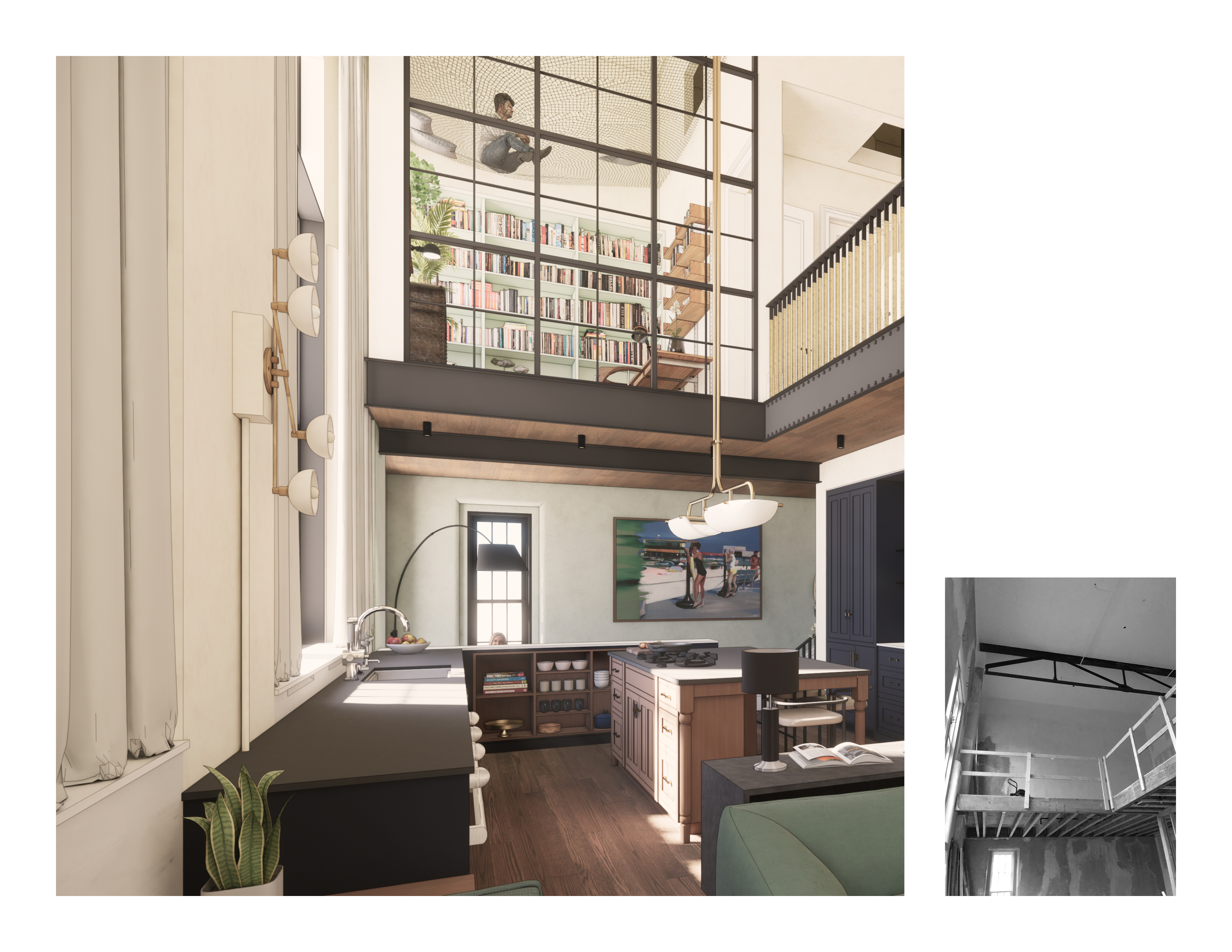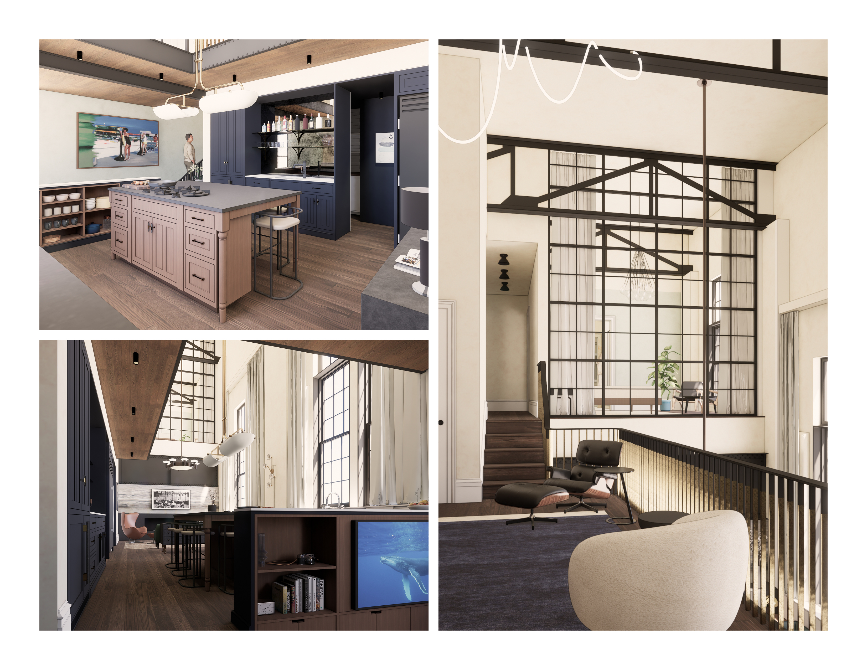This penthouse project, situated within the preserved historic Elliott School, presented a multifaceted design challenge. The primary goal was to skillfully harness the shell space layout where construction had already commenced, maximizing its impressive height, expansive volume, and dramatic potential. A secondary challenge arose from the owner's acquisition of the adjacent condominium on the second level, where the charge was to seamlessly integrate these two distinct units, ensuring a fluid and harmonious transition between them. Our response was to provide two points of entry, one on each level. With an expected frequency of out-of-town long term visitors, this would allow them to have their own entrance and exit and not disturb the day to day of the homeowners.