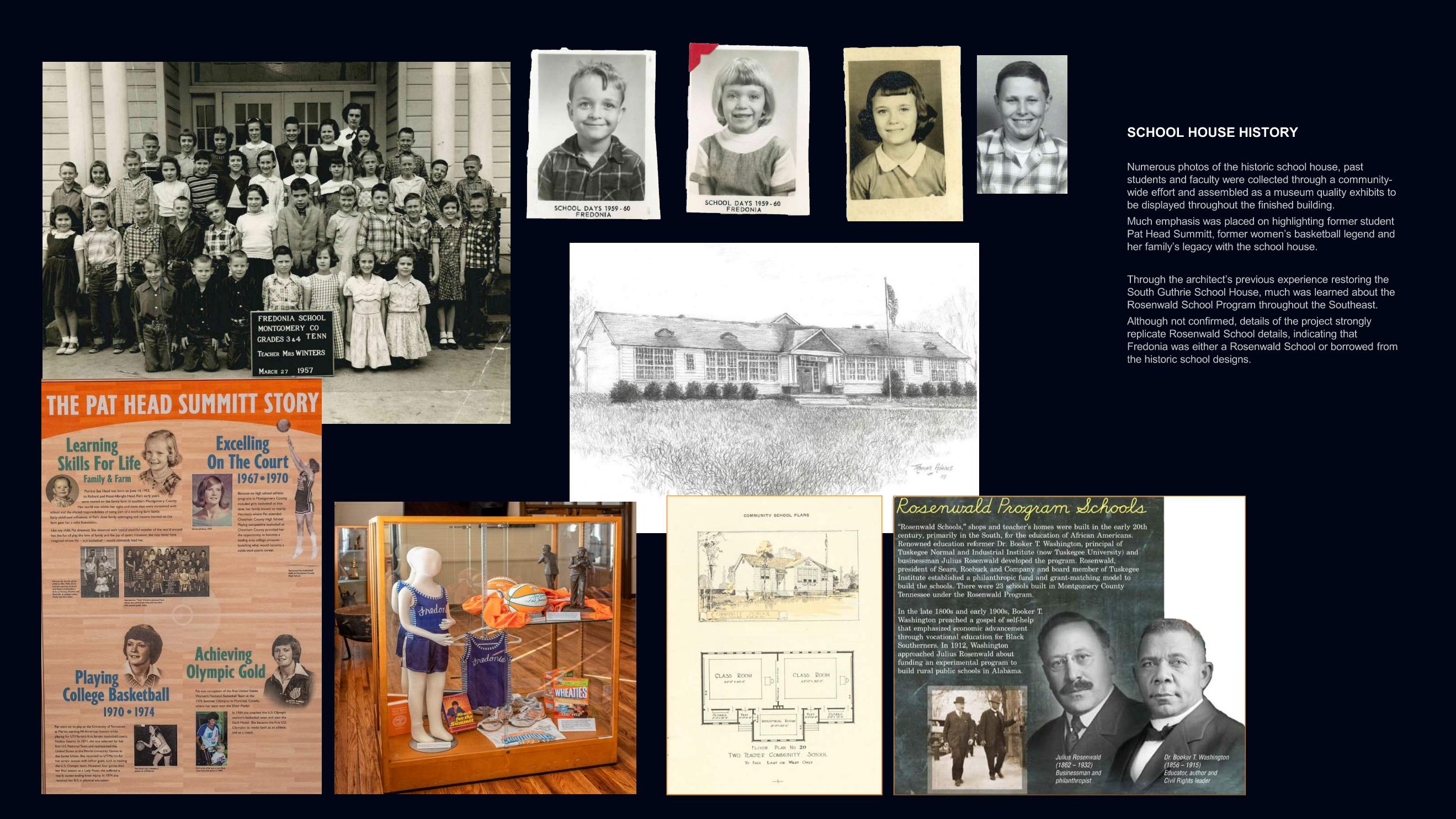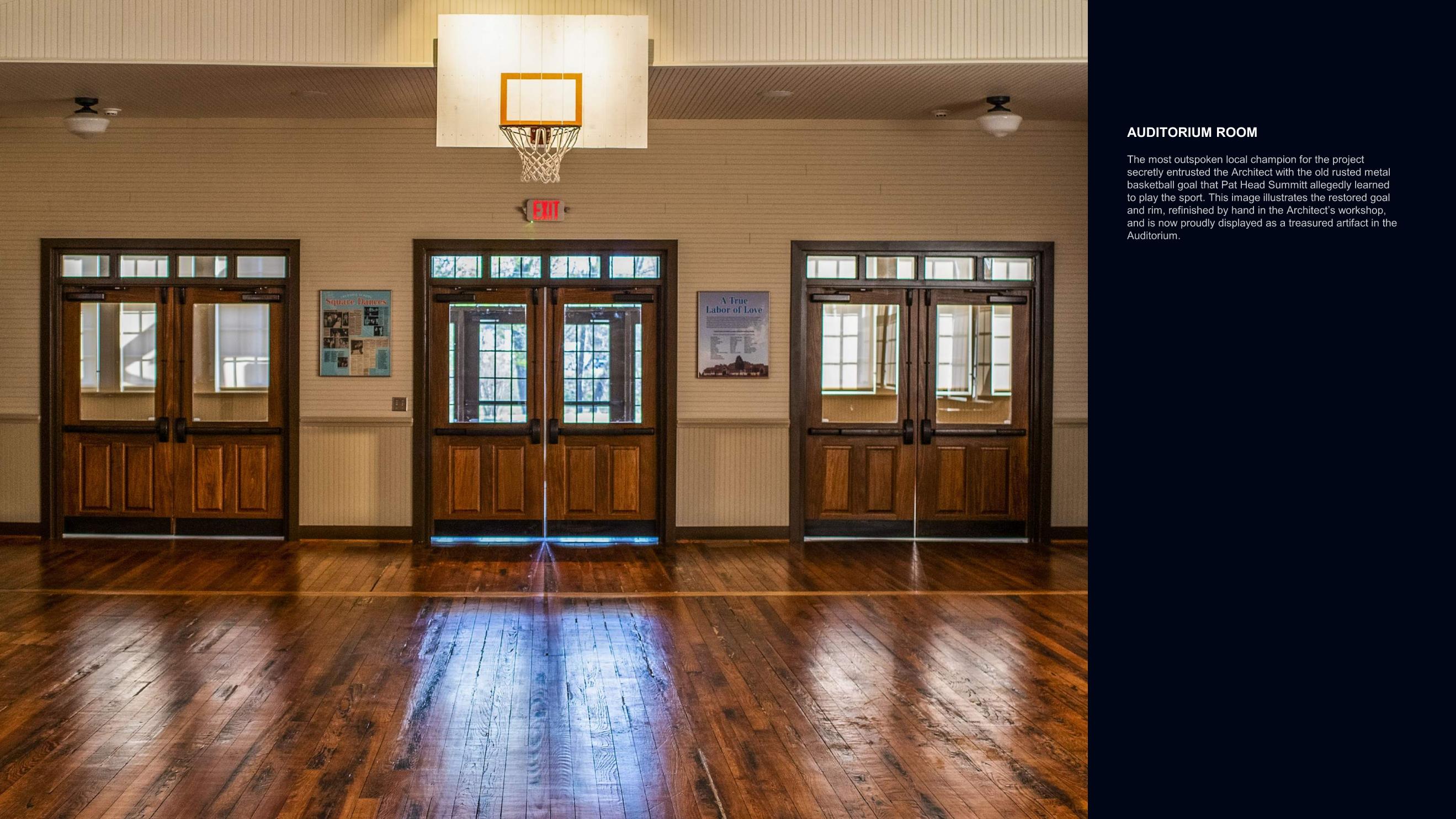 Previously, the painted wood clap board building taught generations of students – one of note being Pat Head Summitt who later became a world-renowned basketball coach at the University of Tennessee. Her classmates say that Summitt learned to play basketball on the rim located in the school’s gymnasium, which was personally restored by the Architect and reinstalled in the building as part of the restoration.