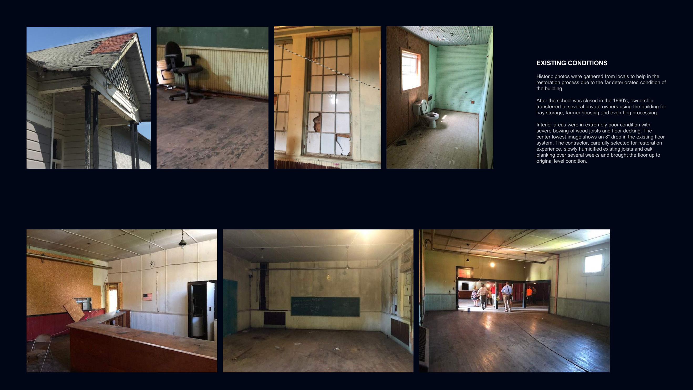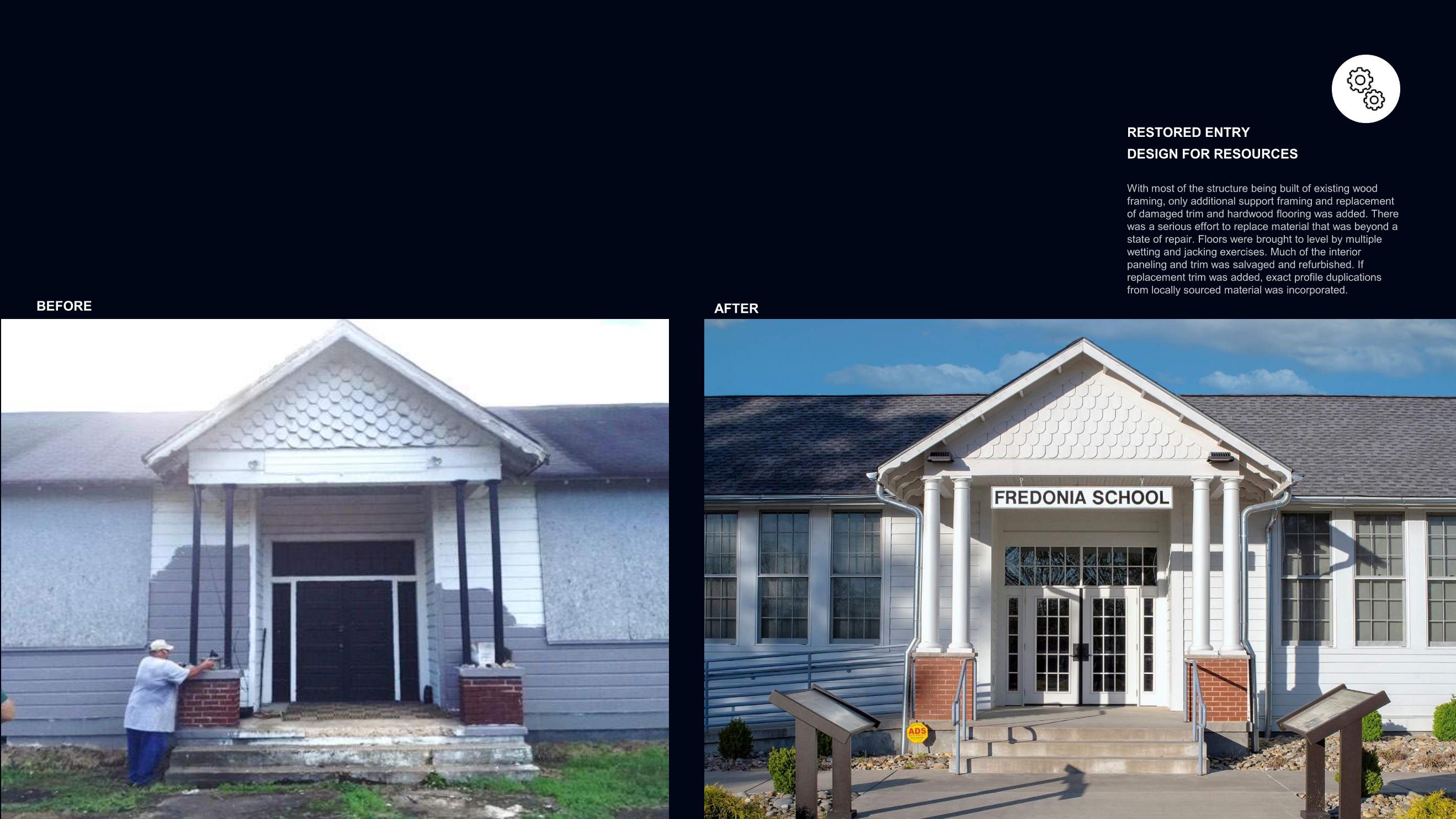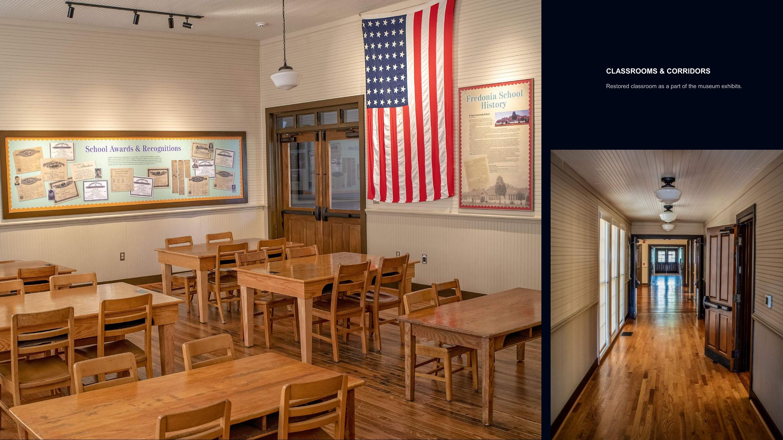 The school’s existing condition was bleak - collapsing floors, broken and rotted windows, layers of roofing and facade material, and temporary solutions that needed addressing. With a tight budget and limited resources, it was necessary for the Architect to be strategic in all design decisions and a Contractor was brought on early and selected specifically for their expertise in restoration of historic buildings to help monitor costs and collaborate strategies with the architect. The school house was restored into its former condition with minor supportive spaces added such as restrooms and a catering kitchen for future events. New additions include history rooms which tell the story of the Fredonia School House and showcase exhibits created by the local museum curator and an outdoor amphitheater for performances and events.