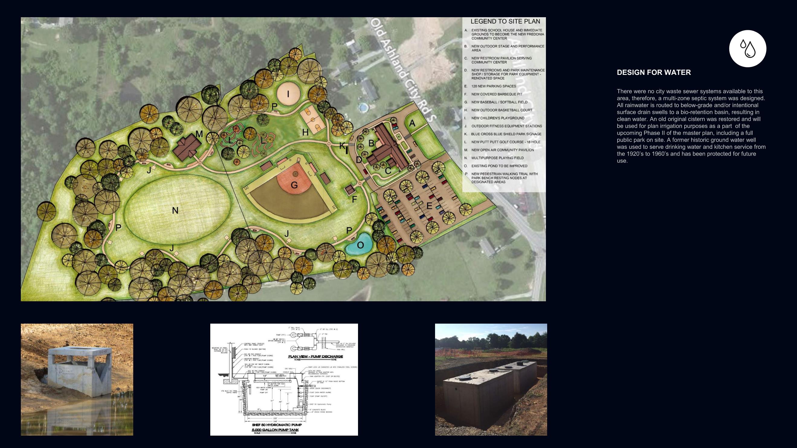 - Water - There were no city waste sewer systems available to this area, therefore, a multi-zone septic system was designed. All rainwater is routed to below-grade and/or intentional surface drain swells to a bio-retention basin, resulting in clean water. An old original cistern was restored and will be used for plan irrigation purposes as a part of the upcoming Phase II of the master plan, including a full public park on site. A former historic ground water well was used to serve drinking water and kitchen service from the 1920’s to 1960’s and has been protected for future use.