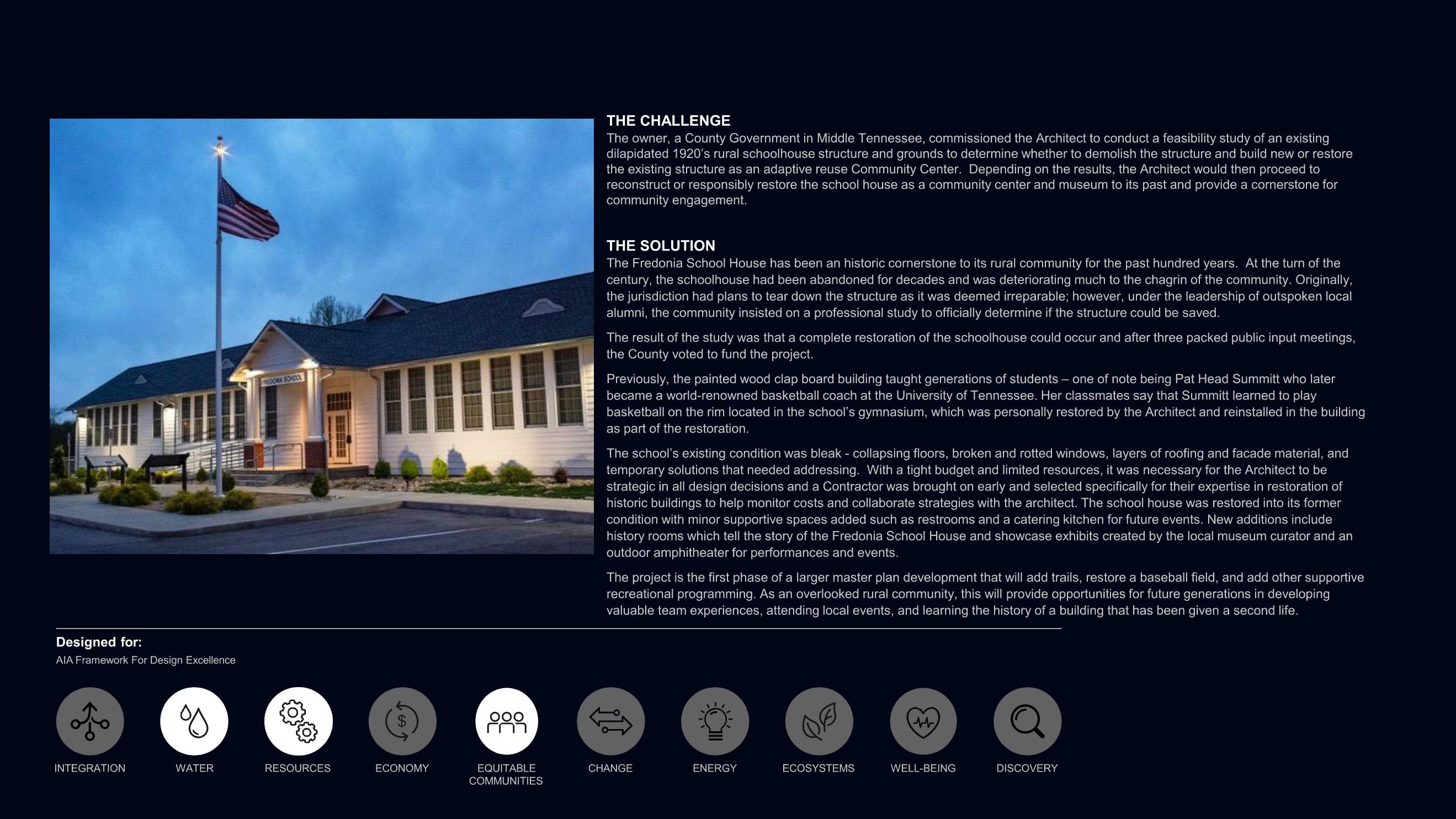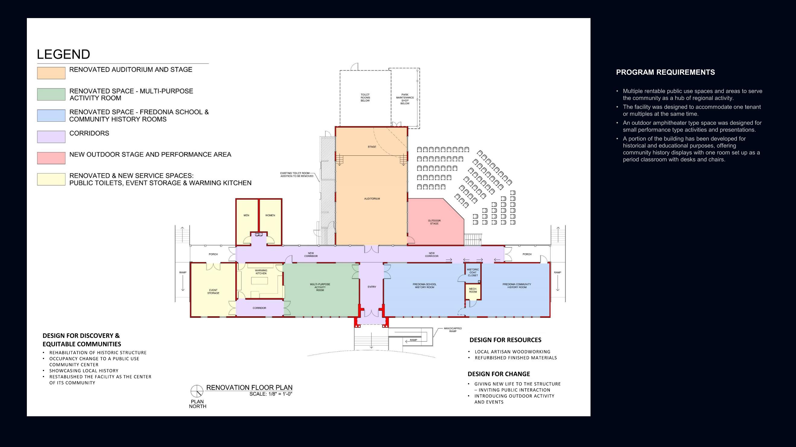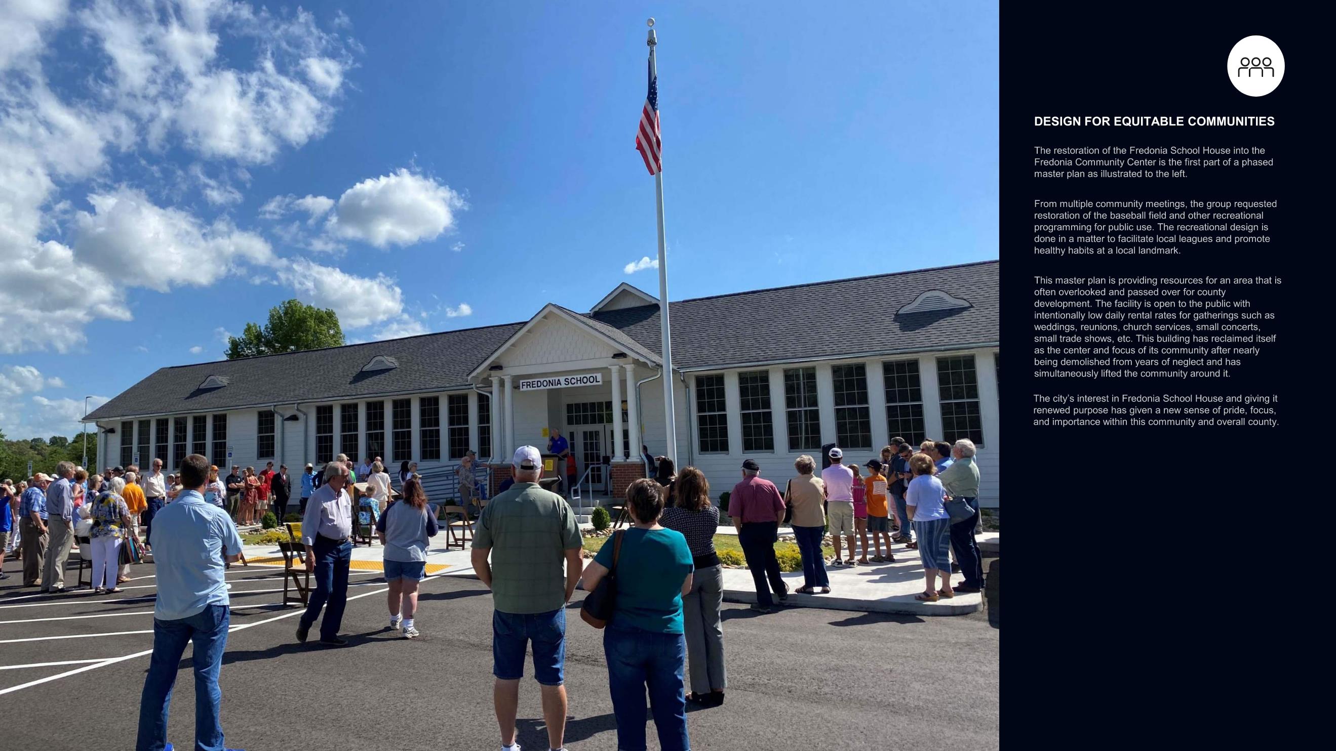 - Equitable Communities - The restoration of the Fredonia School House into the Fredonia Community Center is the first part of a phased master plan as illustrated to the left.