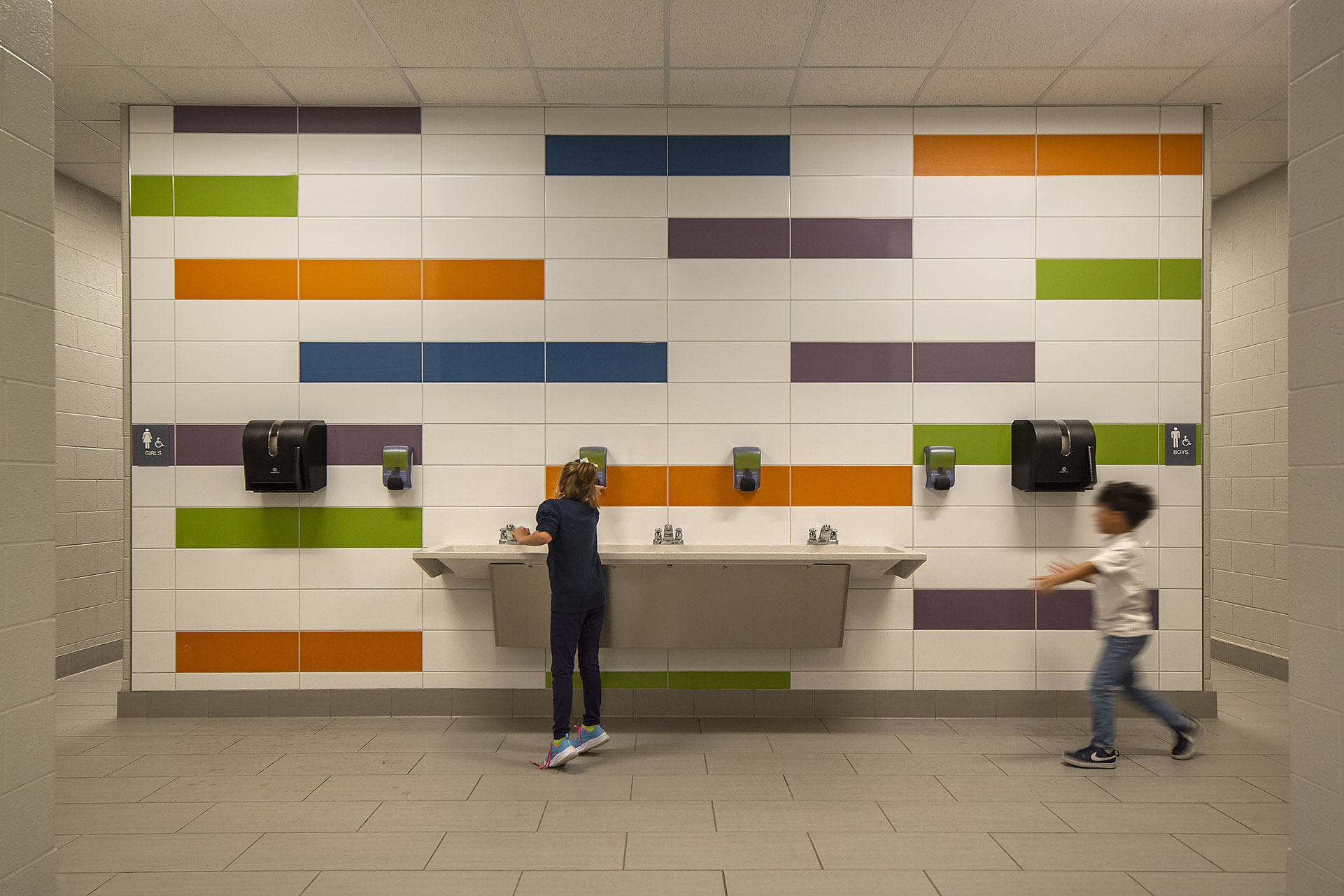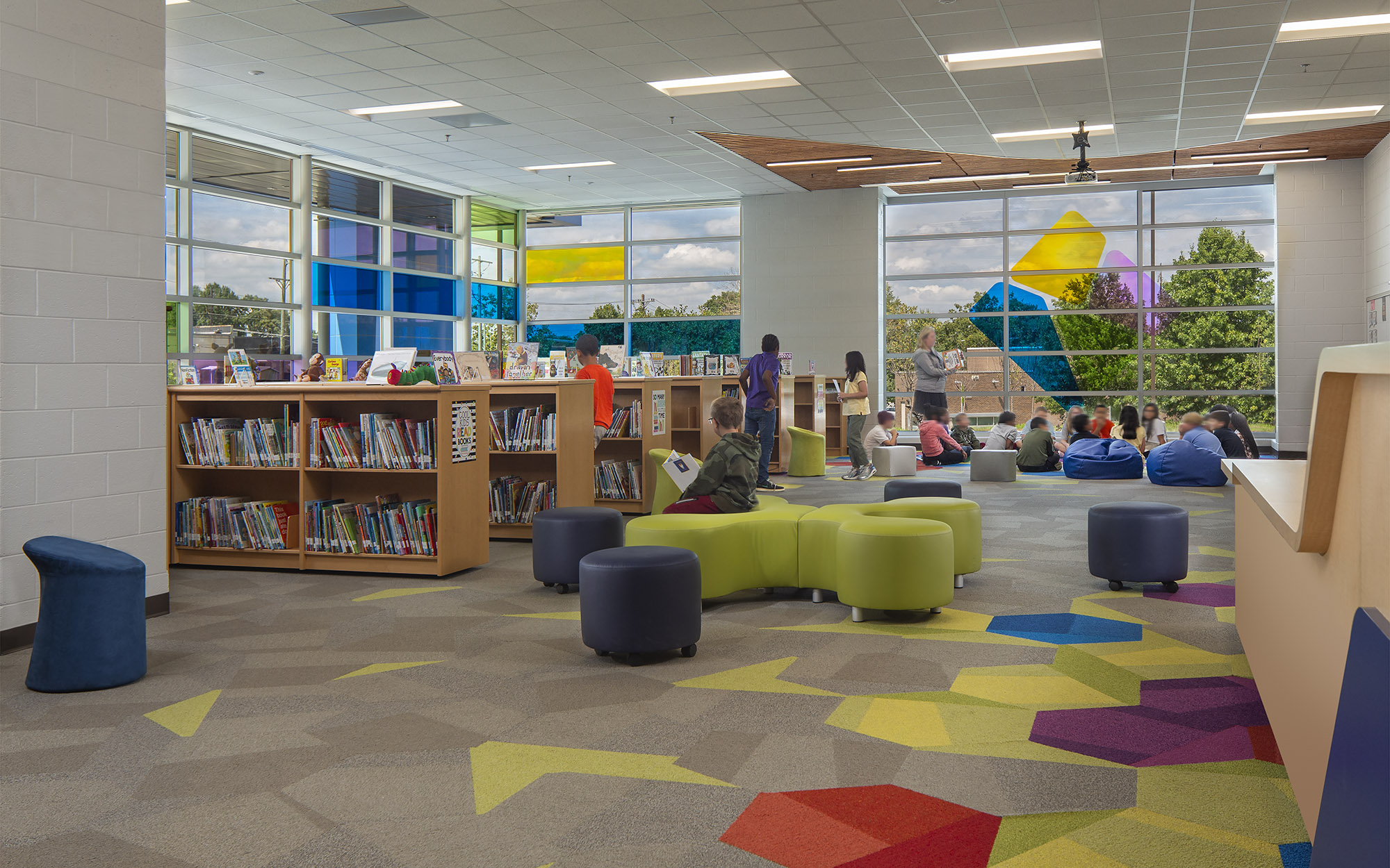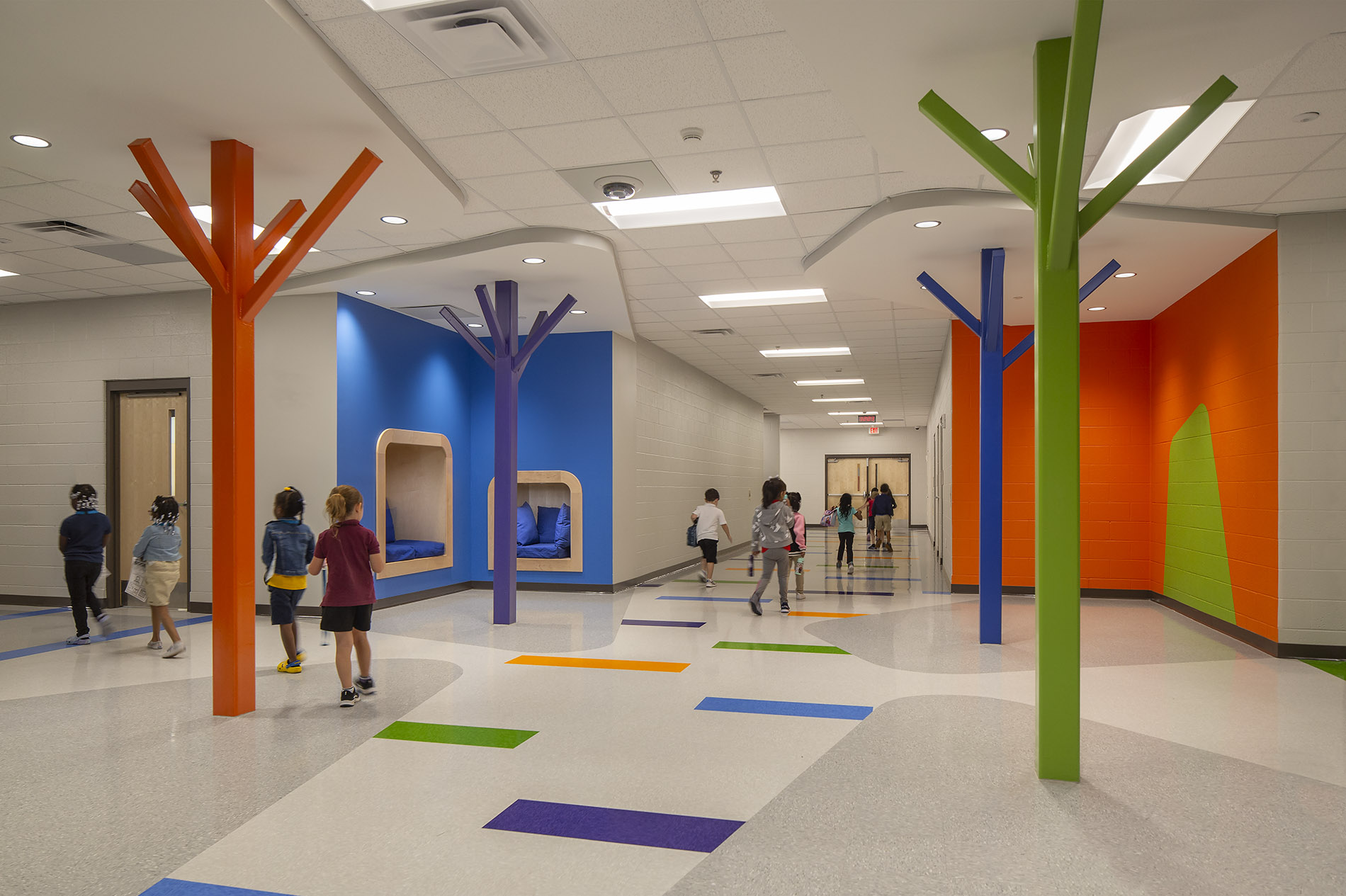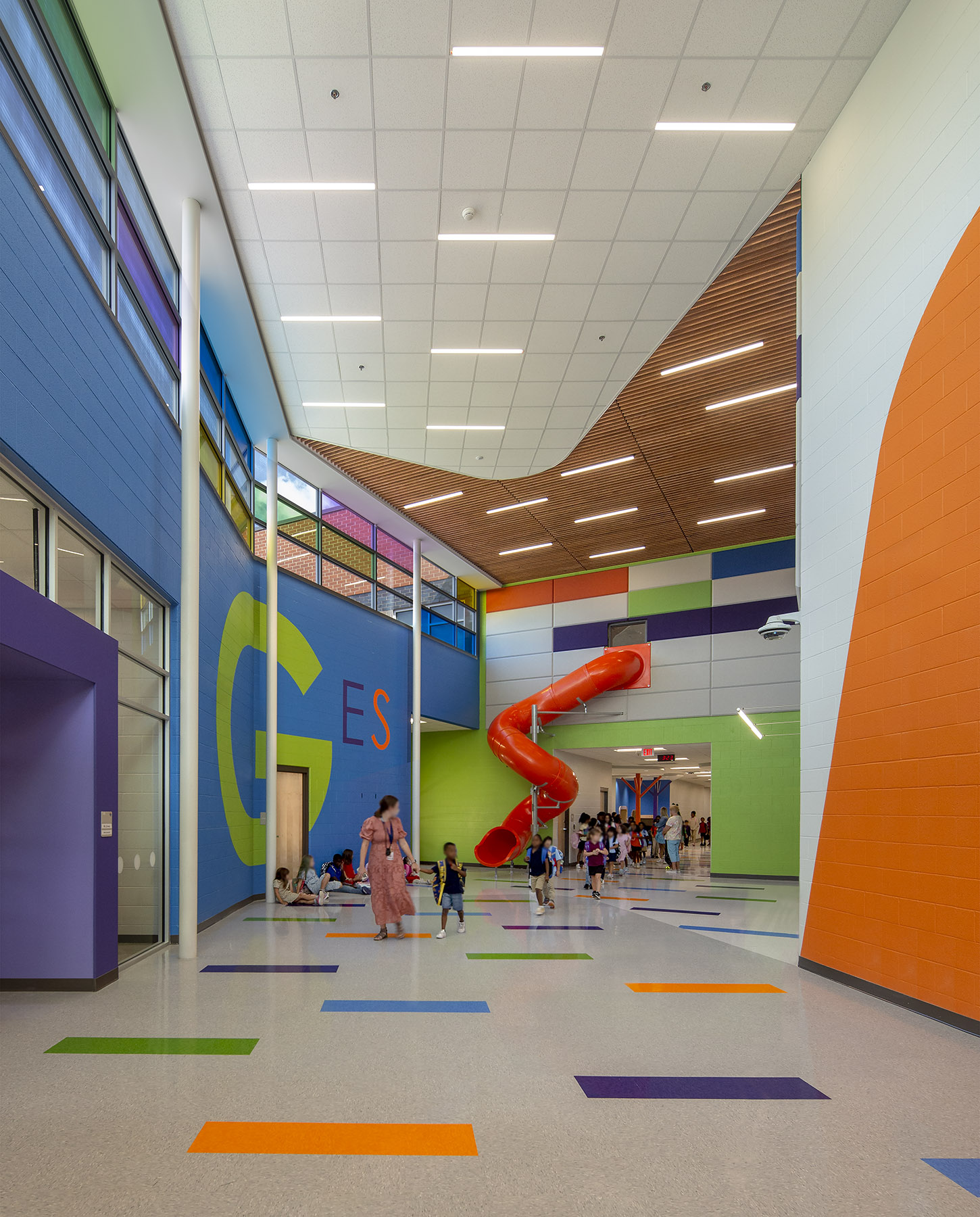 The design team, in conjunction with the school, prioritized exceptional design as the standard for the project, marrying important features on both the exterior and the interior of the facility. The colorful and sophisticated use of metal panels, brick selections and graphics on the exterior display that this is a vibrant elementary school, a fun place to learn and teach, and an important work of architecture for the school district. A slide within the main lobby, spiraling from the second level to the main level, is a design feature first-stated as important by the principal and school leaders. Used for special student behavior or achievement and special occasions, this element is one of many in the facility that expresses the special nature of the learning environment at GES. Within the media center, throughout the corridor system, and in multiple exterior garden locations, special education needs are met in sensory experiences. Use of color is carefully and strategically woven throughout the interior and exterior of the building.