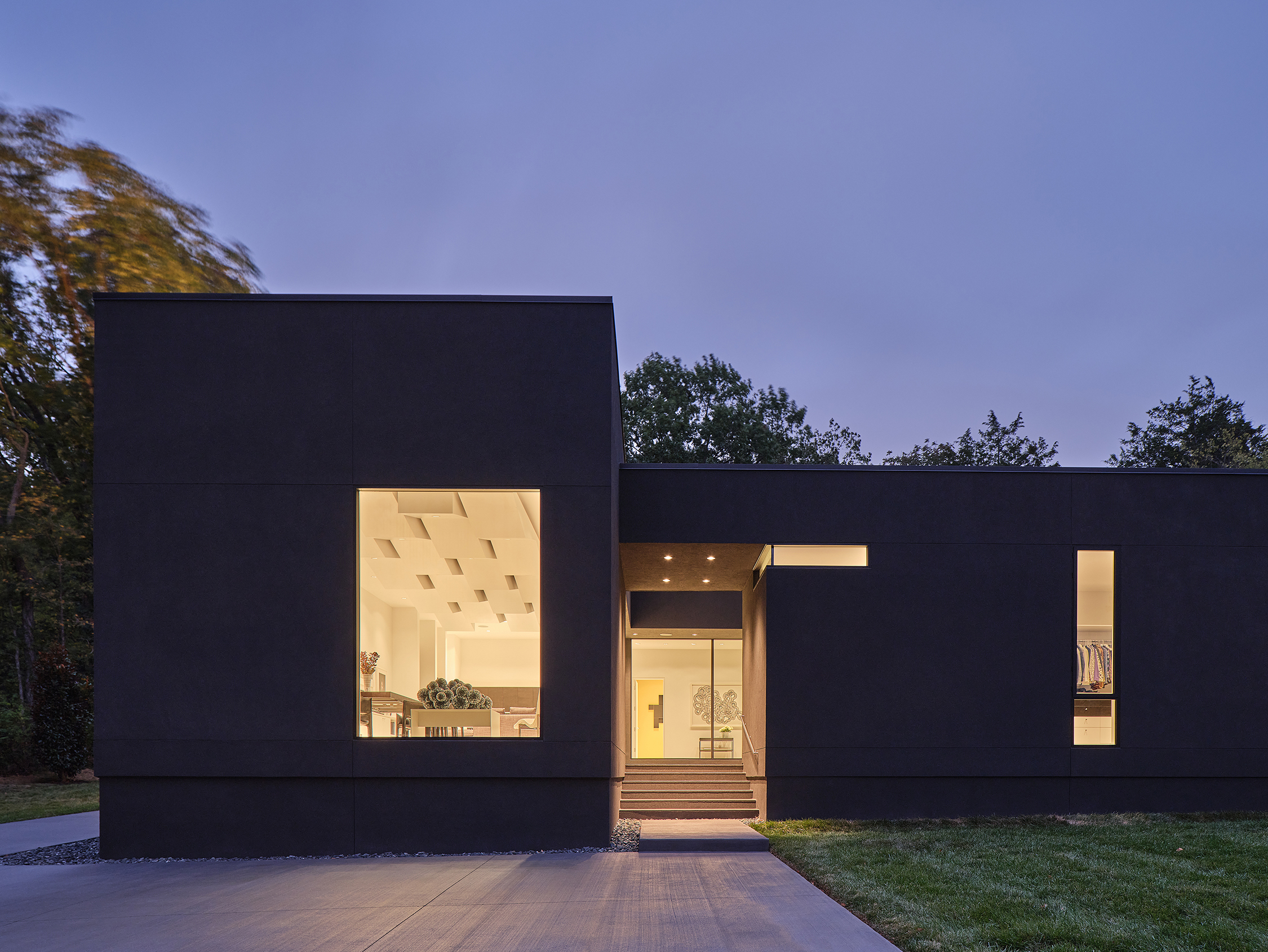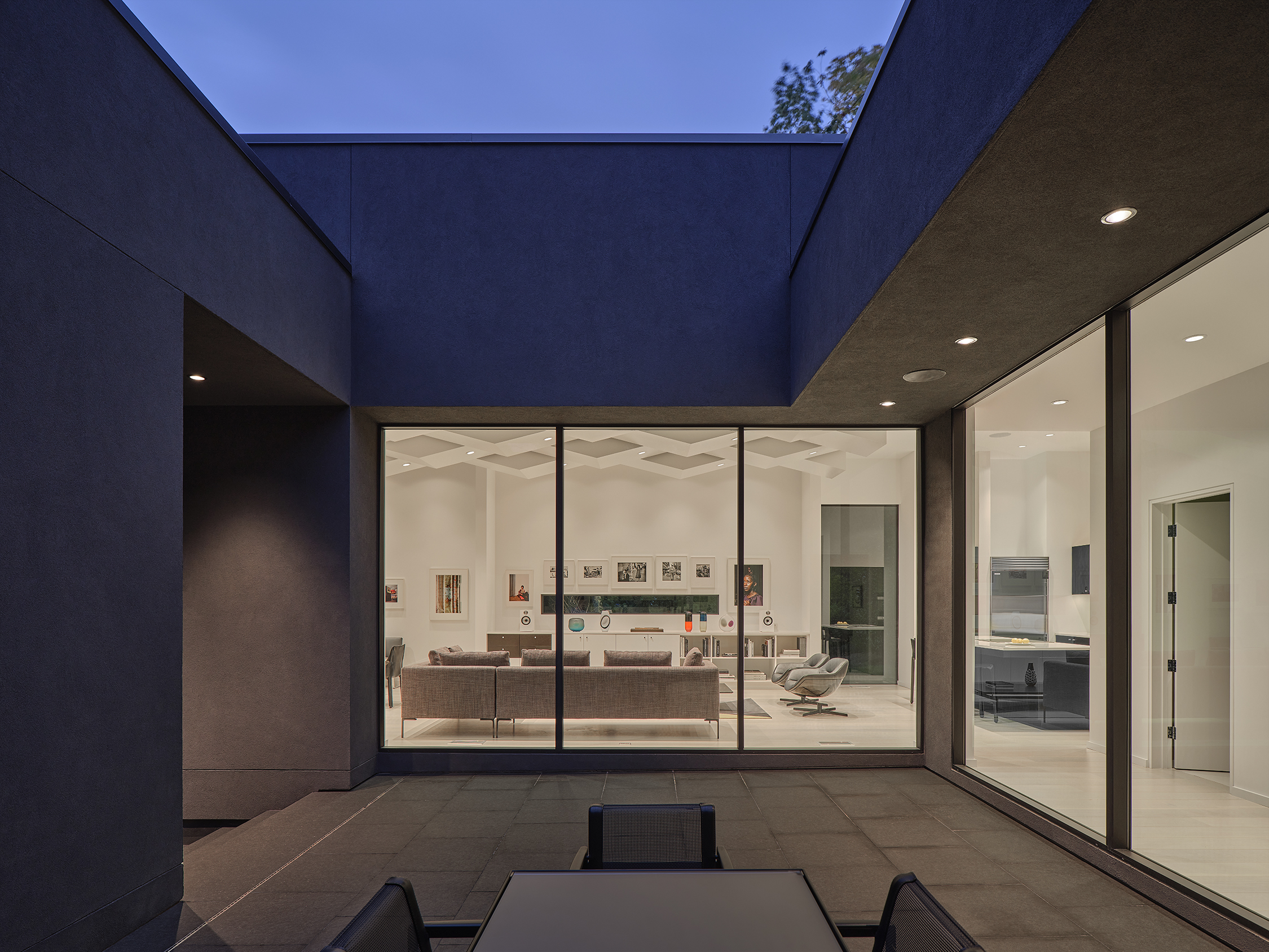 The house is clad with a dark anthracite colored concrete stucco. The windows are floor to ceiling black anodized aluminum frames. The enclosed outdoor courtyard floor is a flamed black granite. The perimeter of the courtyard is glazed, allowing for expansive interior views of the lower floor.
