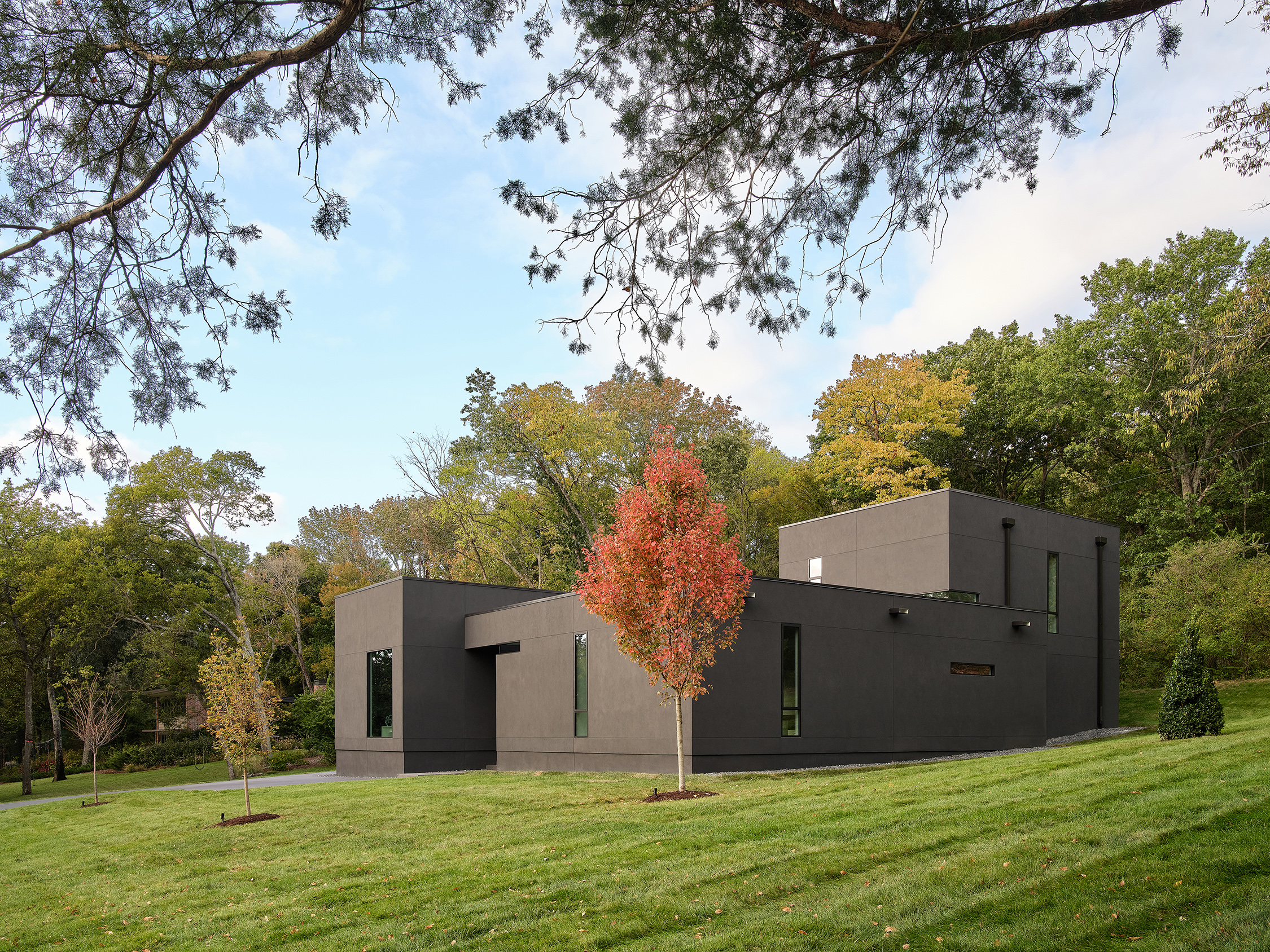 The residence is situated on a beautiful one acre sloping site in the neighborhood of Green Hills in Nashville, TN. This project was designed as a set of cubic volumes arranged around an outdoor courtyard. The 3400 square foot home functions as a backdrop for the owner’s extensive collection of photography and minimalist art. The program allows the owners to live on the ground floor with two guest bedrooms on the second level.