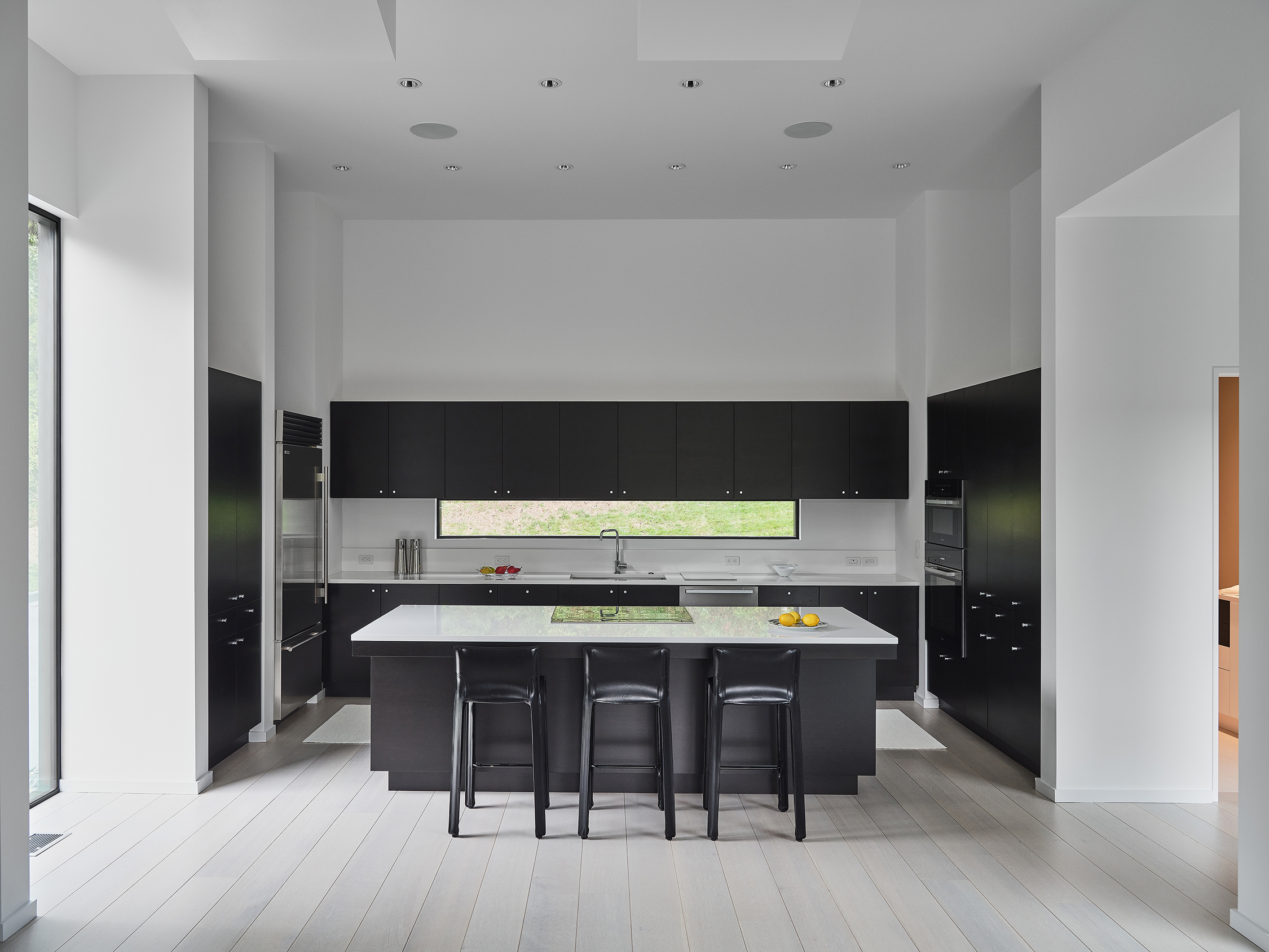 The cabinets in the house are finished with a white conversion varnish with Wenge veneer accents. The kitchen was designed with a blackened Wenge veneer and white Cambria counter tops. The all-electric house features high efficiency mechanical systems and kitchen appliances.