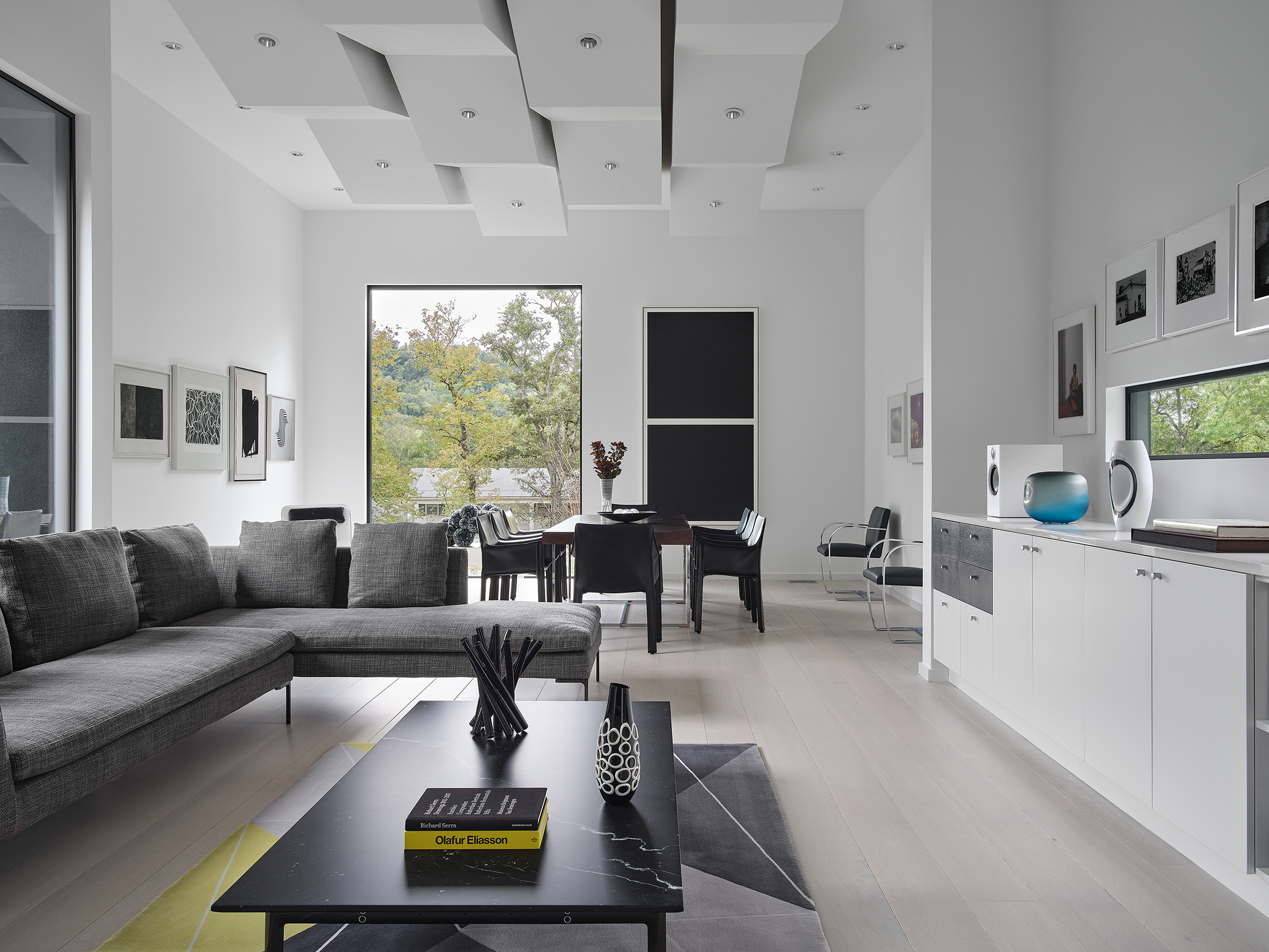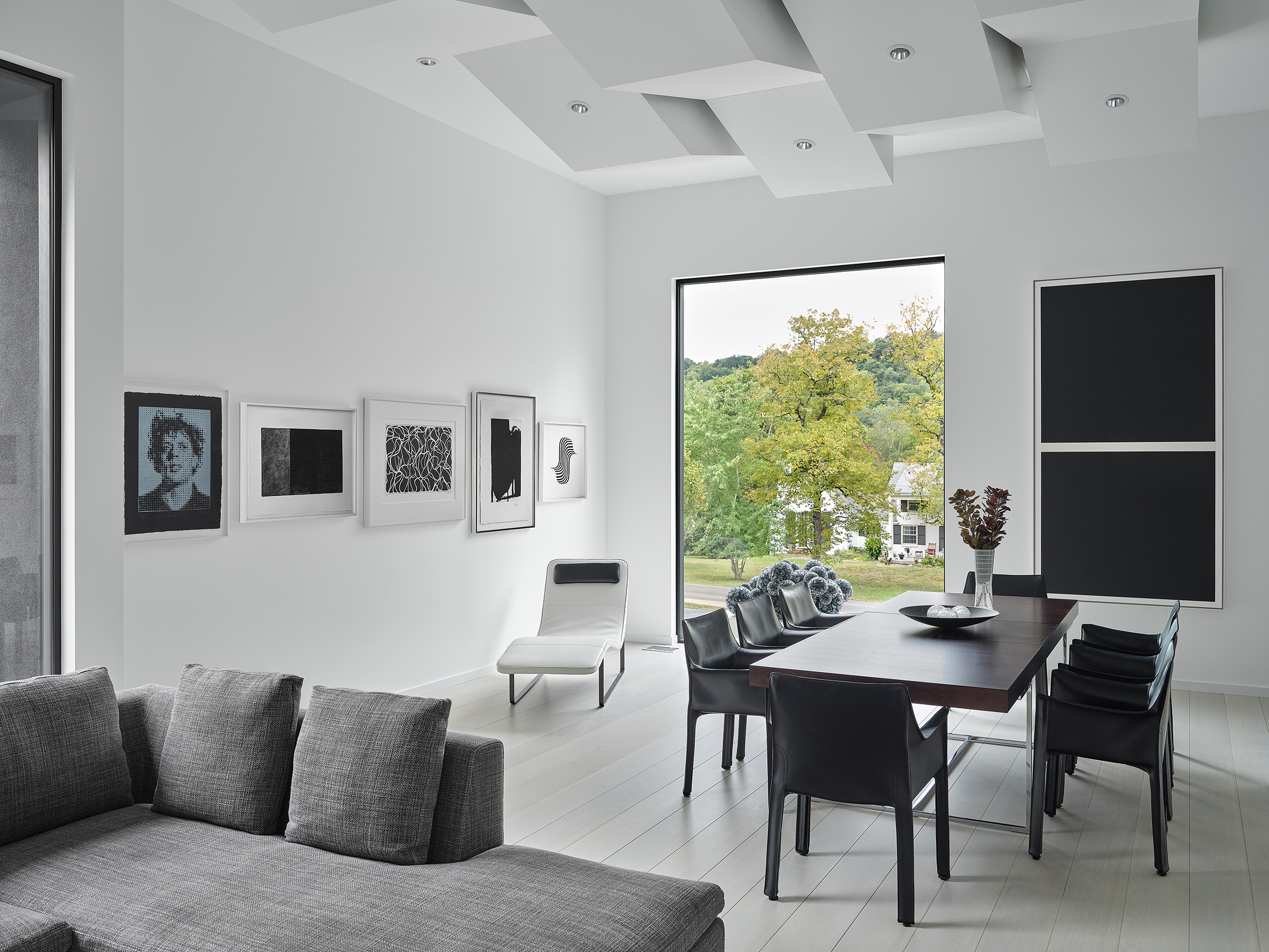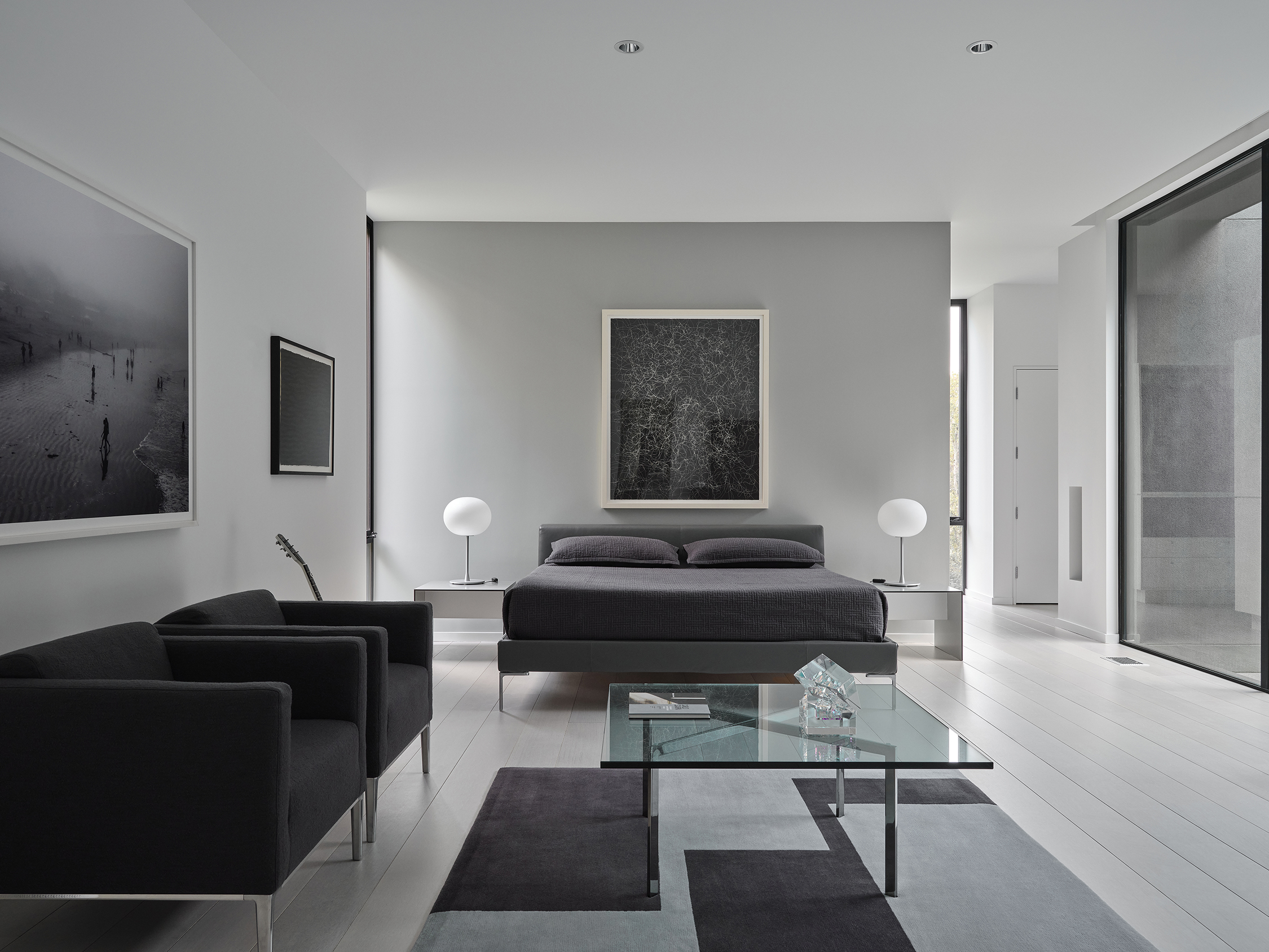 collection. The furniture and fabrics were selected in a range of silvery grays and muted blacks. The monochromatic material palette highlights the color in the artwork and glass