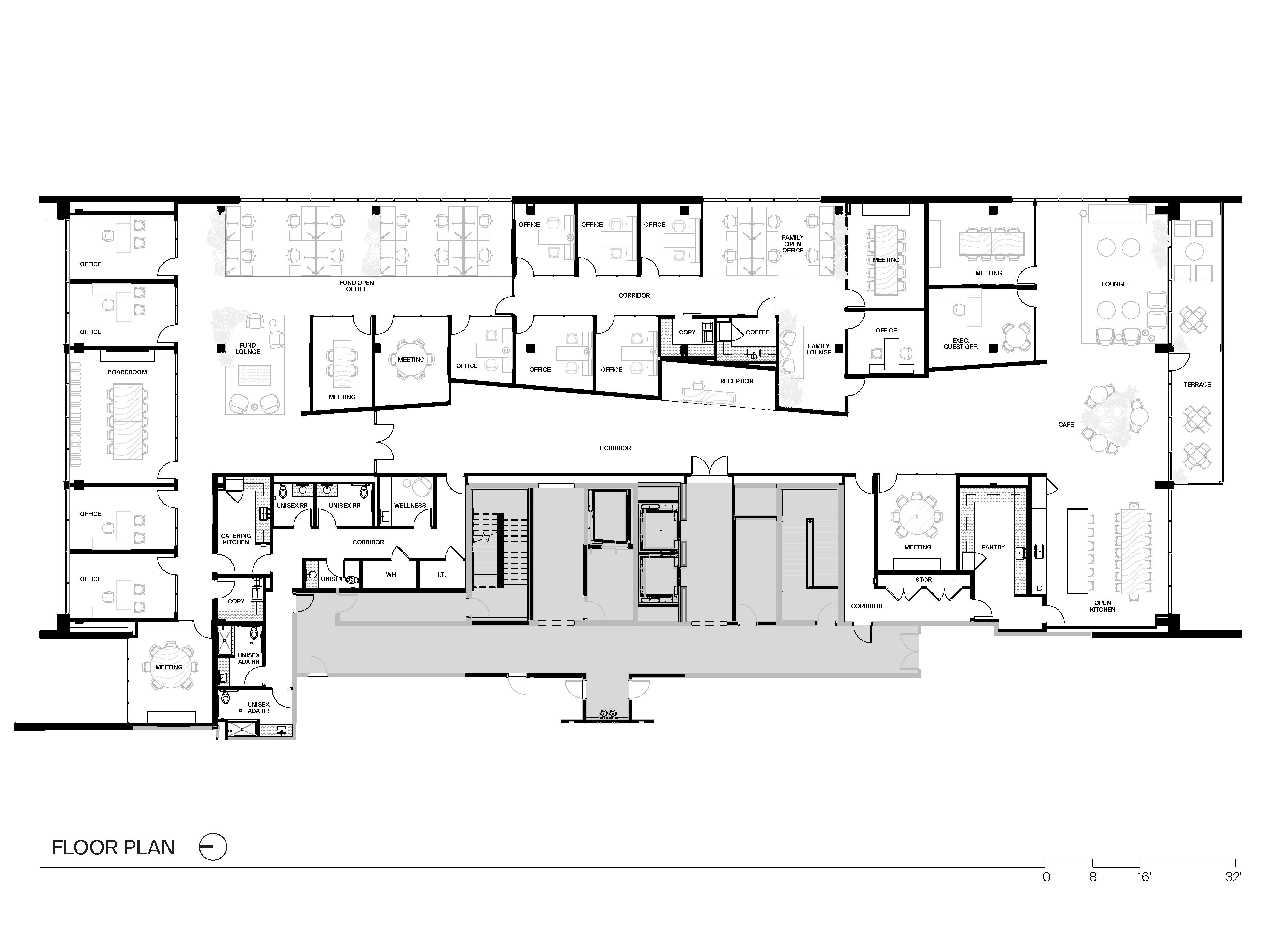 3. Design for Discovery: This project is uniquely positioned within a broader context bookended by the recent completion of another space within the same building and a forthcoming project on the mirrored half of the floor plate. As such, it served as both a culmination of prior knowledge and a testing ground for future work. Lessons learned from the earlier phase were instrumental during site selection and coordination, providing a valuable foundation for addressing the opportunities and challenges inherent to the mass timber structure. One of the primary design challenges was navigating the sheer scale of the space created by the dramatic pitched roof. Establishing a sense of human scale within this volume requires deliberate architectural gestures and informed the evolving strategies for the future adjacent project. Continued engagement with the nuances of designing within a mass timber structure, both technical and spatial, deepened the team’s expertise and informed each subsequent decision. The experience of space itself is one of layered discovery. Upon entry, users are first greeted by a smaller-scale stone-clad niche, a moment of intimacy and grounding. From there, the plan opens dramatically, revealing expansive volumes of light and air framed by the soaring, exposed wood ceilings. This deliberate progression, from compression to release, creates a dynamic spatial journey, encouraging exploration while emphasizing the architectural qualities of the structure itself.