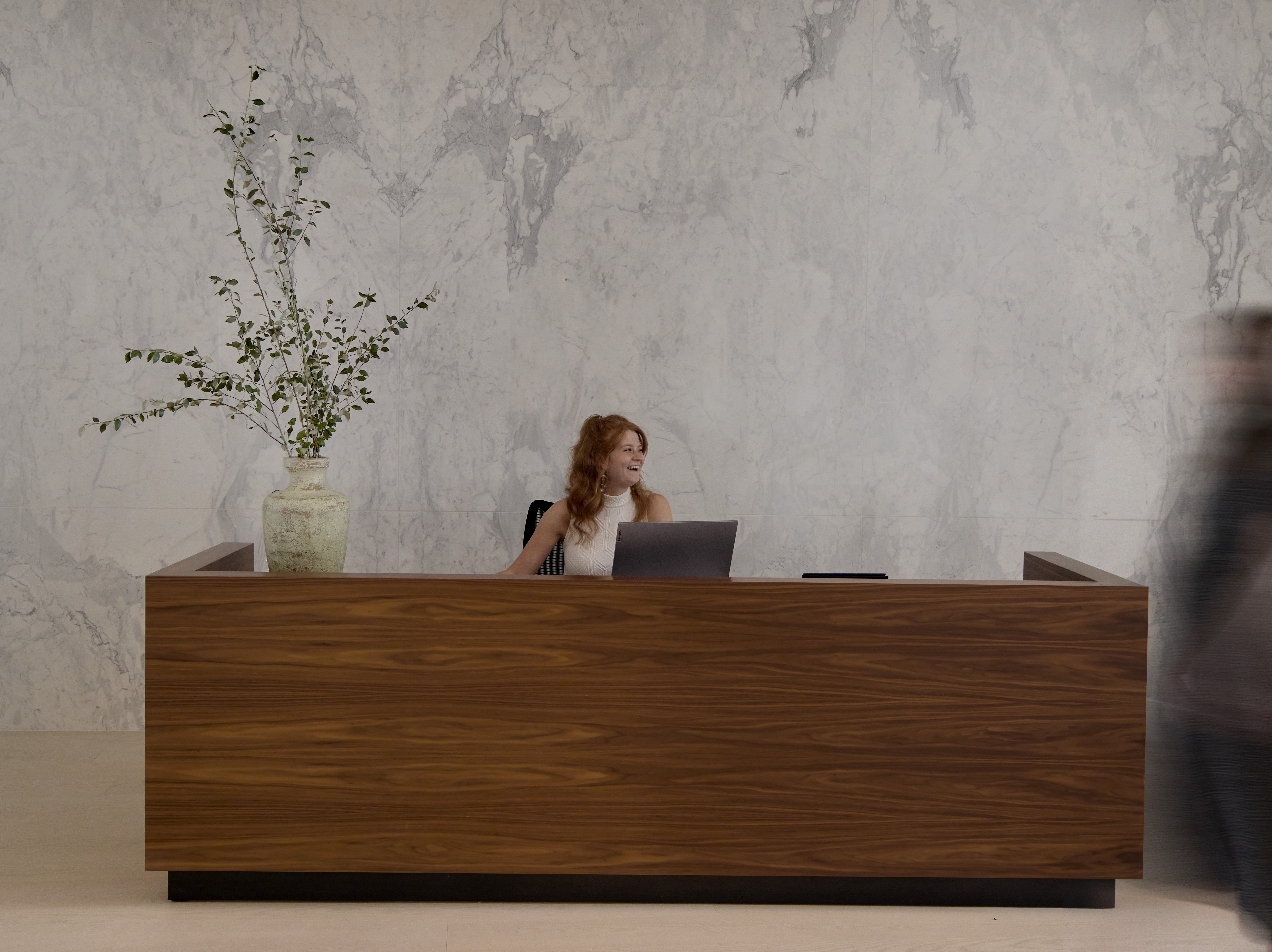 1. The custom reception desk sits in a niche encased in floor to ceiling stone