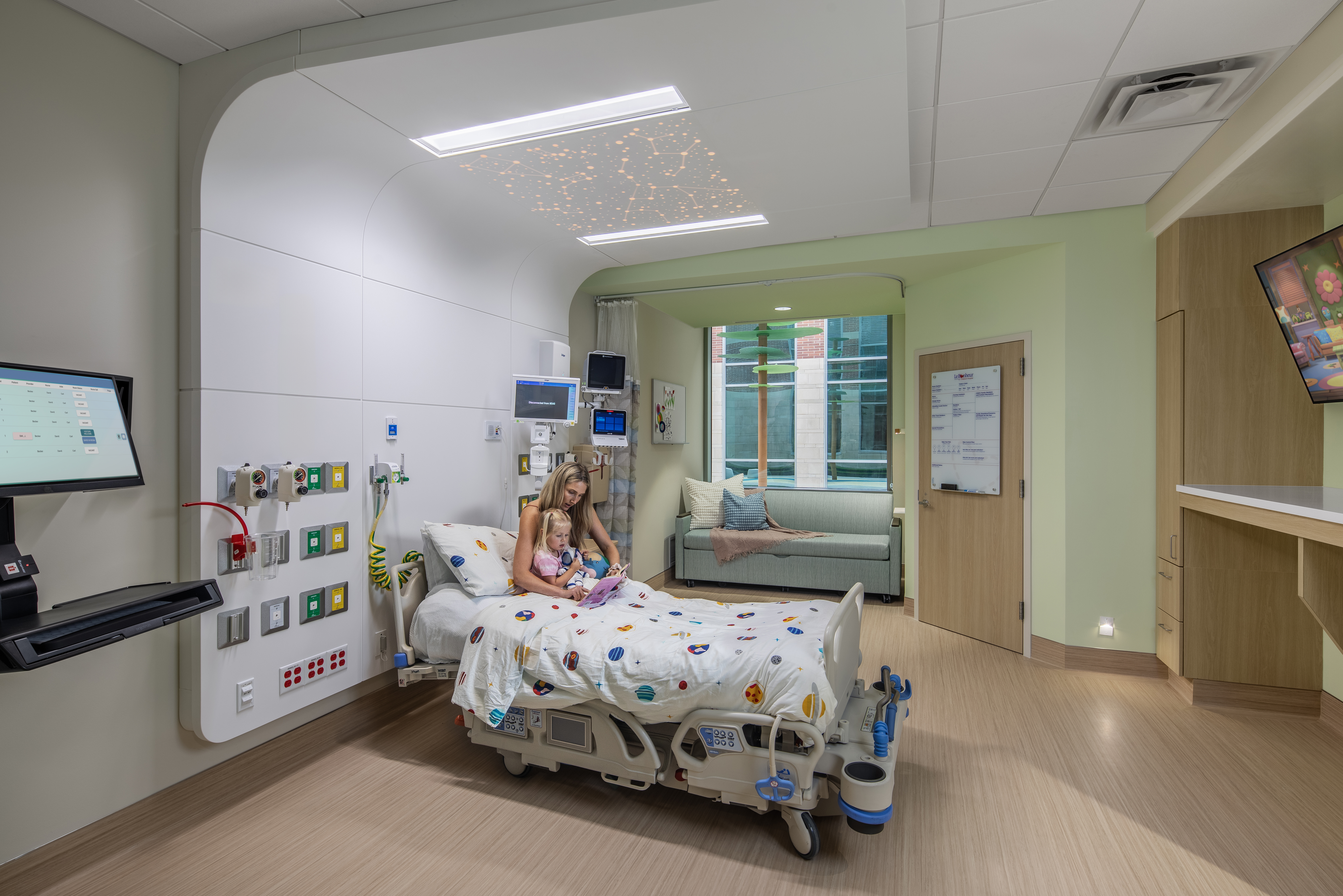 - Discovery: Creating positive distractions through calming sensory experiences, such as light and sound, help promote healing without negatively impacting operations or quality of care. Beyond the whimsy of the central courtyard, the patient headwalls include constellation patterns overhead to carry that playfulness and need for patient distraction indoors. Patients have the ability to customize the colors of their "stars" above and the durability of the solid surface headwalls will aid in the longevity of these high-use spaces.