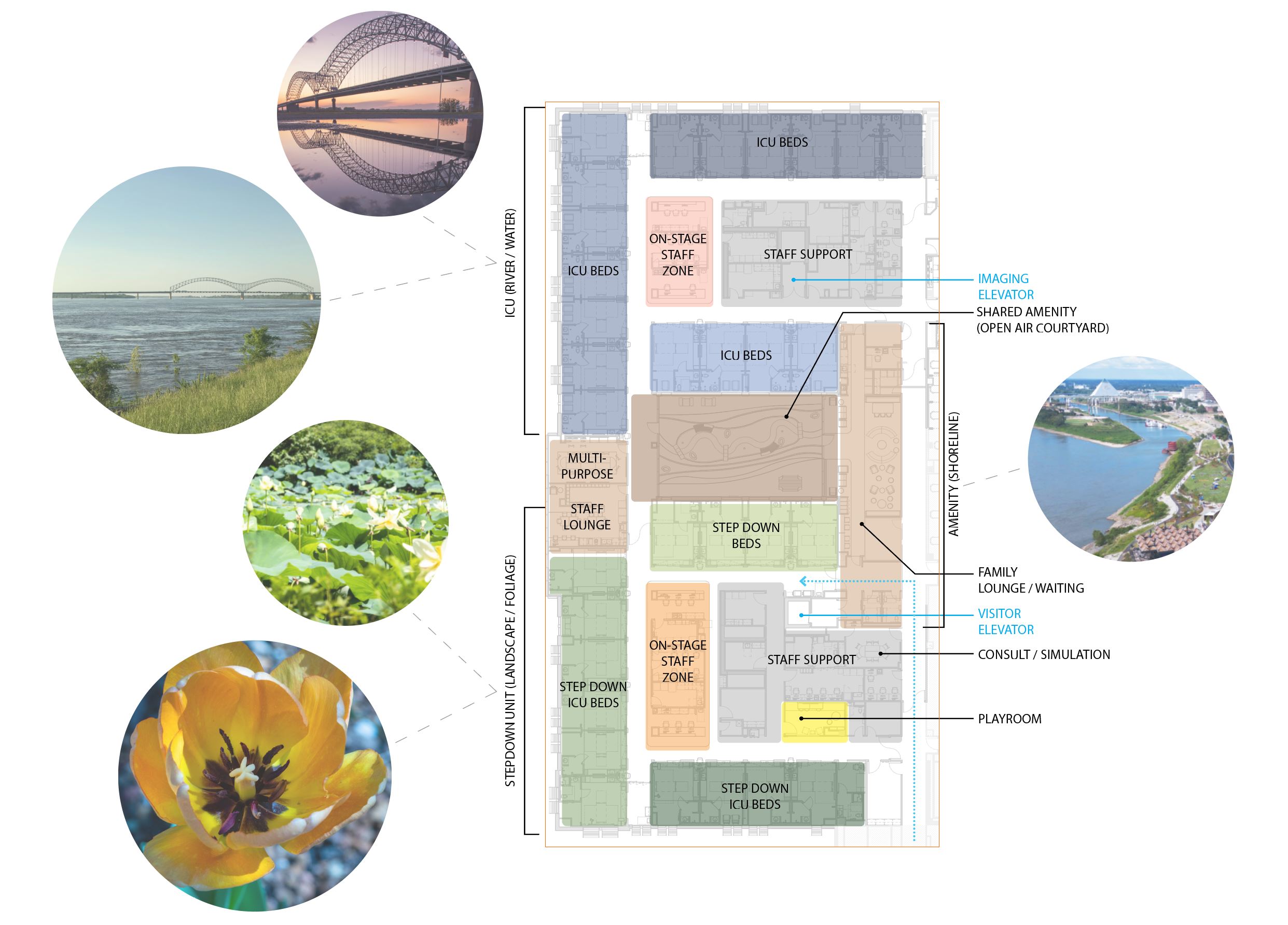 - 10: The CVICU is divided into two units--the ICU and Stepdown. The ICU draws inspiration from the waters of the Mississippi River, whereas, the stepdown unit features a range of greens inspired by local parks and native flora.