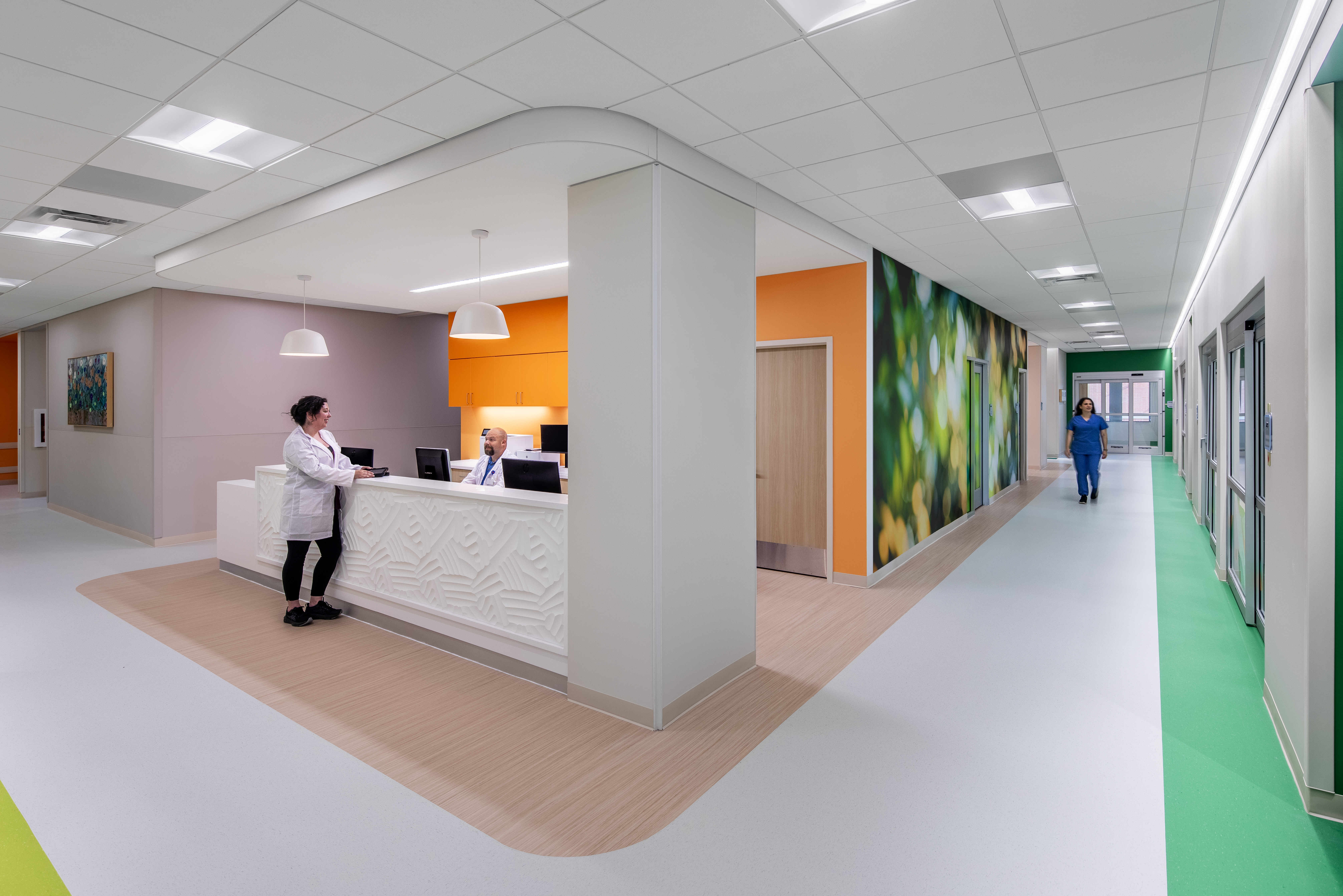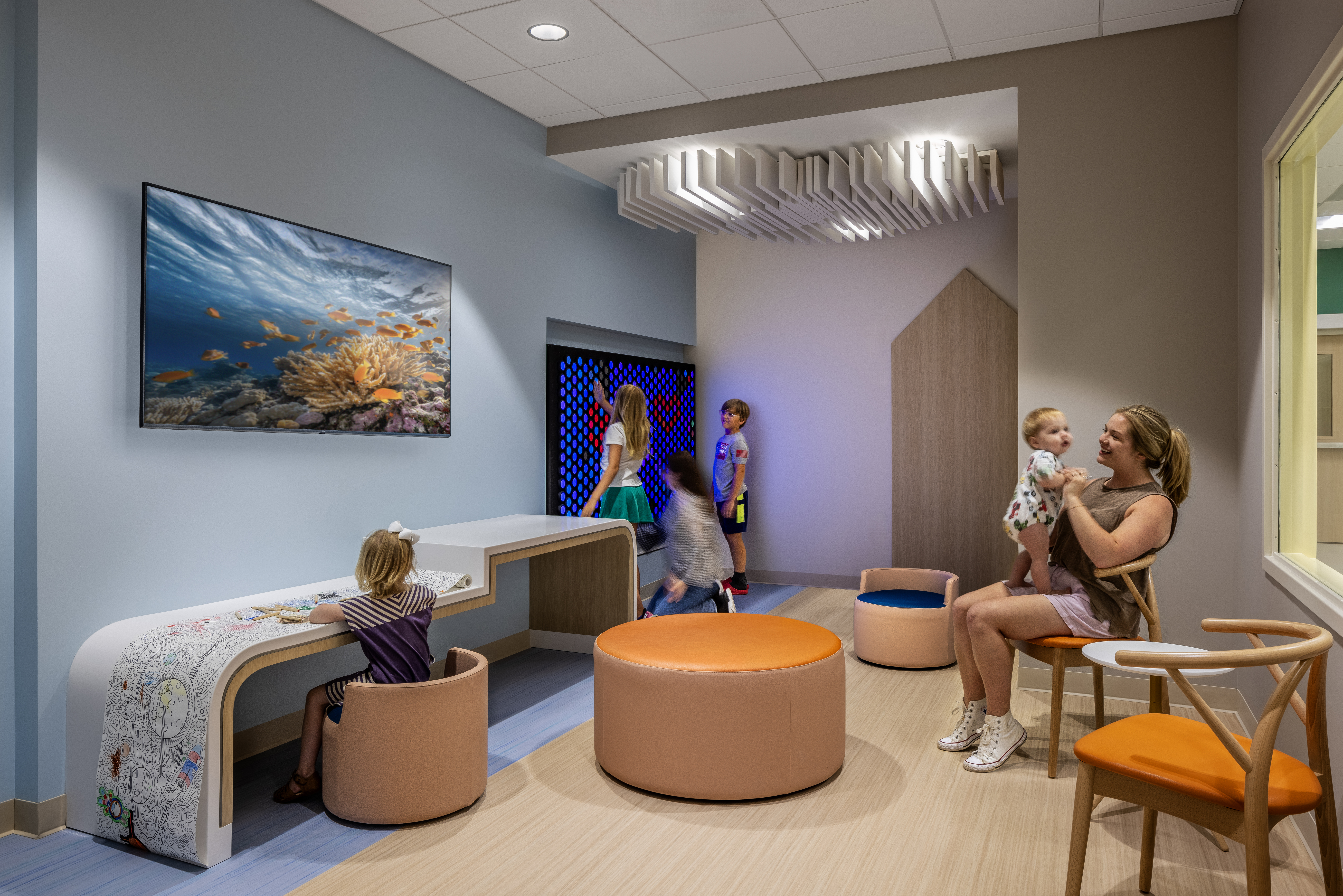 Interior solutions modernized the expansion while looking towards the future. Pediatric care can range from newborns upward to early 20’s. Designing for this full spectrum of ages was at the forefront of the minds of the team—aiming to create a space that was energetic yet calming, youthful yet mature.