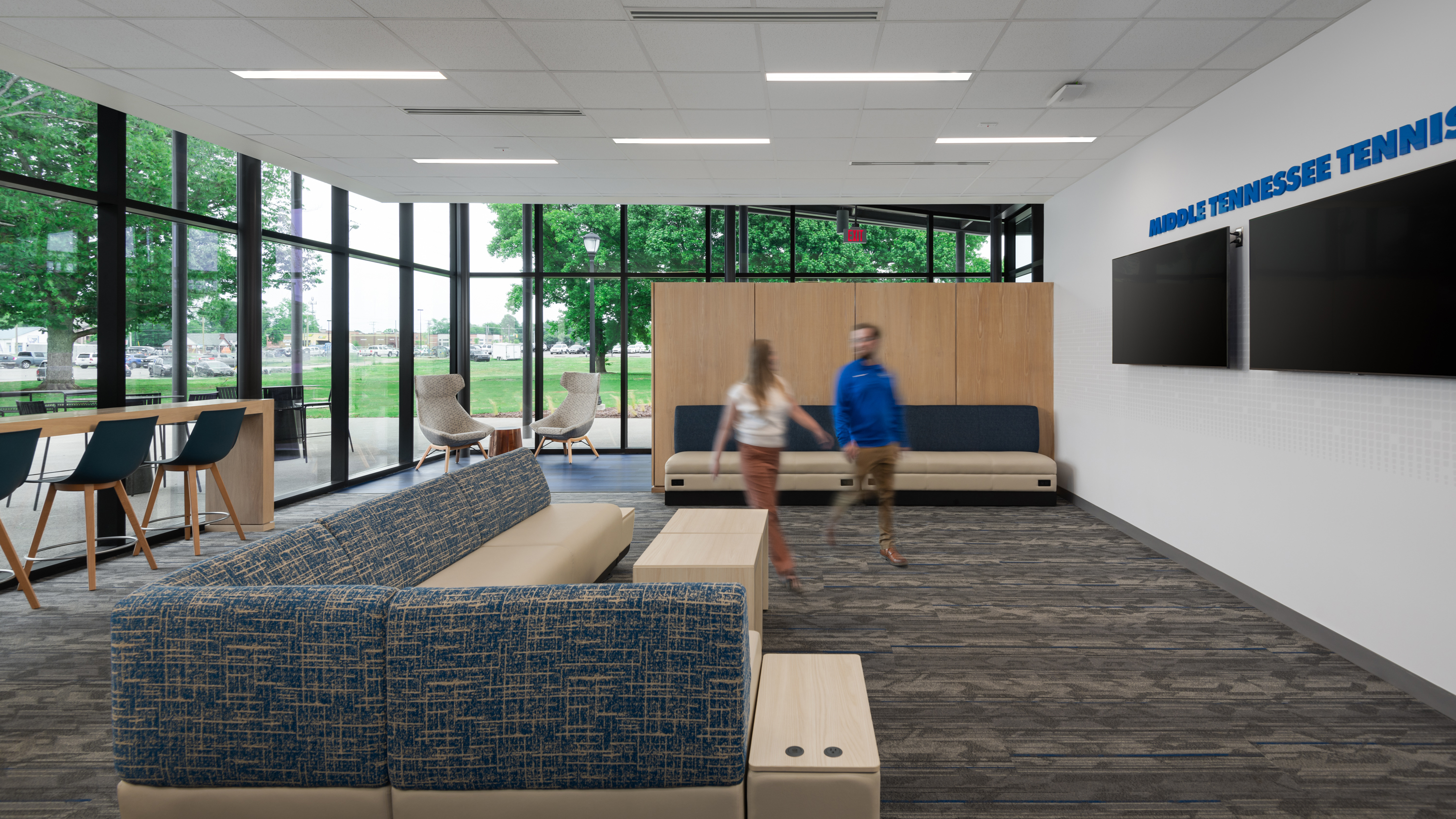 Interiors 2- Modern, brightly lit lounge, featuring the MTSU logo on a prominent wall
