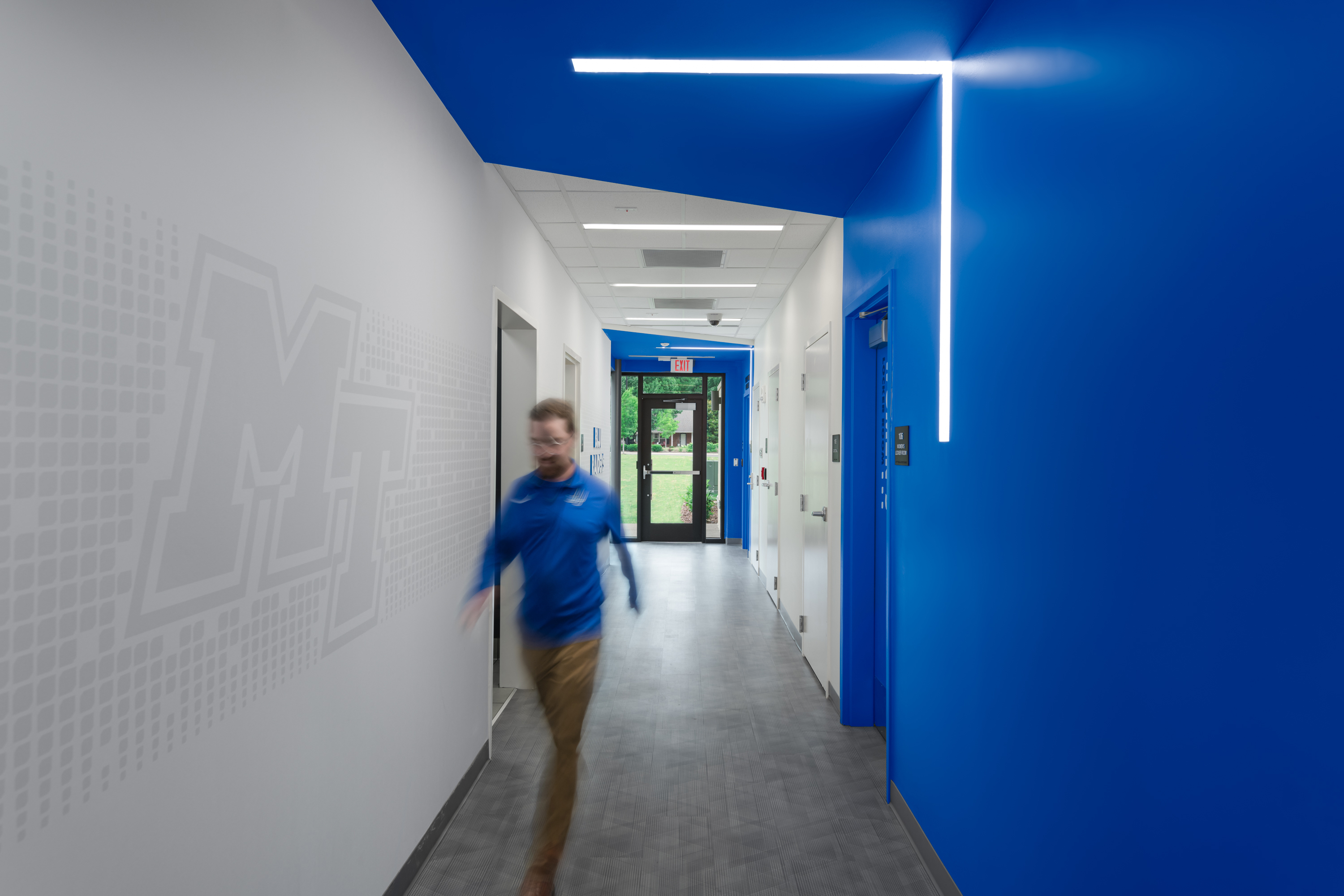 A major challenge point for the site was the pre-existing electrical service. Most collegiate campus sites will have provisions for 3-phase power, or the budget to bring it to the site. For this project, it was an unexpected cost on the behalf of the owner. The design team was able to strategically pivot to re-orient the mechanical systems toward the single phase power currently on the site and coordinate its impacts on the building interior. This quick pivot in design alleviated a potential stalling point for the project, and delivered a thoughtful solution for MTSU.