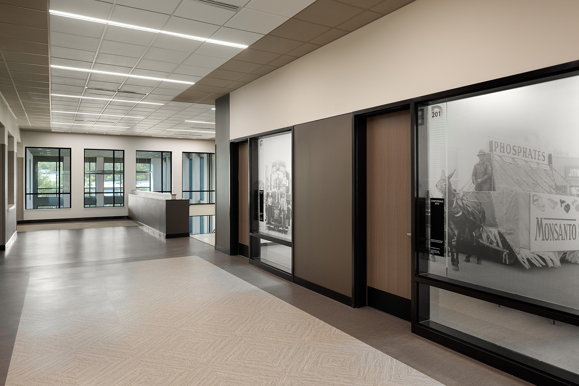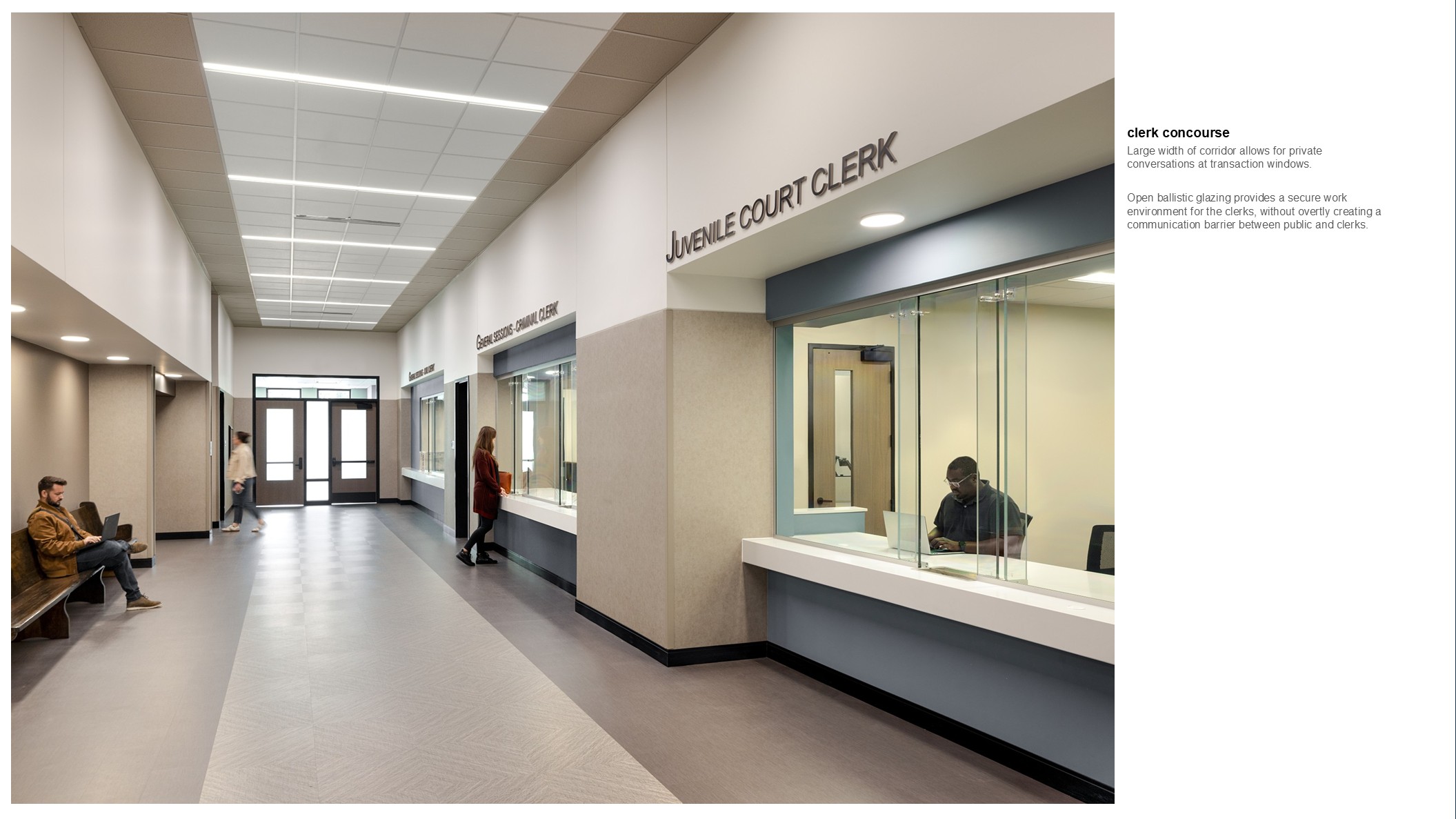 The elongated public concourse terminates in expansive glazing, daylighting the circulation and waiting areas. Flanking the concourse on both floors are entry vestibules to courtrooms along with a series of private meeting rooms, allowing opportunities for impromptu family and legal discussions. The broad glass fronts of these rooms feature historic photography on translucent film, providing the glow of soft, shared lighting while affording privacy. The court clerks are given modern work areas which offer safe methods of public interaction and contemporary document management systems.