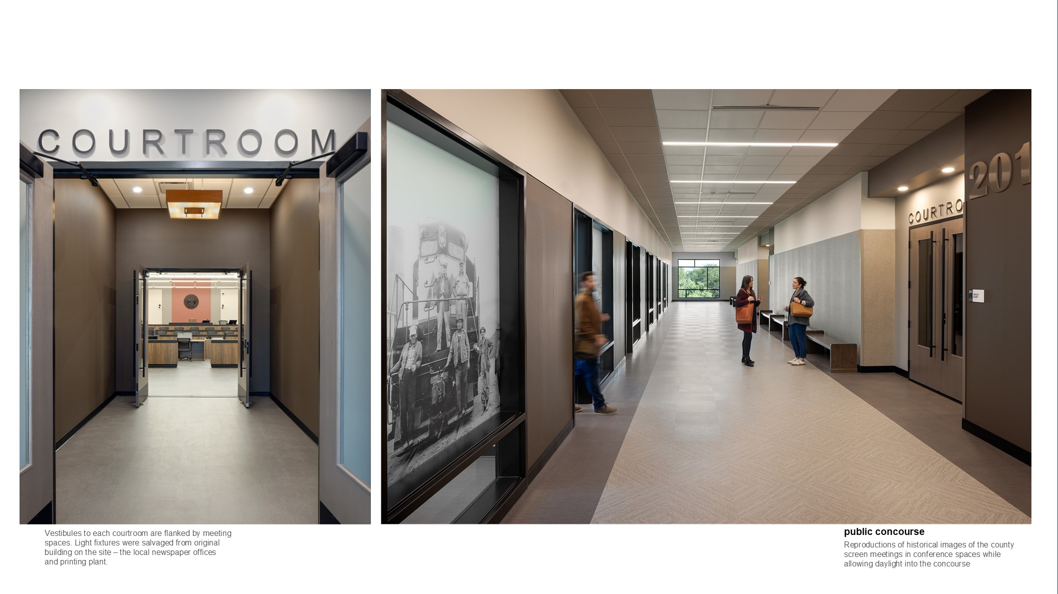 **Design for Integration:** The building reflects a cohesive vision shaped through close collaboration with county officials, court staff, and community stakeholders. Materials such as brick and limestone connect the new structure to its historic context, while salvaged light fixtures and historic image graphics embed local memory into daily function. The 58,000 SF layout aligns programmatic goals with spatial clarity. Courtrooms are flanked by meeting spaces, and circulation is intuitive, minimizing stress for first-time visitors. The result is a building that unifies form and purpose, balancing civic presence with practical need.