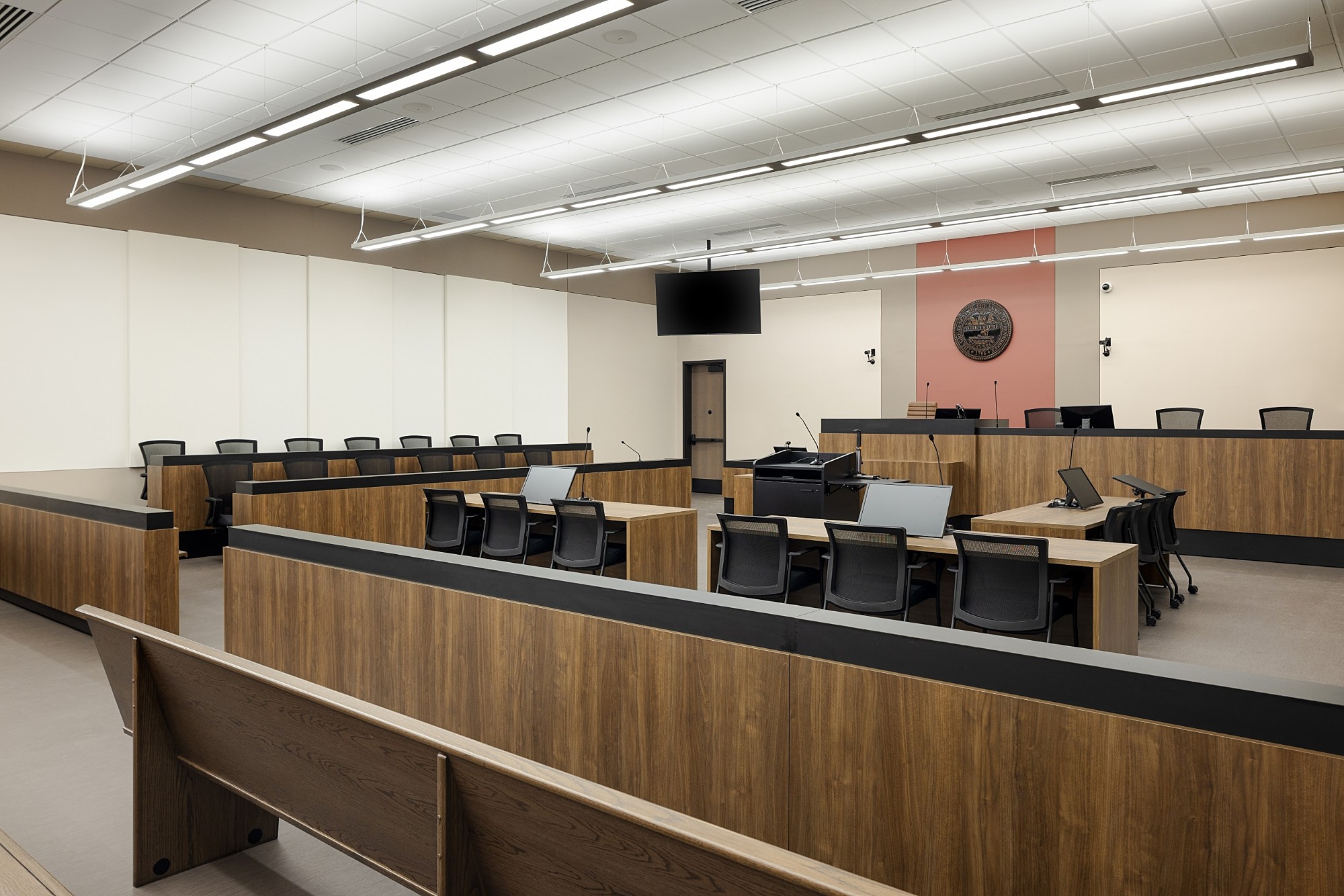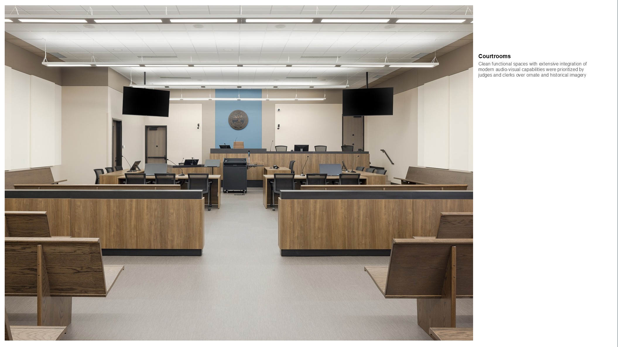The 6 courtrooms provide Juvenile, Chancery, General Sessions, and Circuit Court functions. They are dispersed on the main and upper floors and offer multiple configurations of interaction between legal teams, bench, witness, and jury. One configuration, known as the Virginia Revival Model, places the jury centered in priority position with the judge seated behind, reinforcing Jeffersonian democratic principles in the proceedings.