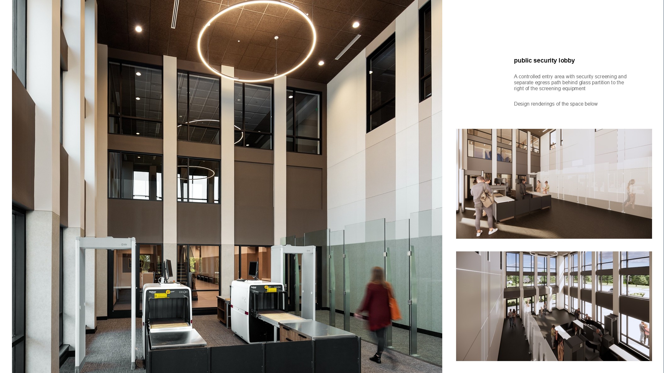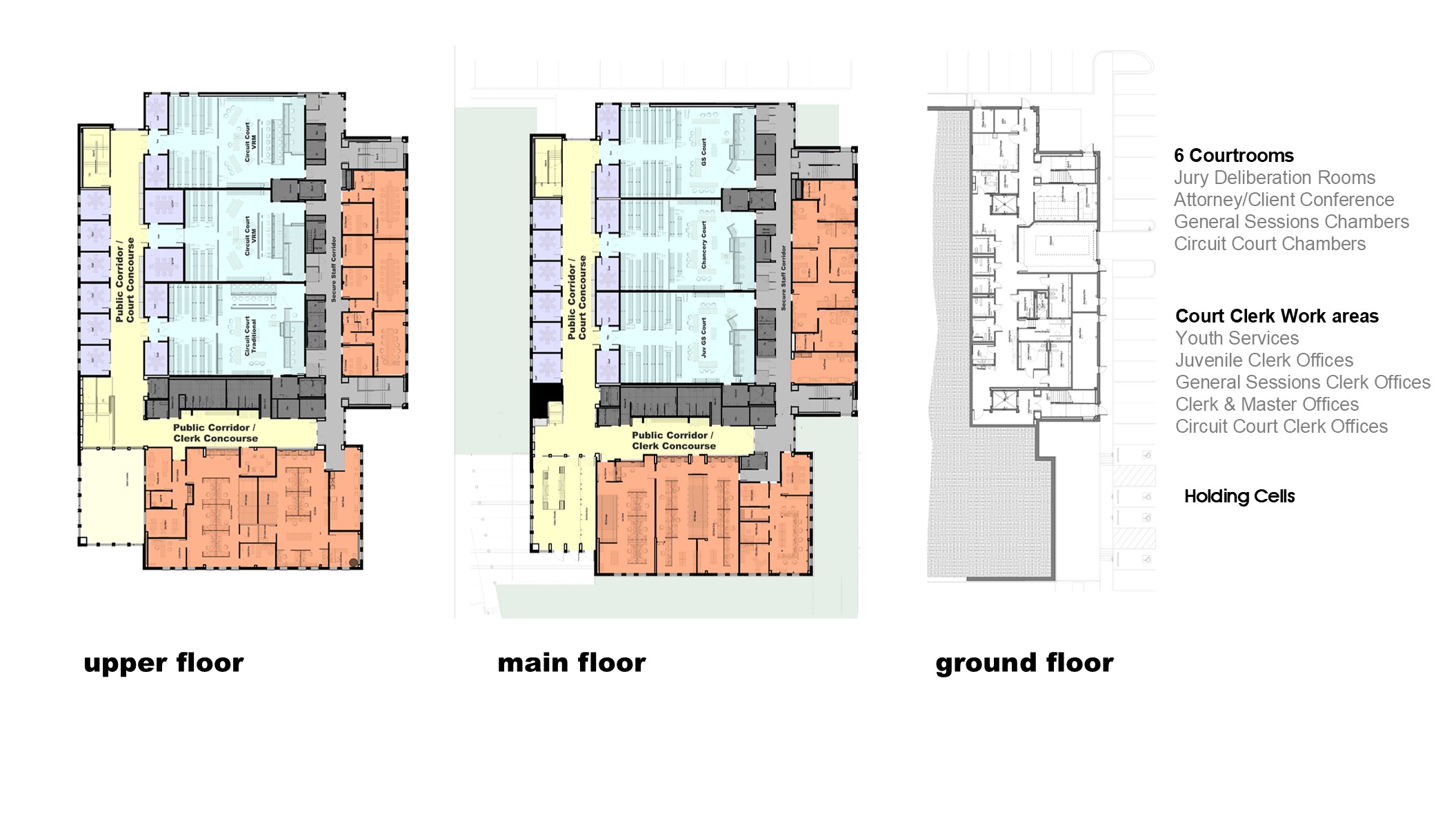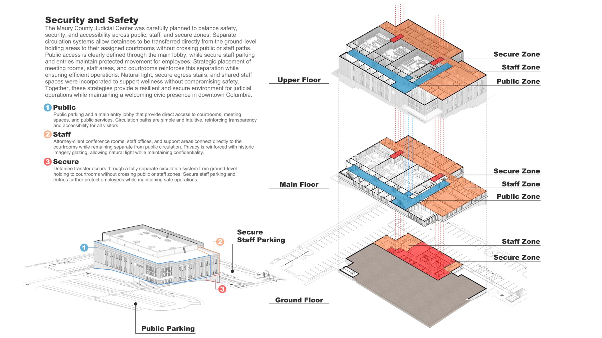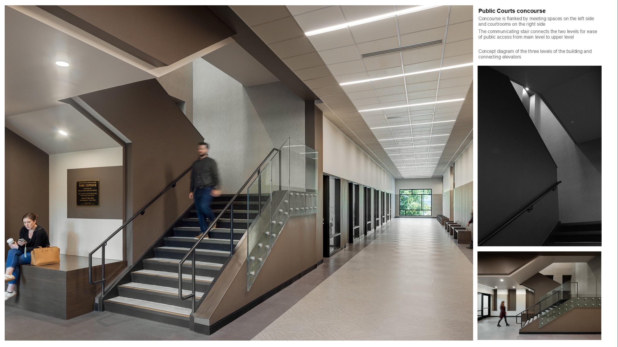 The building’s length is used to organize the site into a public entry separate from the secure zone for personnel and detainee entries. The site’s natural grading is used in turn to create a small zone below the main floor utilized for temporary detainee waiting and building equipment. This most secure zone then connects vertically at strategic courtroom access points, informing building organization around a core of courtrooms with a second secure zone for staff workspaces and jury deliberation, plus a third concourse zone for public circulation.