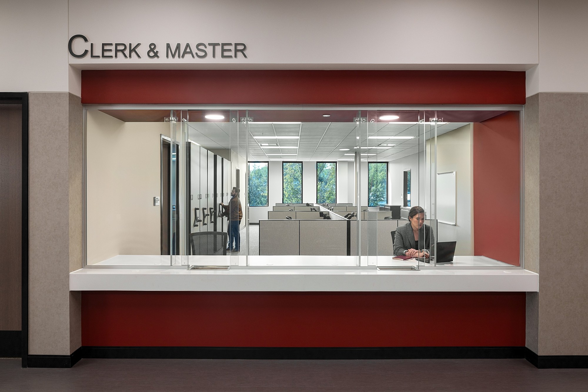 **Design for Well-Being:** Natural daylighting was a core strategy in shaping the public concourse and staff work areas. Glazing along circulation corridors and into court-adjacent meeting rooms allows daylight to filter deep into the building while maintaining privacy through translucent historical imagery. Staff break rooms on each level provide restorative zones that are visible yet tucked away, encouraging daily use. Clerks operate within a secure environment of open ballistic glazing, which preserves visibility and interaction with the public while enhancing safety and comfort.