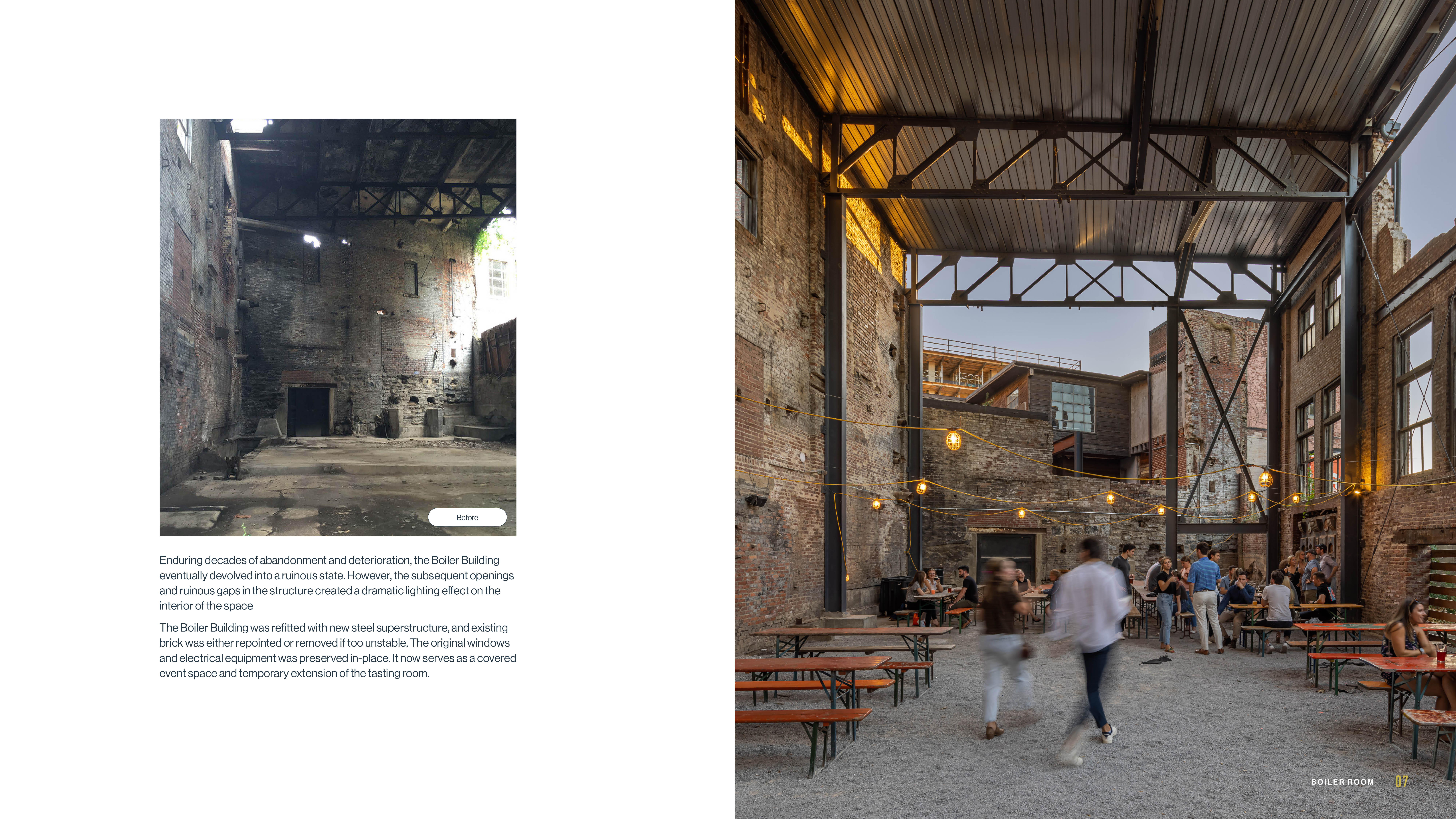 Image 8—The Boiler Building was refitted with a new steel superstructure, and the existing brick was either repointed or removed if it was too unstable. The original windows and electrical equipment were preserved in place. It now serves as a covered event space and temporary extension of the tasting room.