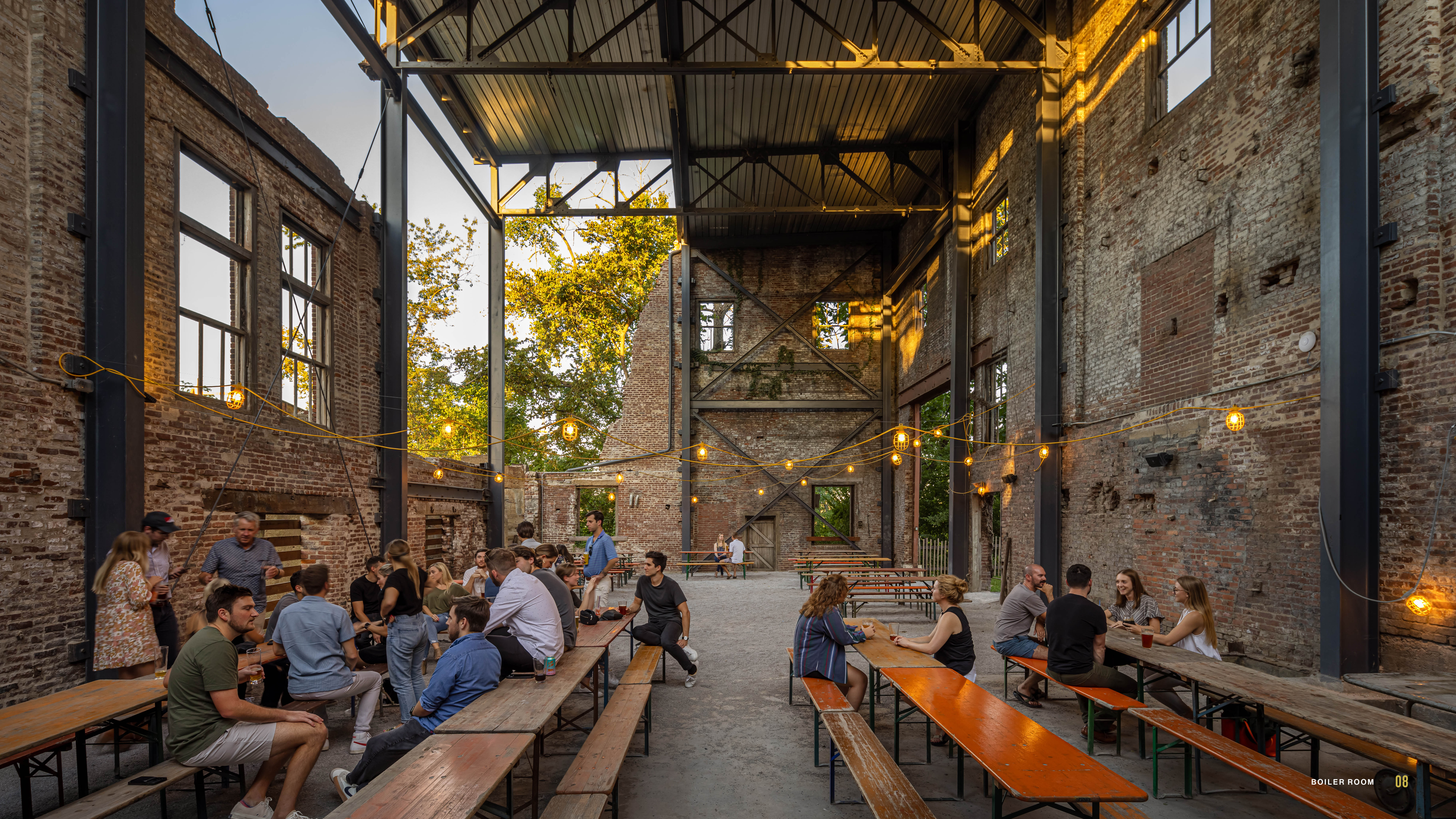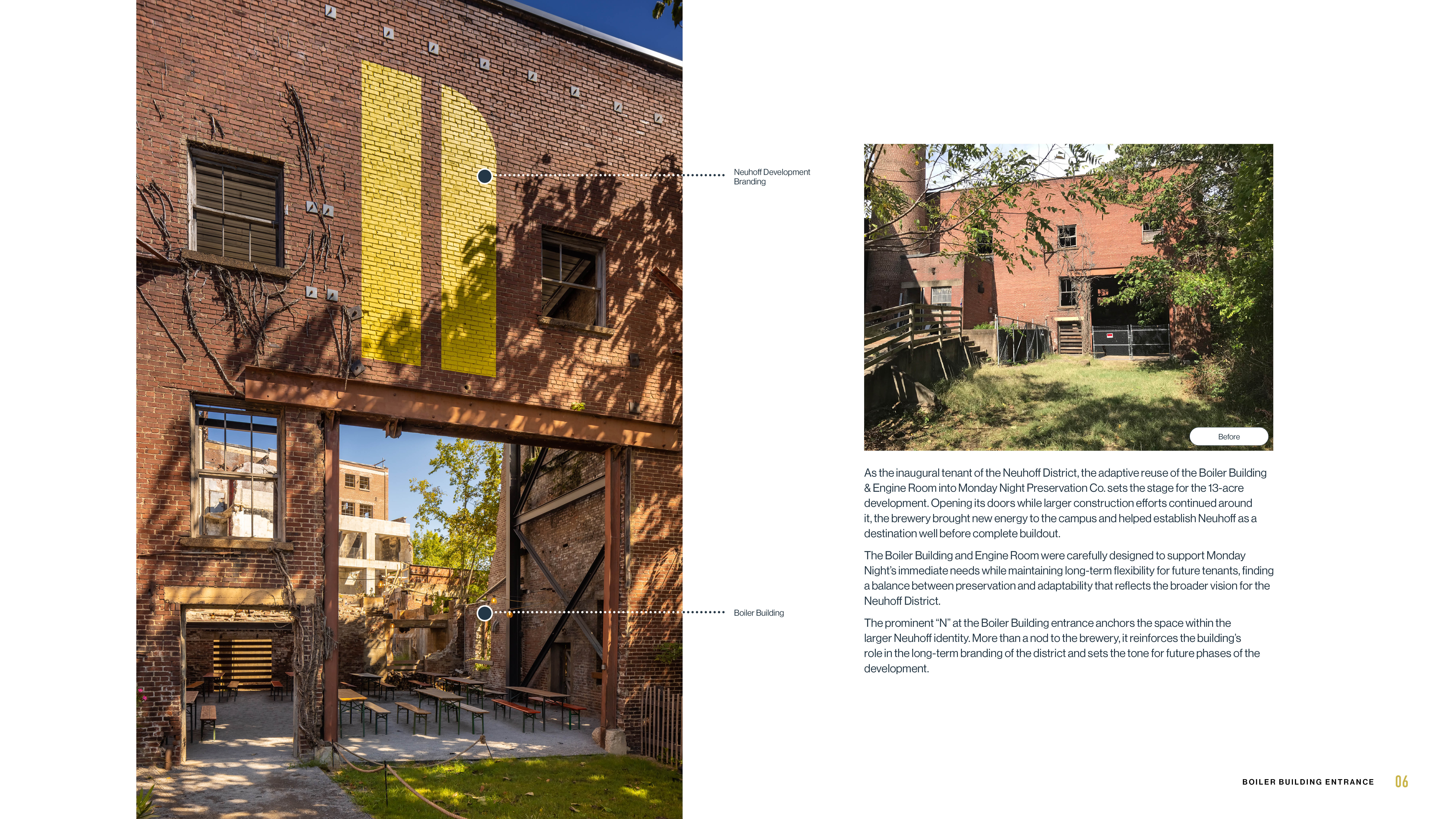 **Design for Integration** - The design of Monday Night Preservation Co. transformed a modest preservation effort into a pivotal gateway for the Neuhoff Development. For nearly three decades, locals, neighbors, and historians lobbied to preserve Neuhoff’s distinctive industrial structures. The temporary adaptation of Neuhoff’s Boiler Building and Engine Room into Monday Night Preservation Co. ensures these historic spaces are preserved as the development advances, allowing new memories and stories to emerge. This transformation has given visitors and the surrounding community fresh reasons to appreciate and protect the site.