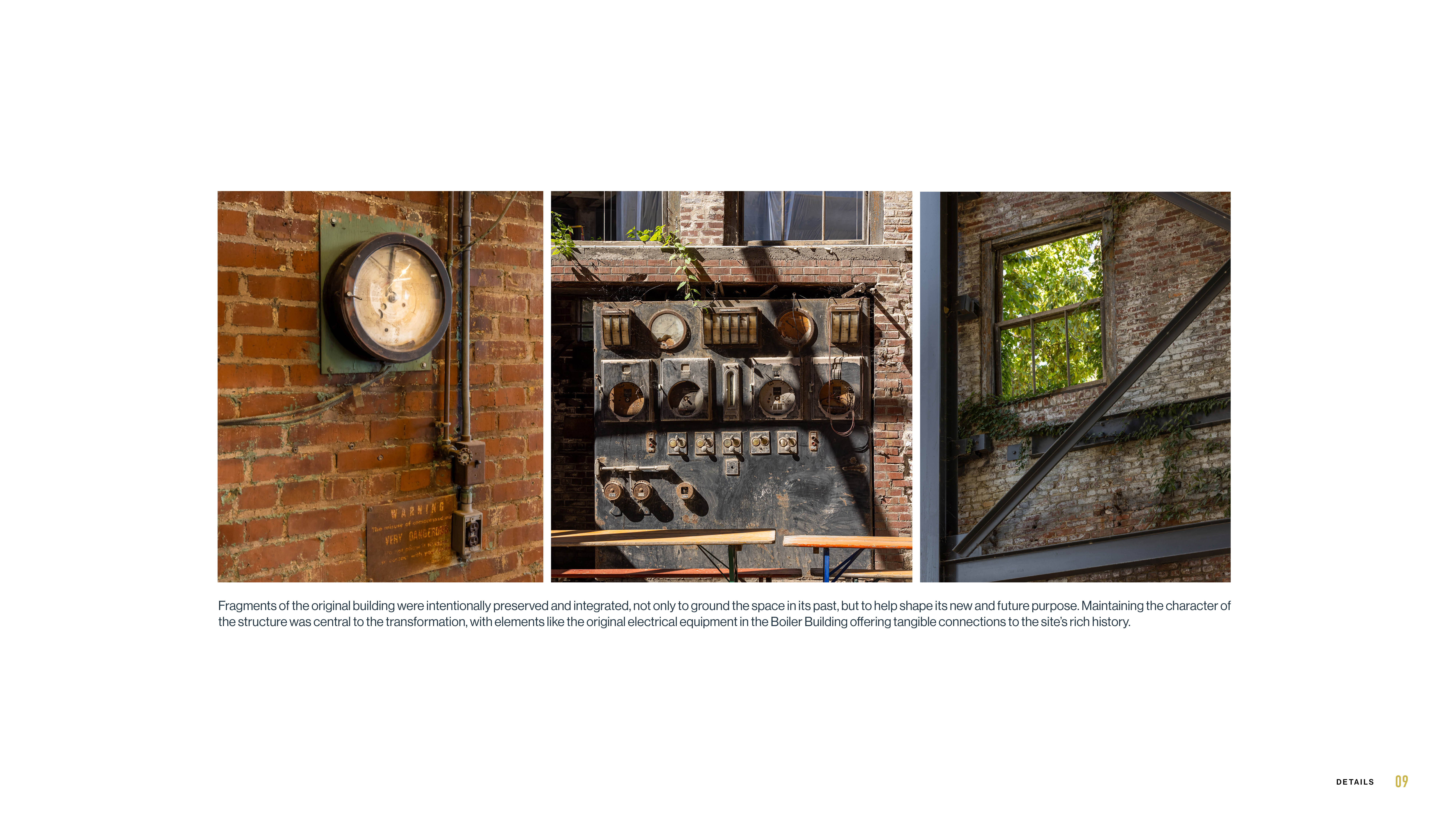 Image 9 – Fragments of the original building were intentionally preserved and integrated, not only to ground the space in its past, but to help shape its new and future purpose. Maintaining the character of the structure was central to the transformation, with elements like the original electrical equipment in the Boiler Building offering tangible connections to the site’s rich history.