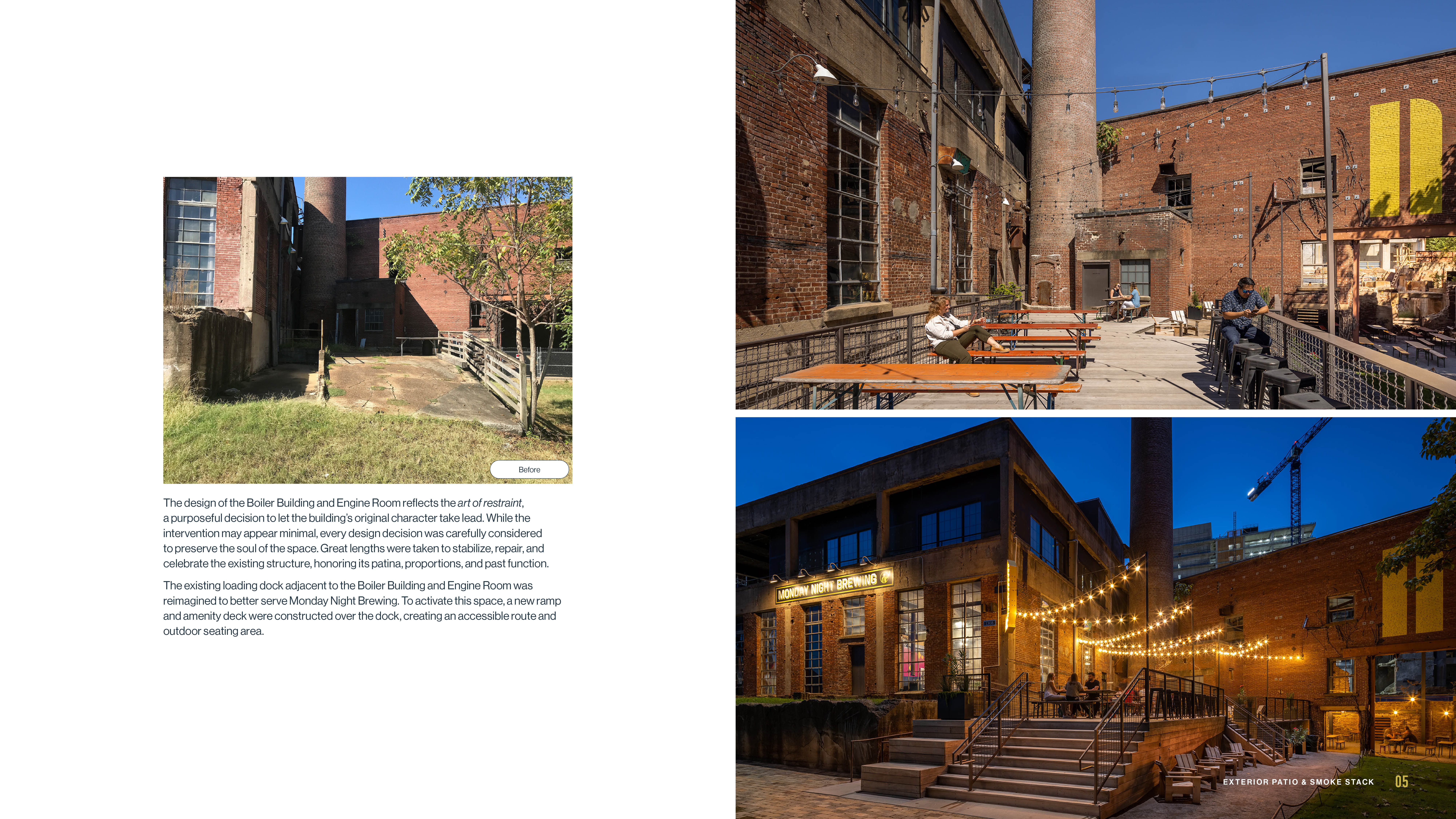 Image 5 – The existing loading dock adjacent to the Boiler Building and Engine Room was reimagined to better serve Monday Night Brewing. To activate this space, a new ramp and amenity deck were constructed over the dock, creating an accessible route and outdoor seating area.