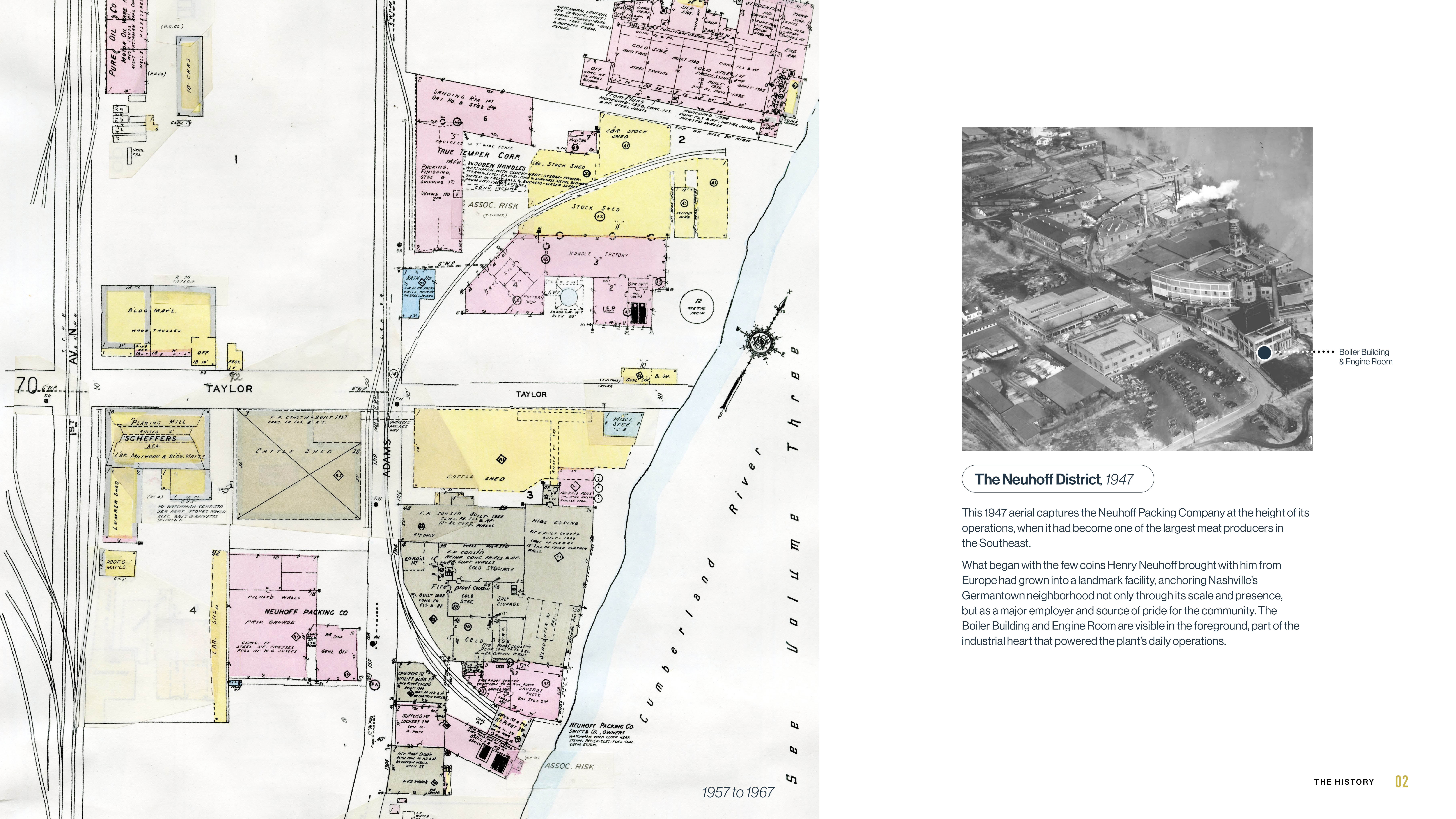Image 2 – An aerial view of the Neuhoff Packing Company, circa 1947. By that time, the plant was producing large volumes of fresh and processed meats that were being distributed all across the greater Southeast. The Boiler Building and Engine Room can be seen in the foreground.