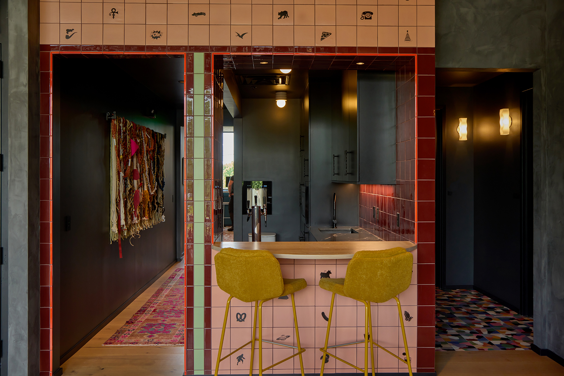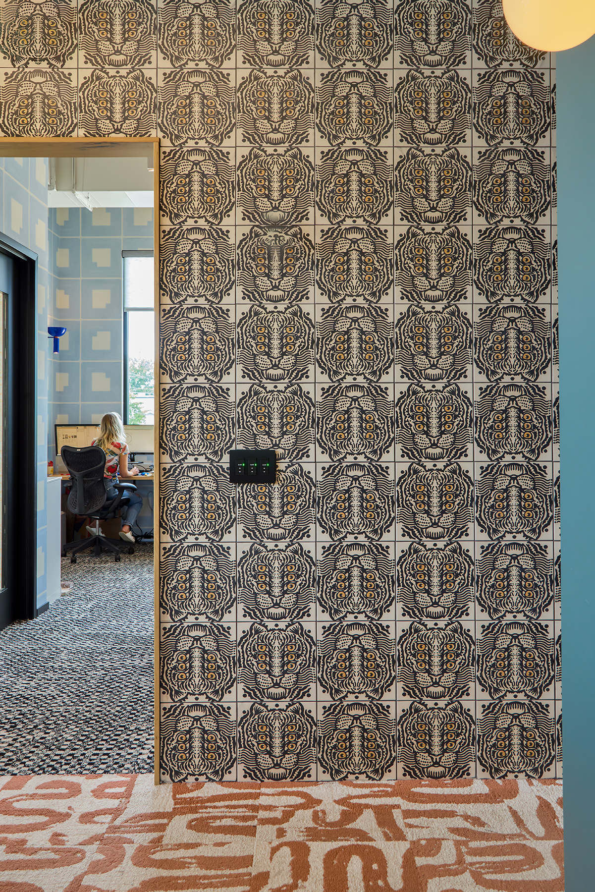 Designing one’s own workplace offered Powell the rare opportunity to experiment, iterate, and evolve. Acting as designer, builder, and user, the team shaped an adaptable environment where open work areas can be rearranged as needs change. Throughout the space, local artistry comes to life—from custom “P-word” tiles to bold patterns and colors—turning daily movement through the office into an immersive, ever-changing experience of discovery.