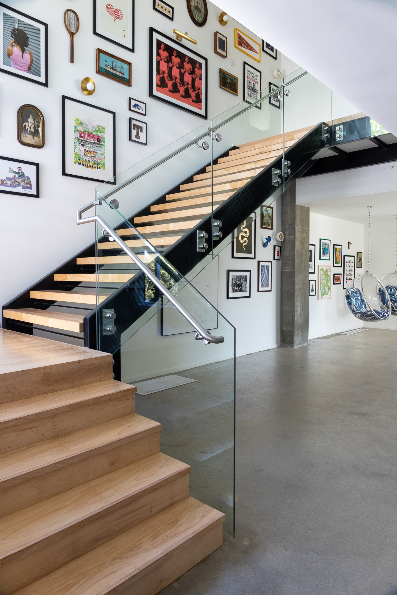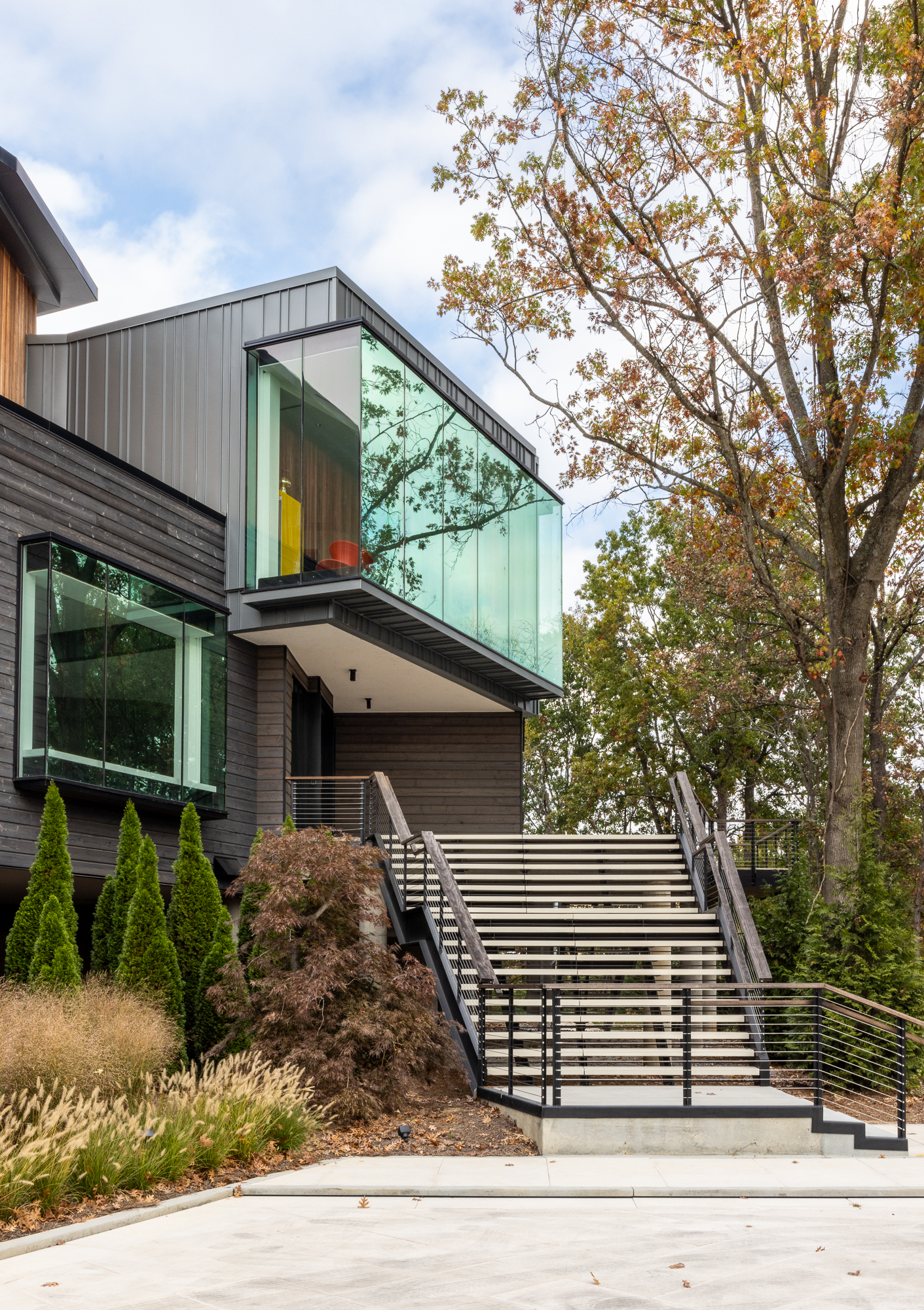 While an elevator was introduced to allow for ease of moving larger items in and out of the house, the staircases were a key design element and were located to provide convenient access to the residents. One stair logically connects the garage to the family living area to the primary suite. A second, more central stair is intentionally frontal and connects the home’s entry to the game room and upstairs guest rooms. The monumental precast and steel stair rising to the front door was designed as a feature of the home’s façade to draw people from the parking court up to the front porch. Landscaping was designed using primarily native plants, many which attract pollinators. The project directly connects the inhabitants with “place”; views of the Cumberland River abound, and an outdoor limestone stair takes one to a boat dock at the river’s edge.