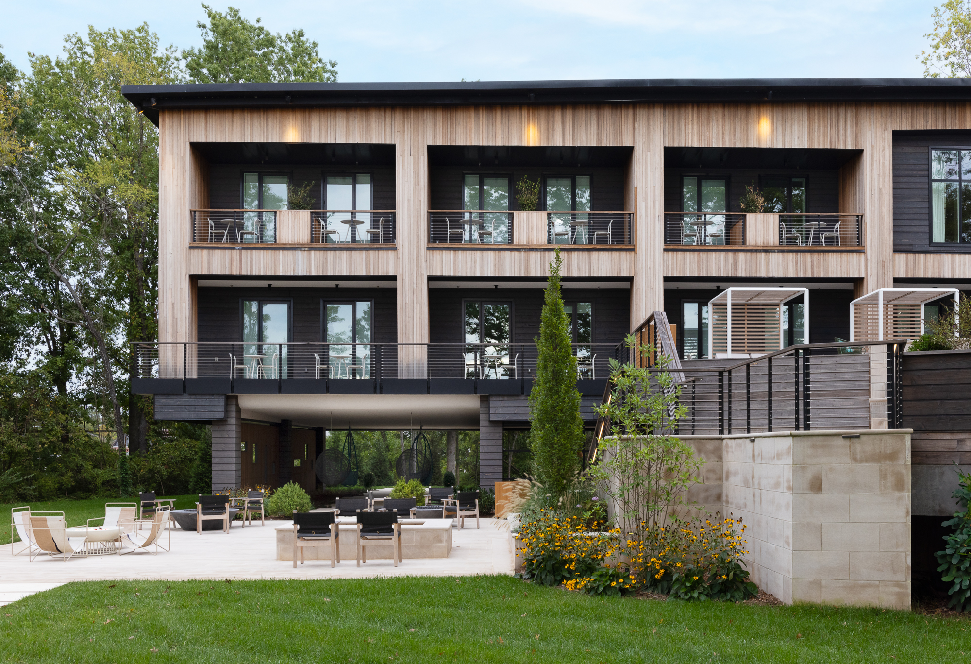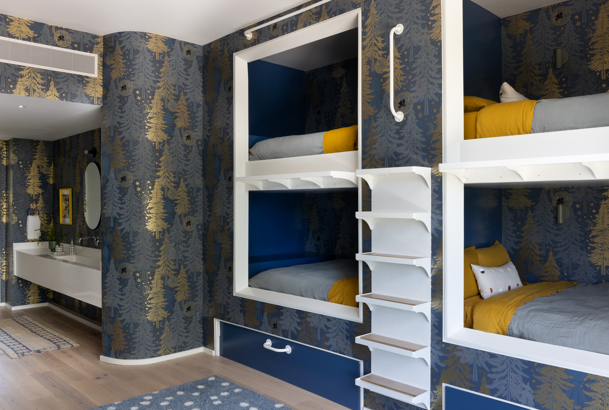 **Well Being** – The River House’s primary focus is on occupant comfort. Daylighting was maximized to both allow views of the outdoors and reduce dependence on artificial lighting, but also to improve the overall mood and mental health of the residents. Daylighting enters the great room space from multiple locations to “activate” the space as the sun moves and provide more uniform lighting throughout. The balance of daylighting with the home’s HVAC performance ensures thermal comfort. Each guest room’s temperature is individually controlled and the equipment serving the room can be shut off when the room is unoccupied. Each guest room also has access to a balcony space facing the river and pool deck. The primary suite and family living room also open to exterior living spaces. The project’s interior design engages one’s senses through its use of vibrant colors, varied materials, and unique light fixtures. Acoustic plaster was used on the great room and game room ceilings to eliminate echo and dampen sound levels in those larger spaces. A variety of social spaces support both larger gatherings, and smaller, more intimate get-togethers. Providing opportunities for children to feel welcome was also important –a custom steel slide from the front porch to grade was designed for kids and kids at heart. One guest room is a custom designed bunk room which sleeps 12 and is finished in wallpaper from ET The Extraterrestrial. The pool was designed with a zero-entry and wide shallow end, allowing easier access and use for young children and seniors. The western deck is only at two levels, thus eliminating the need for multiple sets of stairs for access and maximizing the usable area.