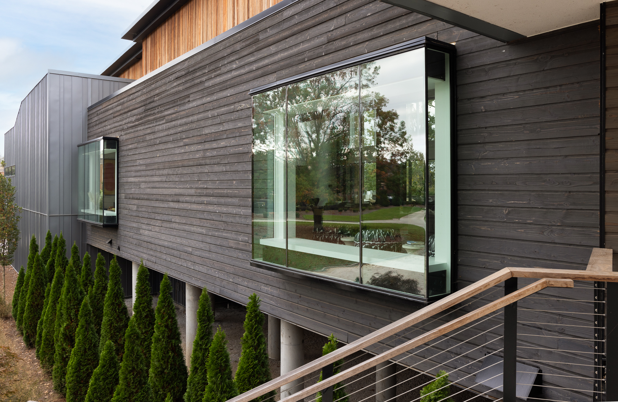 The River House’s rooftop photovoltaic system generates almost 37 MWh per year offsetting much of the home’s electrical use. The primary HVAC system is Variable Refrigerant Flow with a SEER near 30. Daylighting is maximized to reduce the need for supplemental interior lighting. However, the south facade intentionally has almost no fenestration, and the glass guest room entries on the west side are set beneath a deep overhang to reduce afternoon heat gain. The modern glass “bay windows” face east to bring morning light into the deep interior spaces. The house is spray-foam and rockwool insulated, with continuous insulation across all outside walls. Exterior materials were selected for aesthetics, durability and low maintenance. A standing seam metal skin relates to the shipping industries adjacent to the property. Limestone pavers were regionally sourced. The extensive shou sugi ban fir siding has two different chars, varied widths, and a custom reveal which allowed articulation of the differentiate the facades.