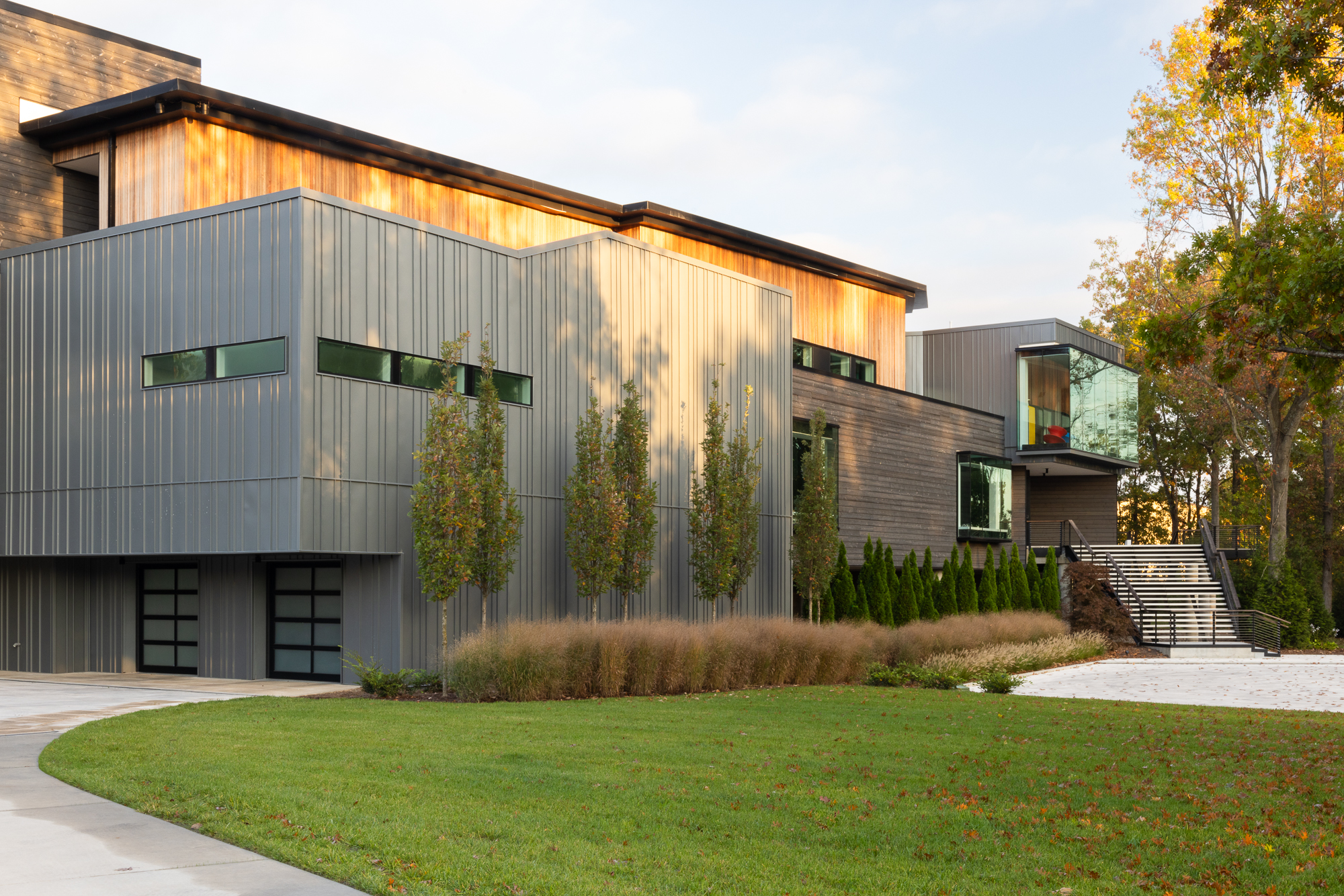 **Energy** – The River House was sited to maximize views and access to the Cumberland River, which meant its orientation had a wide western façade full of glass. The design recesses much of the western fenestration to avoid solar heat gain. At the 46’ wide operable glass wall connecting the great room to the expansive western wood deck, a custom steel and wood canopy protects the opening from the sun. The northern half of the roof is fully covered in photovoltaics which generate 37 MWh per year, offsetting much of the home’s electrical use. A Variable Refrigerant Flow HVAC system maximizes flexibility and the ability to shut unoccupied portions of the house off, while minimizing energy consumption as VRF technology can achieve SEER ratings significantly higher than traditional HVAC systems. This higher efficiency equates to a lower carbon footprint. The home is “over insulated” with closed cell foam and rockwool to reduce heat/cool loss and improve the indoor environmental quality.
