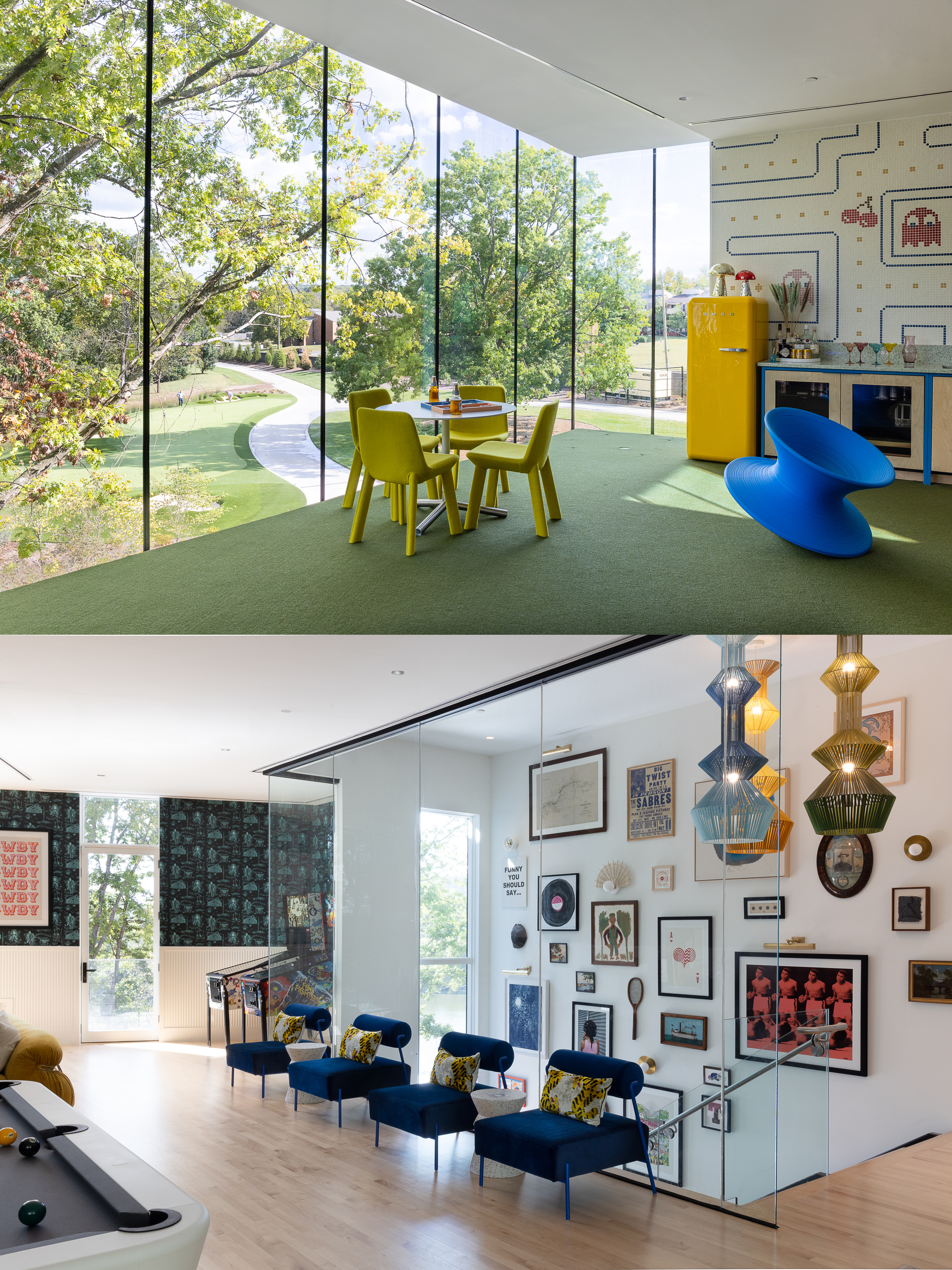 The lowest level was designed for parking, systems, and storage in response to the flood plain, and provides an “at grade” entrance. The first level above grade makes use of a post-tension concrete floor lifted 11’ above the flood plain to enhance river views. On this plinth, two “wings” were erected – one for family, one for guests. This division logically kept the family’s activities separate from those of their visitors and allowed over half of the house to fully shut down when unoccupied. The central space connecting the two wings includes a 23’ high, 3000 SF great room capable of holding multiple casual living room areas, or seating for a large dinner event. Upstairs, a dramatic game room contains a golf simulator, billiards, and old-school video games with a western river panorama, and eastern views facing the property’s entry and chipping/putting green.