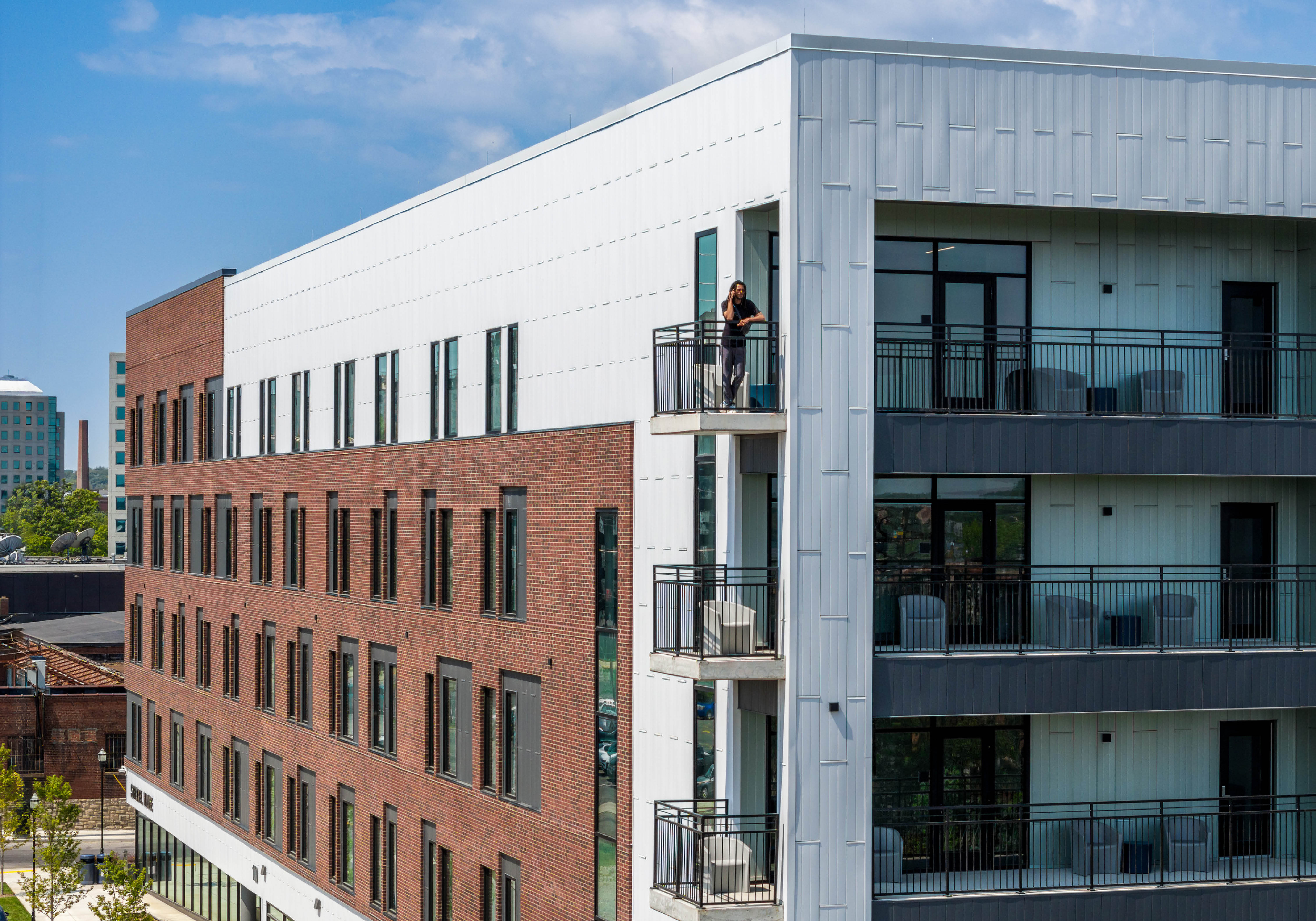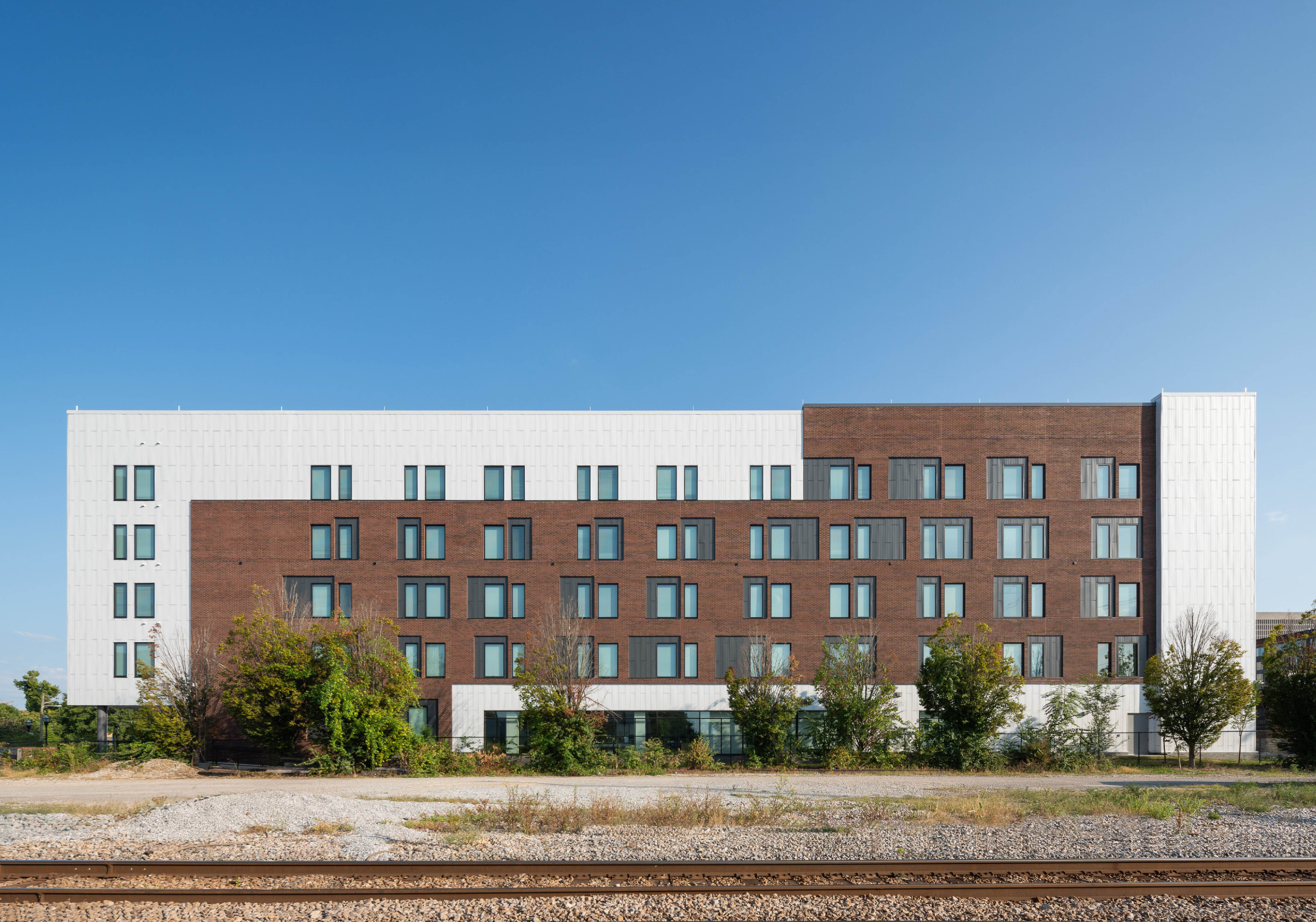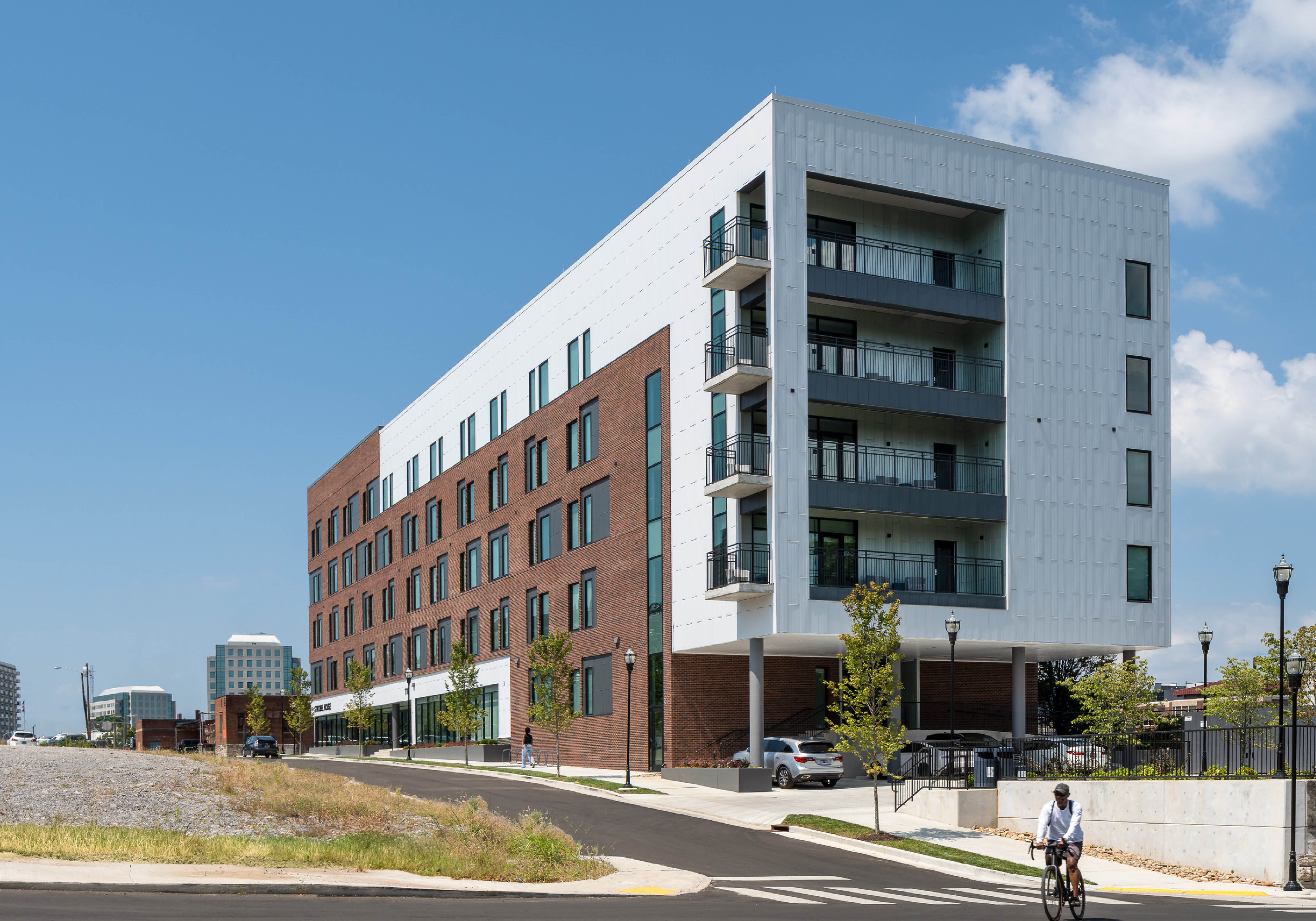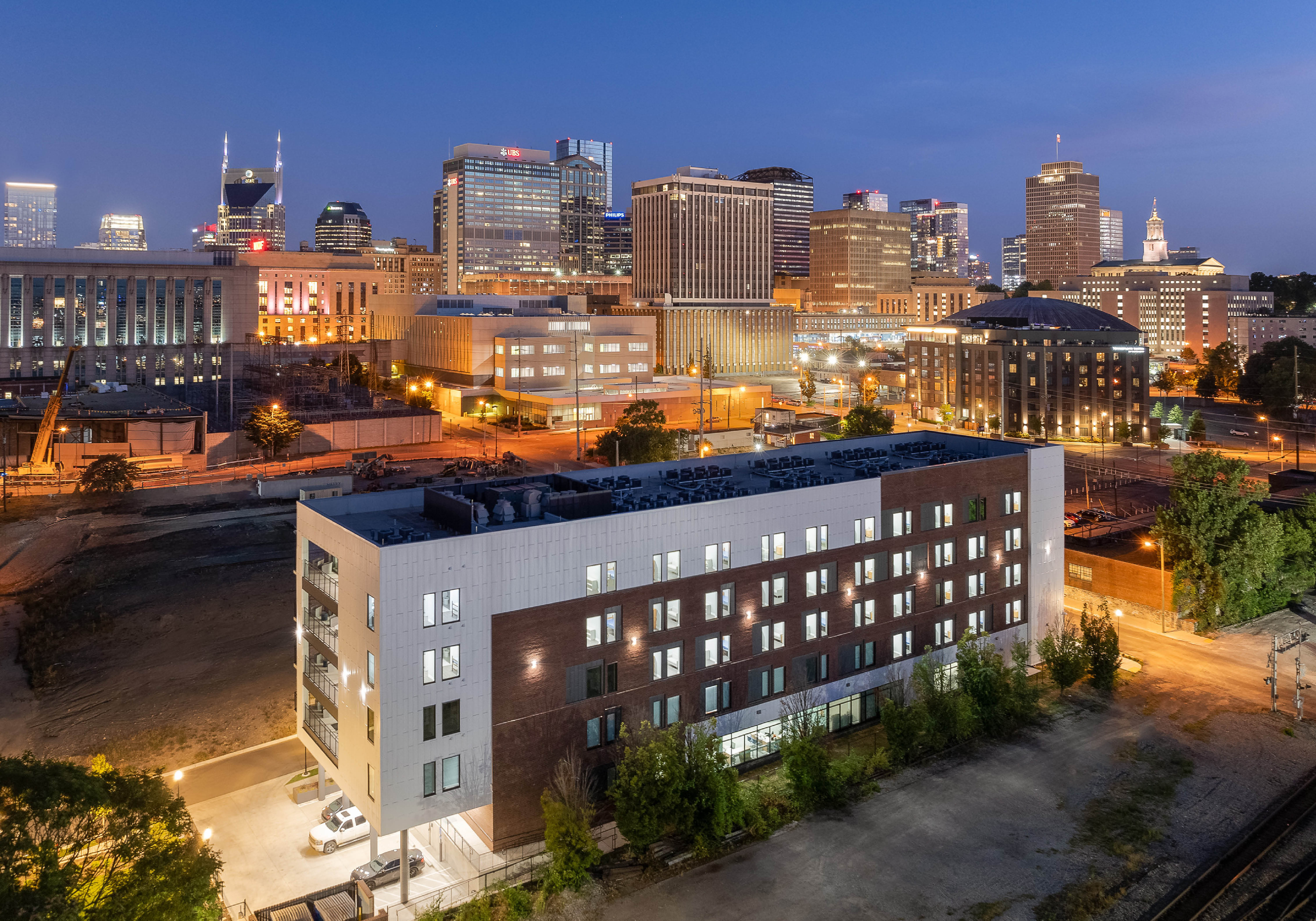 The LEED Gold-certified development comprises 90 fully furnished efficiency units, each featuring a private bedroom, bathroom, and kitchen. On-site amenities include a computer lab, multipurpose rooms, and outdoor terraces offering panoramic views of the river and Downtown Nashville. First-floor case management offices provide residents with on-site resources in a familiar setting, while nearby communal spaces support engagement, healing, and community-building.