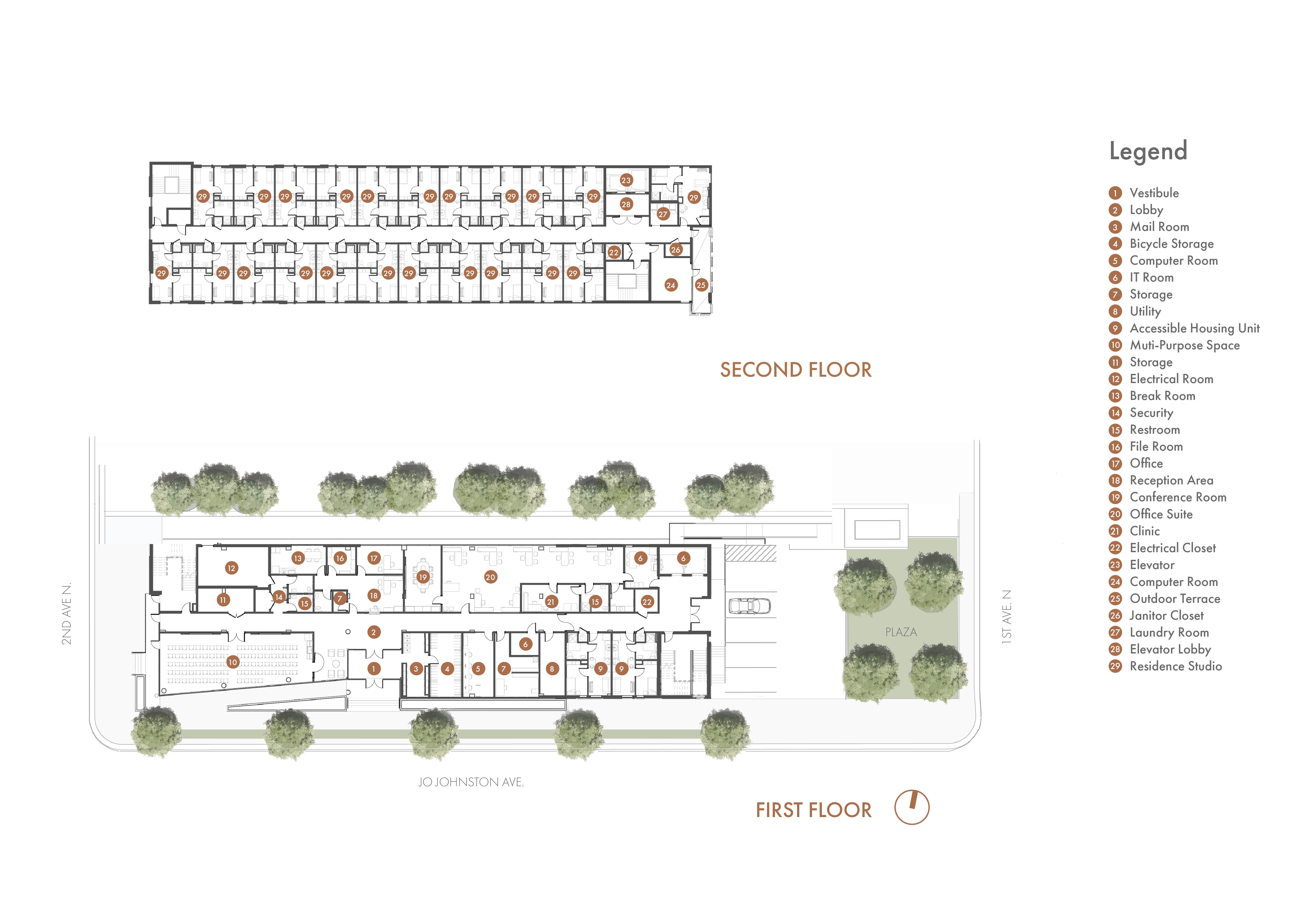 3. The first floor features resident amenities including case management offices, a bike room, and a computer room, while the upper floors house 90 one-bedroom apartments with community spaces.