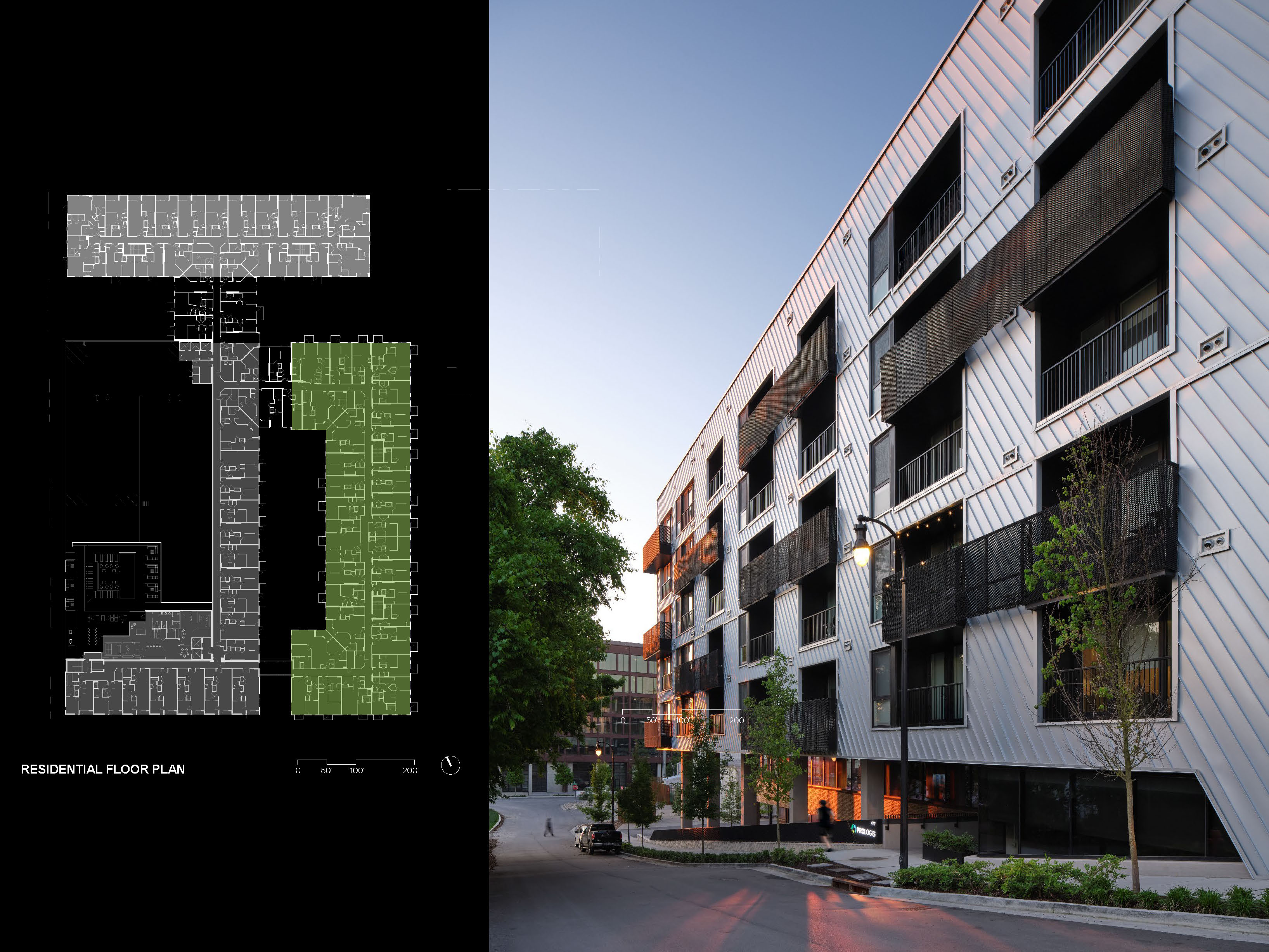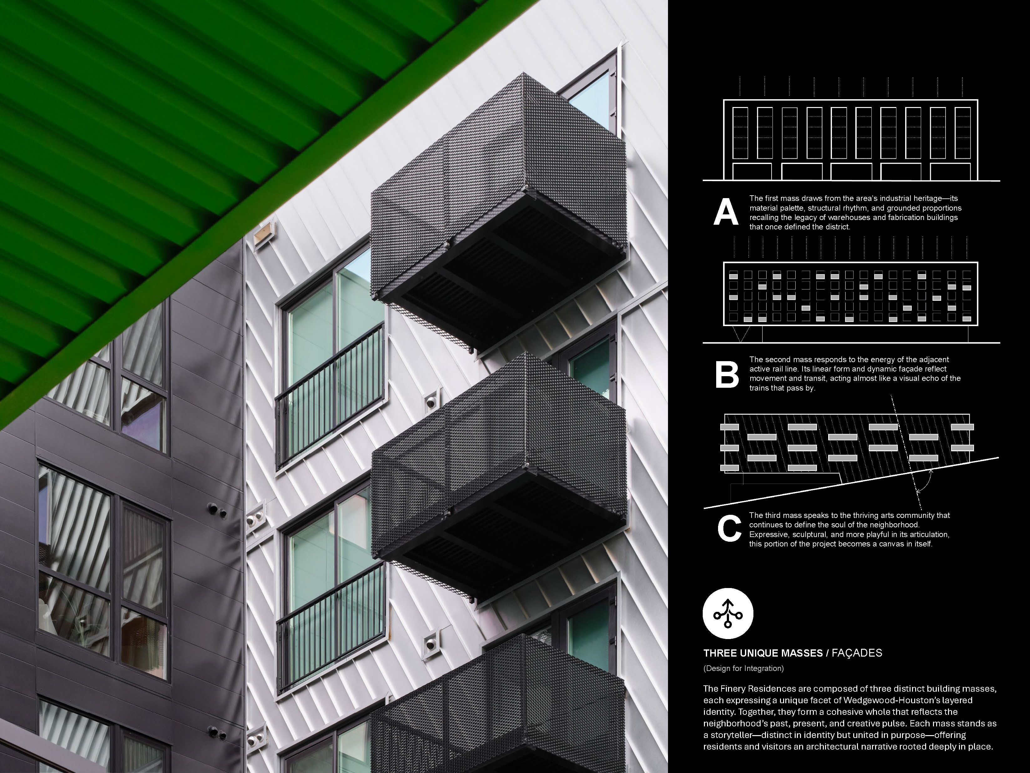 The Finery Residences are composed of three distinct building masses, each expressing a unique facet of Wedgewood-Houston’s layered identity. Together, they form a cohesive whole that reflects the neighborhood’s past, present, and creative pulse. Each mass stands as a storyteller—distinct in identity but united in purpose—offering residents and visitors an architectural narrative rooted deeply in place.