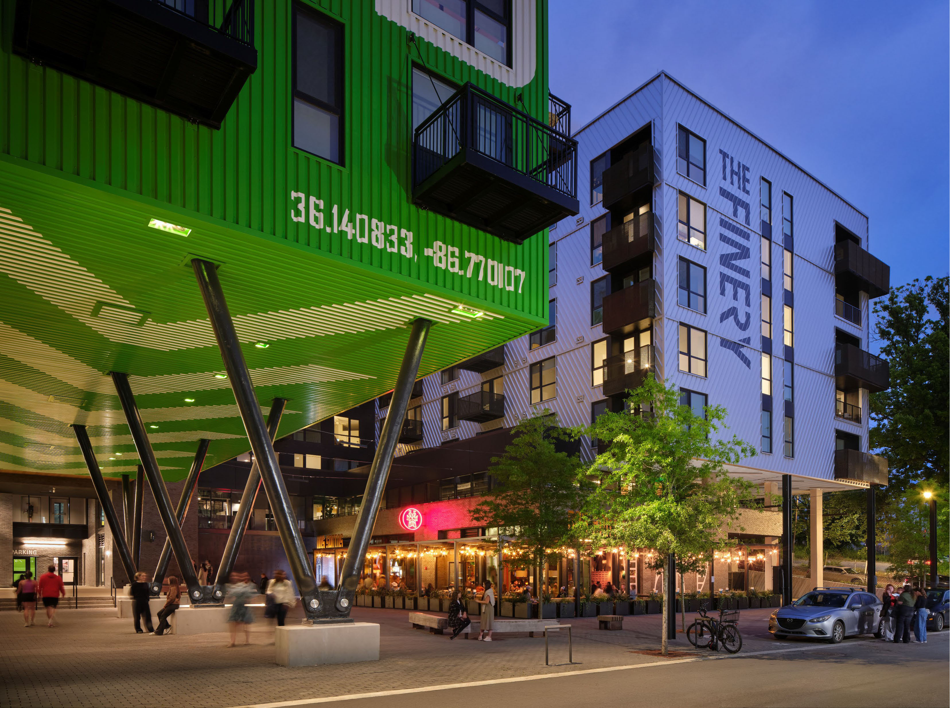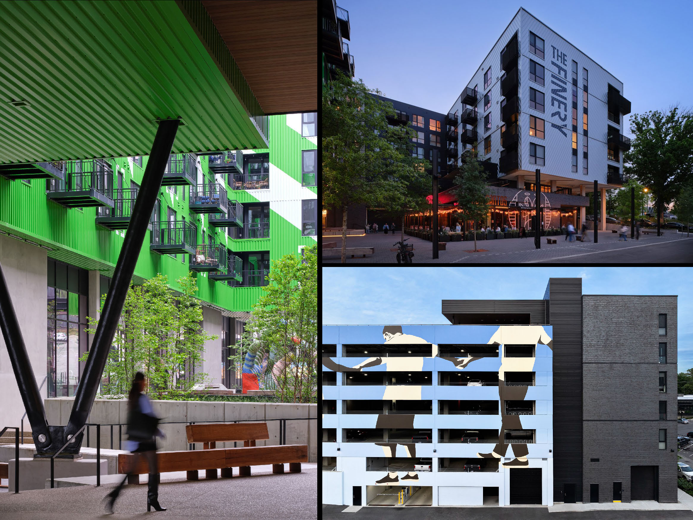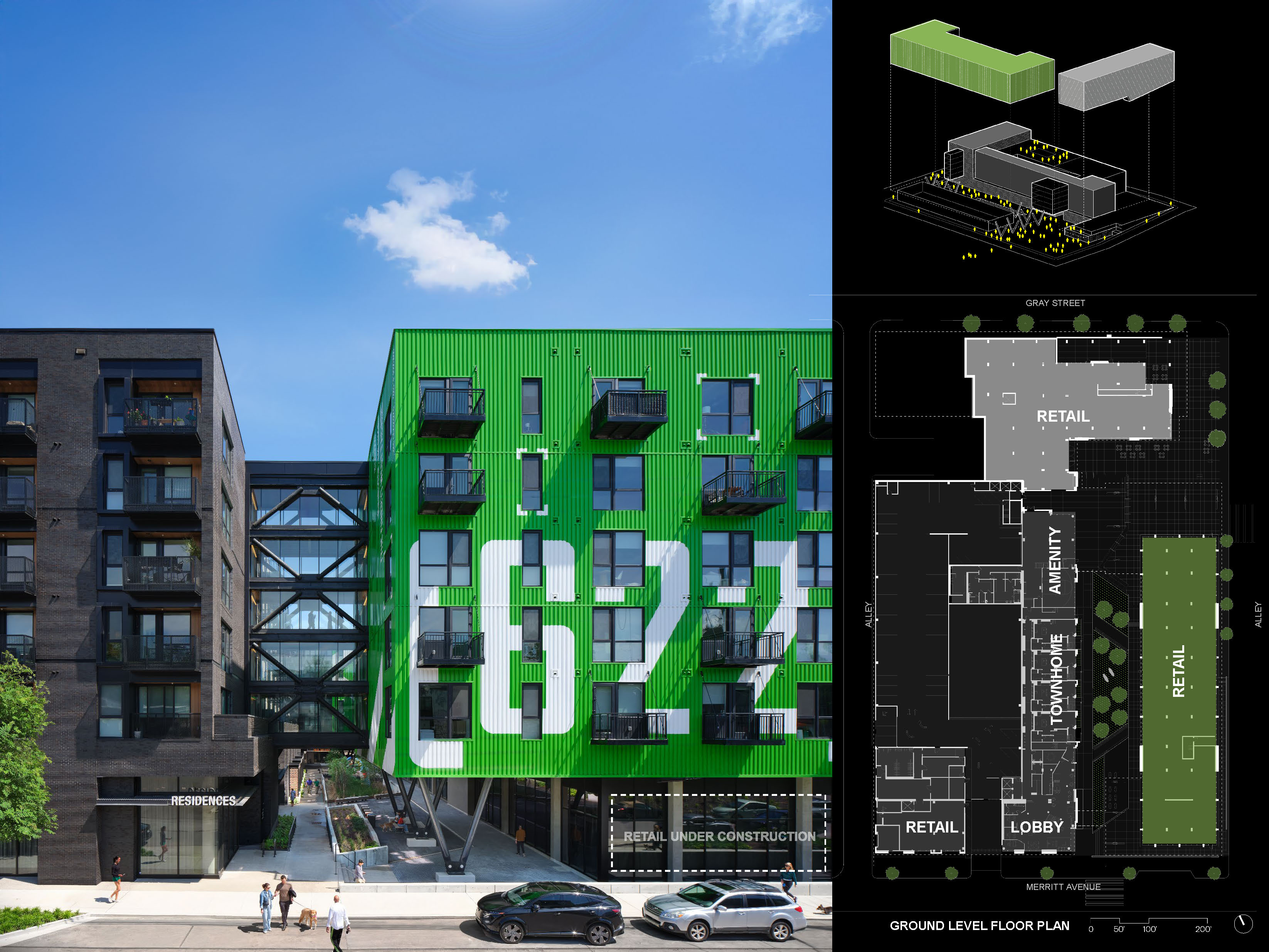 Inspired by the bold spirit of the neighborhood’s artists, makers, and entrepreneurs, the design strategically breaks down the scale of the development into three distinct forms. The West Building is grounded and rusticated, the East Building is bright, playful, and elevated above a glass-walled mixed-use base, and the North Building responds to the site's descending topography along Gray Street. Together, these varied forms create an engaging, human-scaled streetscape while providing a vibrant mix of uses that reflect and enhance the evolving character of the neighborhood.