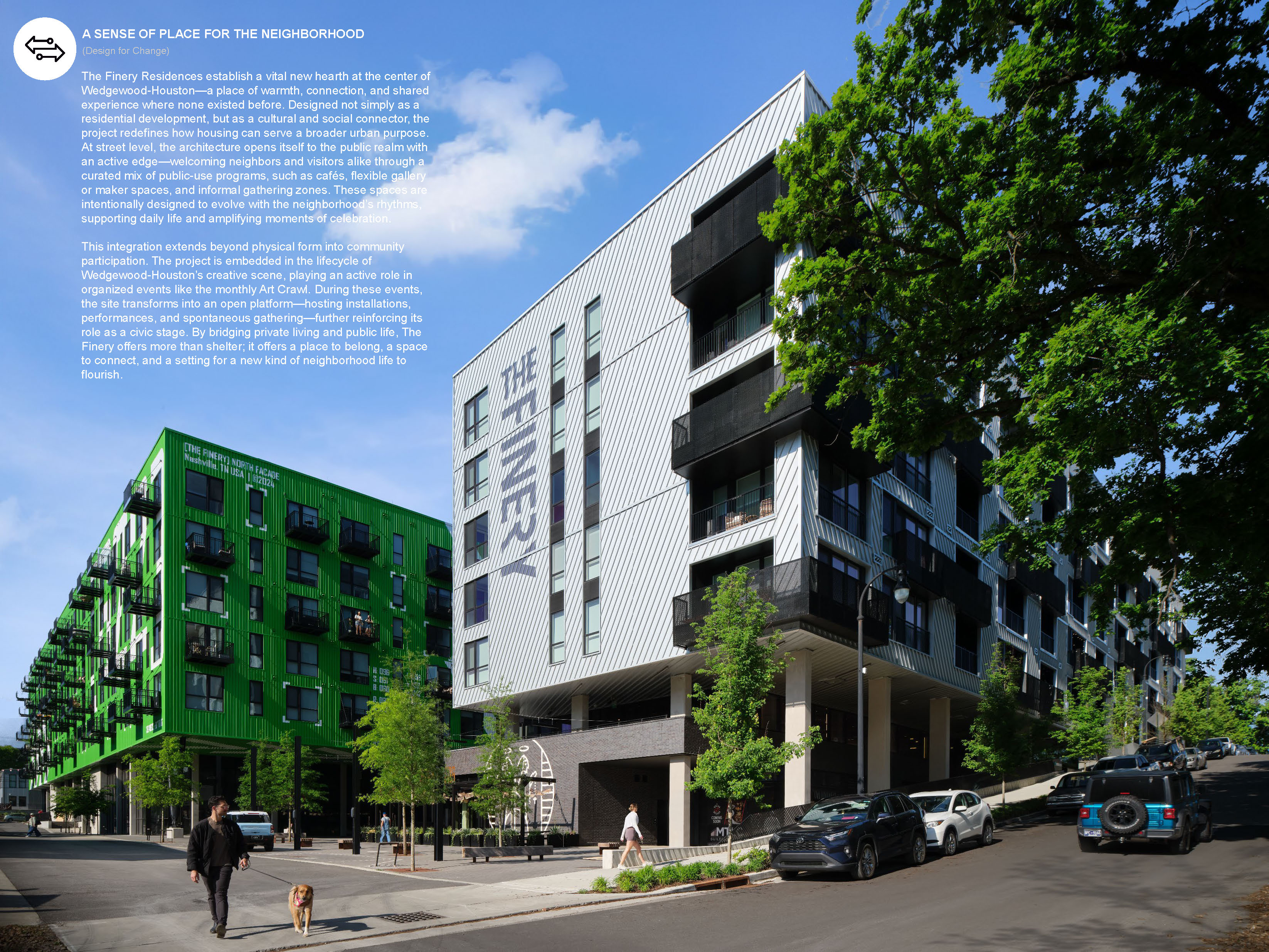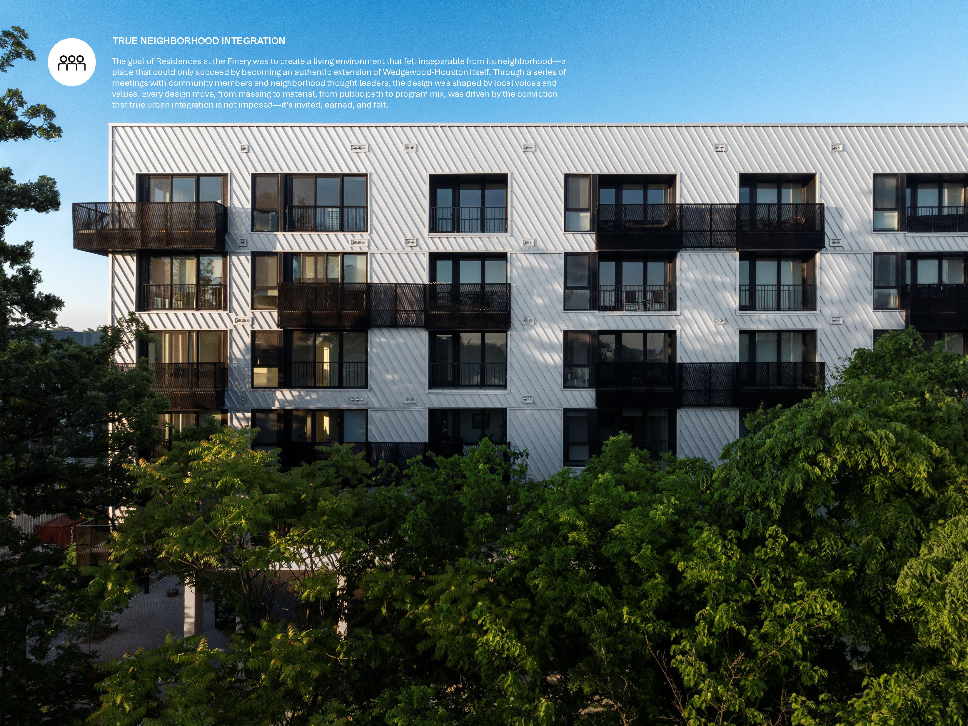 The Finery Residences establish a vital new hearth at the center of Wedgewood-Houston—a place of warmth, connection, and shared experience where none existed before. Designed not simply as a residential development, but as a cultural and social connector, the project redefines how housing can serve a broader urban purpose. At street level, the architecture opens itself to the public realm with an active edge—welcoming neighbors and visitors alike through a curated mix of public-use programs, such as cafés, flexible gallery or maker spaces, and informal gathering zones. These spaces are intentionally designed to evolve with the neighborhood’s rhythms, supporting daily life and amplifying moments of celebration.