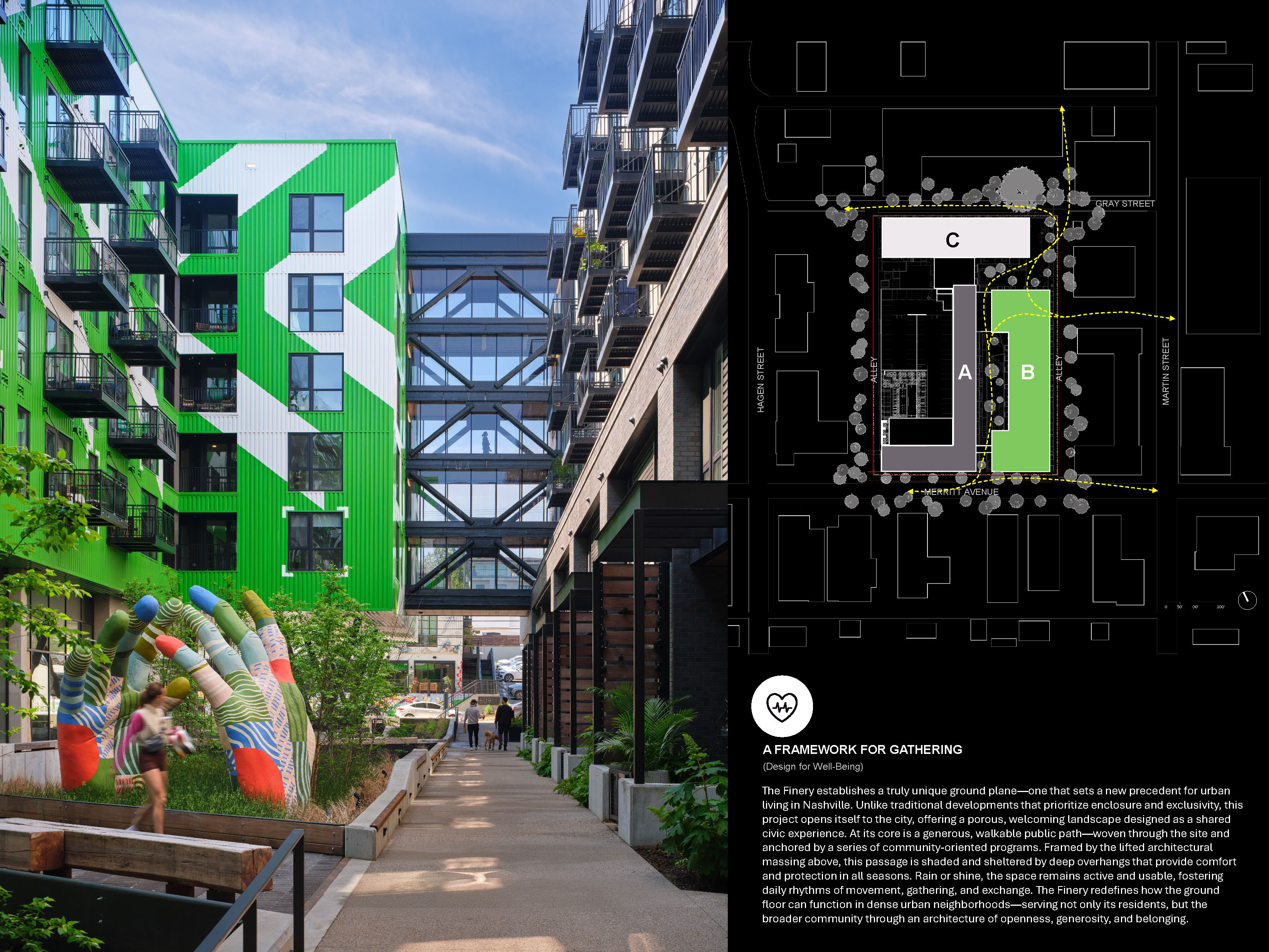 The Finery establishes a truly unique ground plane—one that sets a new precedent for urban living in Nashville. Unlike traditional developments that prioritize enclosure and exclusivity, this project opens itself to the city, offering a porous, welcoming landscape designed as a shared civic experience. At its core is a generous, walkable public path—woven through the site and anchored by a series of community-oriented programs. Framed by the lifted architectural massing above, this passage is shaded and sheltered by deep overhangs that provide comfort and protection in all seasons. Rain or shine, the space remains active and usable, fostering daily rhythms of movement, gathering, and exchange. The Finery redefines how the ground floor can function in dense urban neighborhoods—serving not only its residents, but the broader community through an architecture of openness, generosity, and belonging.