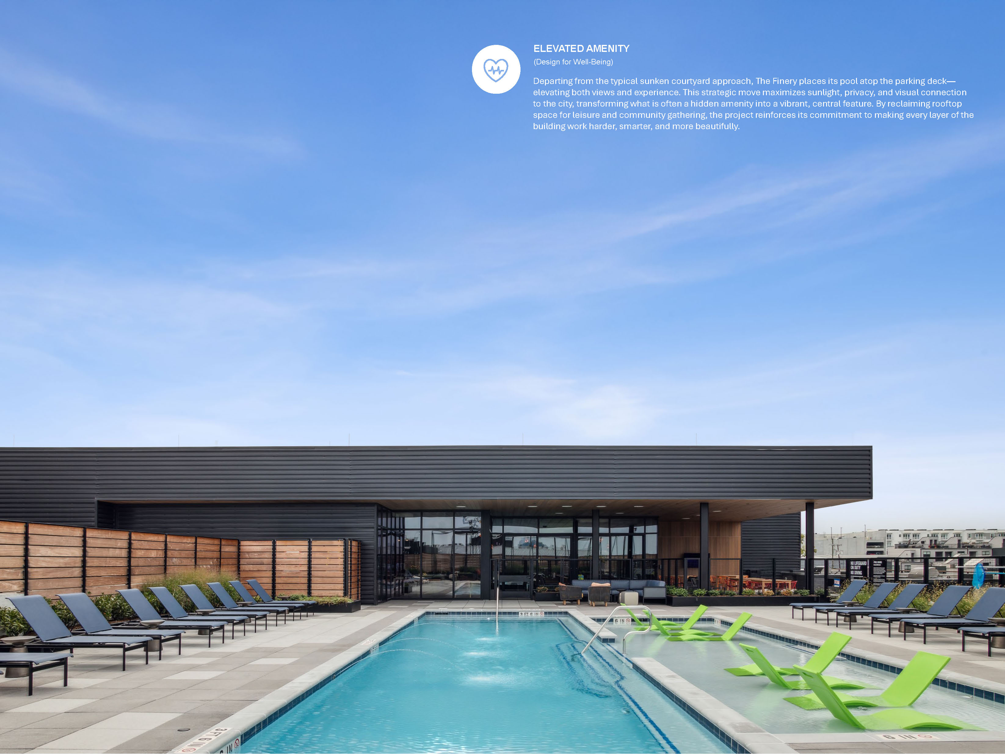 Departing from the typical sunken courtyard approach, The Finery places its pool atop the parking deck—elevating both views and experience. This strategic move maximizes sunlight, privacy, and visual connection to the city, transforming what is often a hidden amenity into a vibrant, central feature. By reclaiming rooftop space for leisure and community gathering, the project reinforces its commitment to making every layer of the building work harder, smarter, and more beautifully.