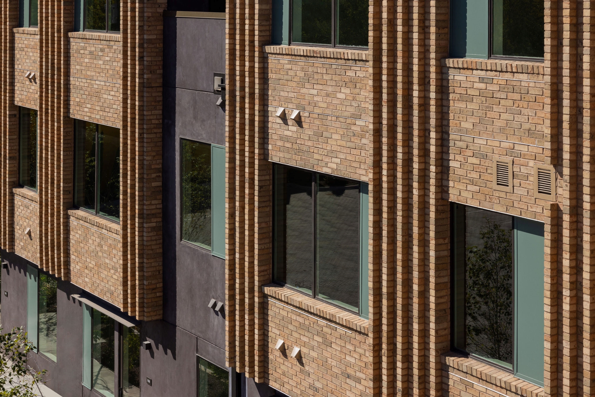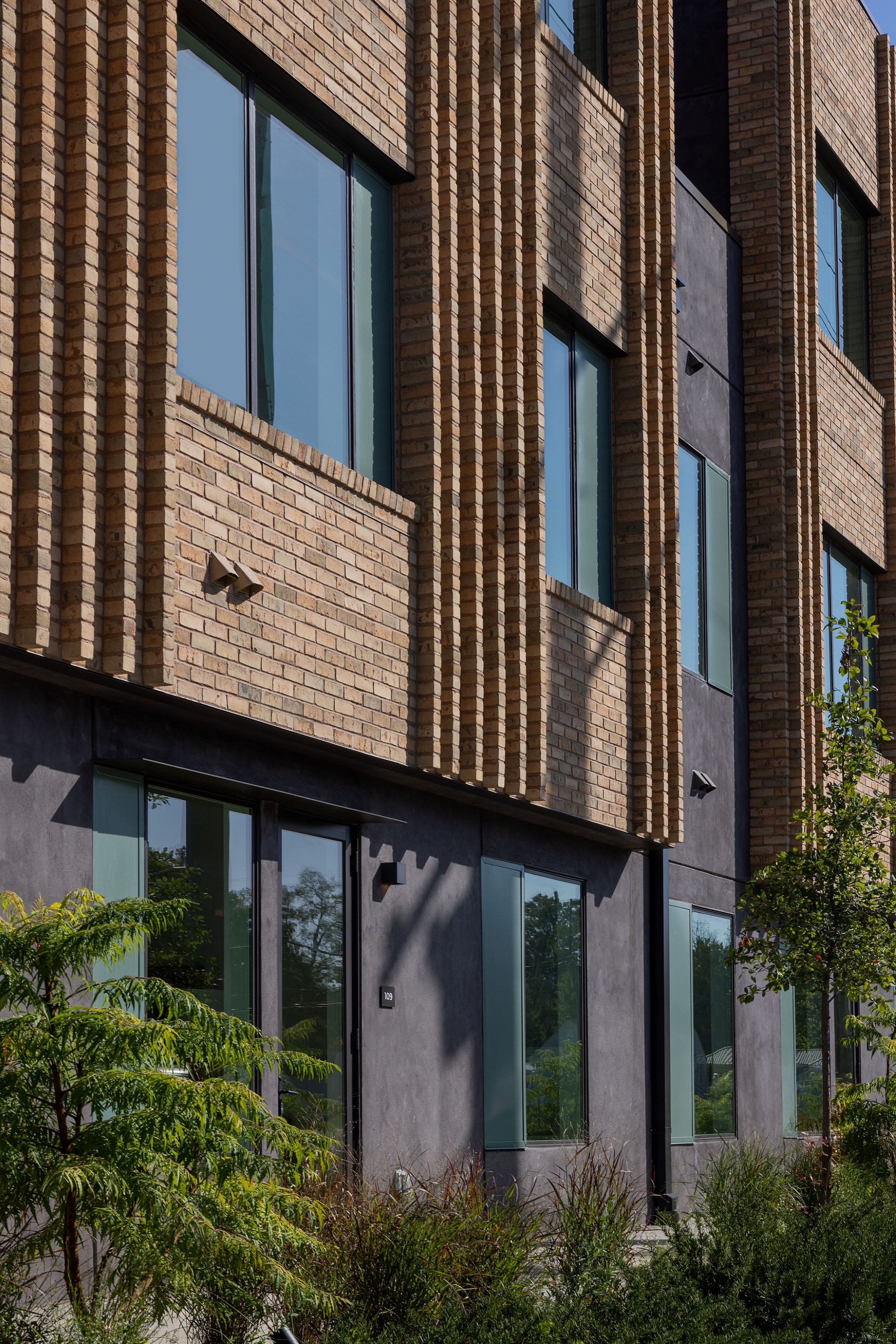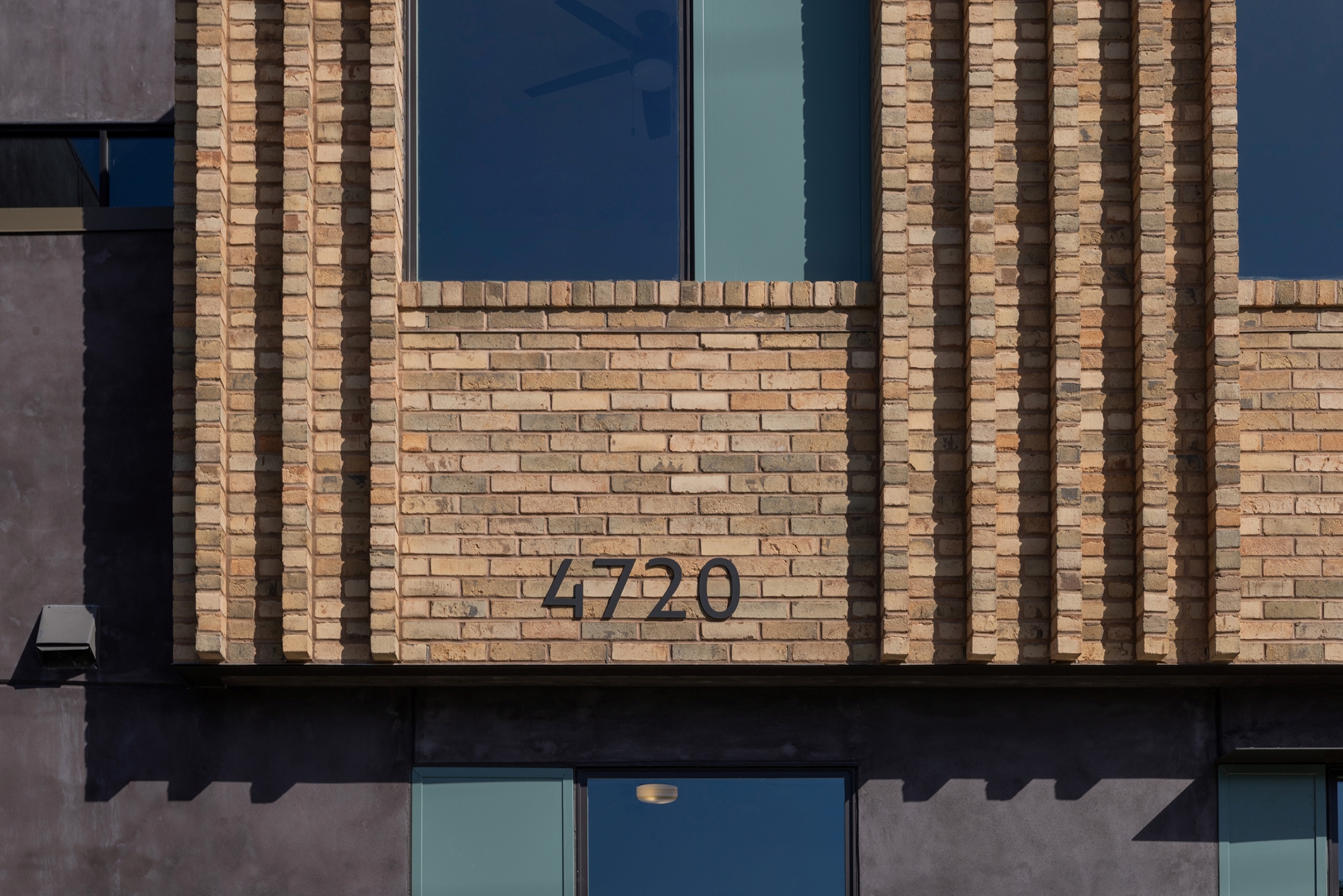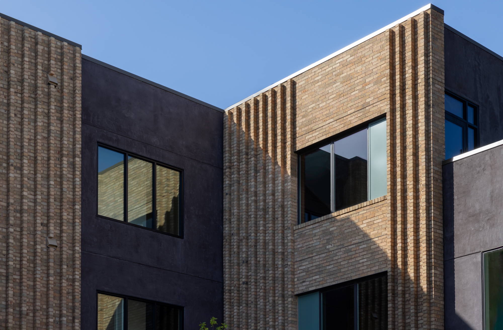 The primary façade type is constructed of a molded, sand-colored masonry unit. These surfaces are marked by a series of verticals that punctuate the areas between and without window openings. Naturally arising from the underlying running bond pattern, the sharp verticality is intentionally softened by the inherent, weather-beaten character and tonal range of the clay bodies. The striping adds both depth and dynamic shadow play that transforms the reading of each major elevation throughout the day. This neutral, yet personable surface texture is complemented by chocolatey stucco, understated green metal panels, and dark bronze accents.
