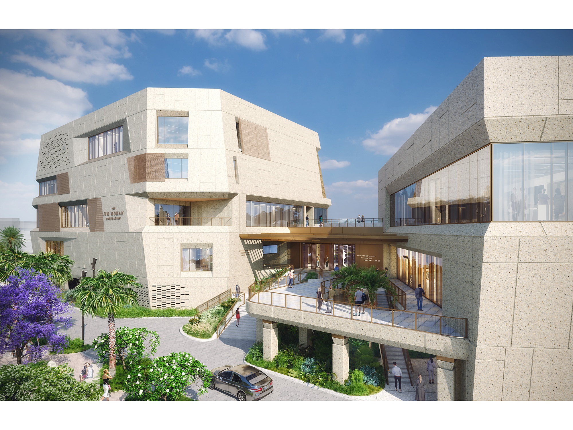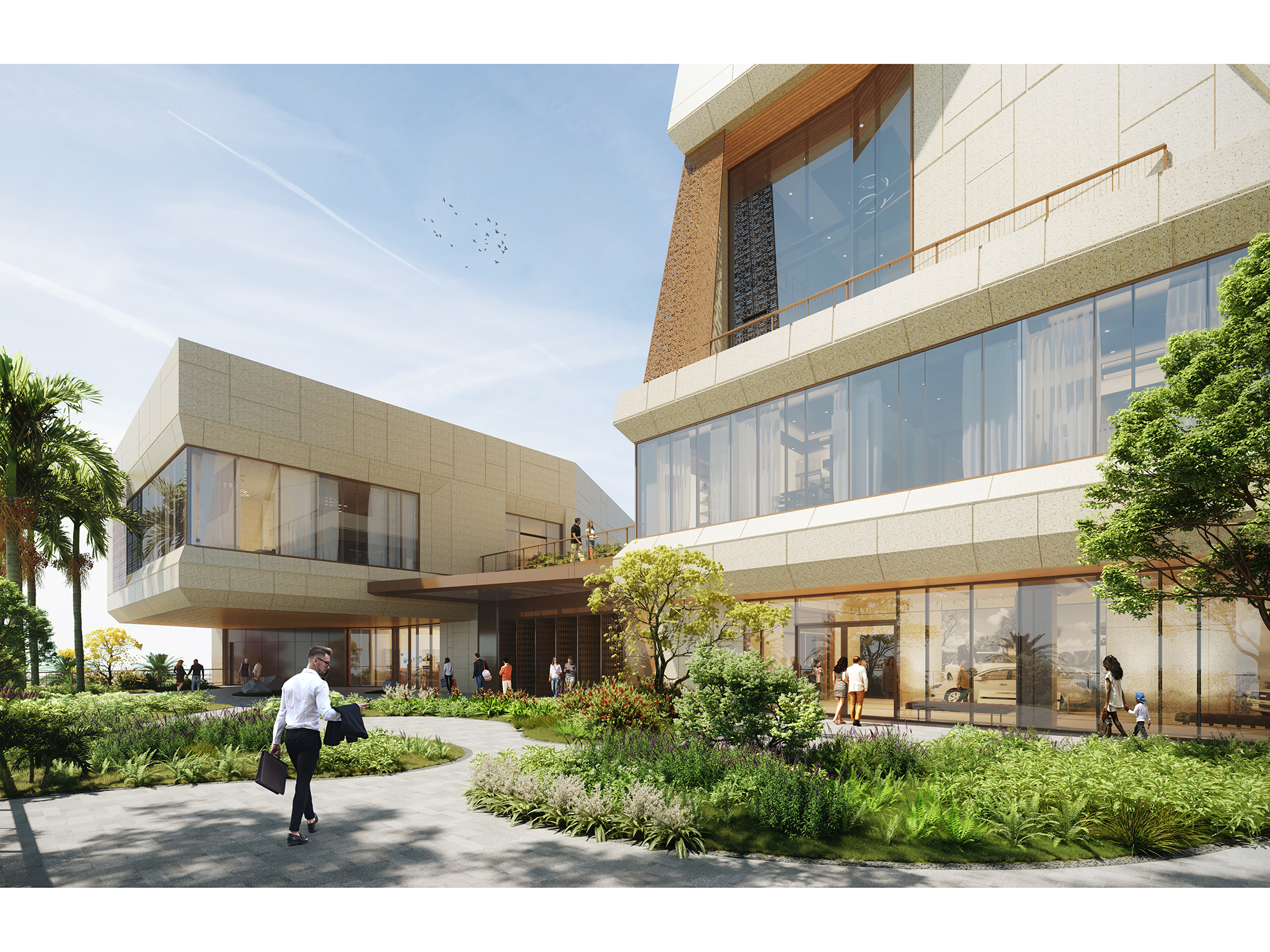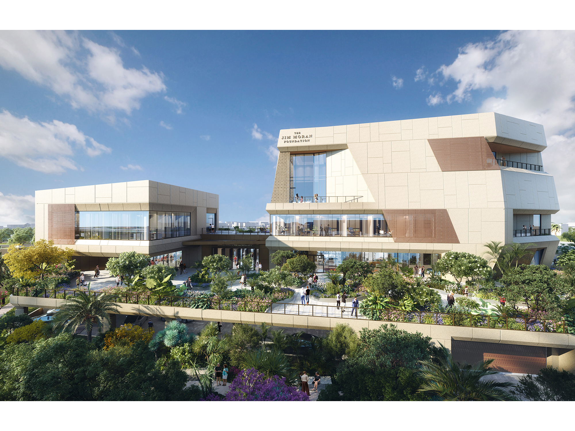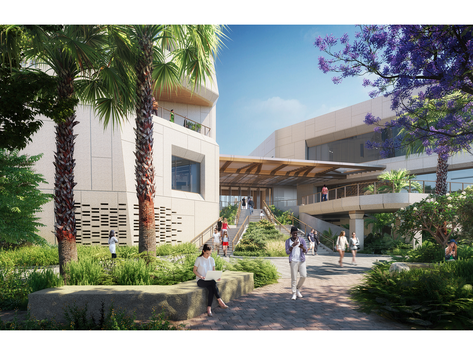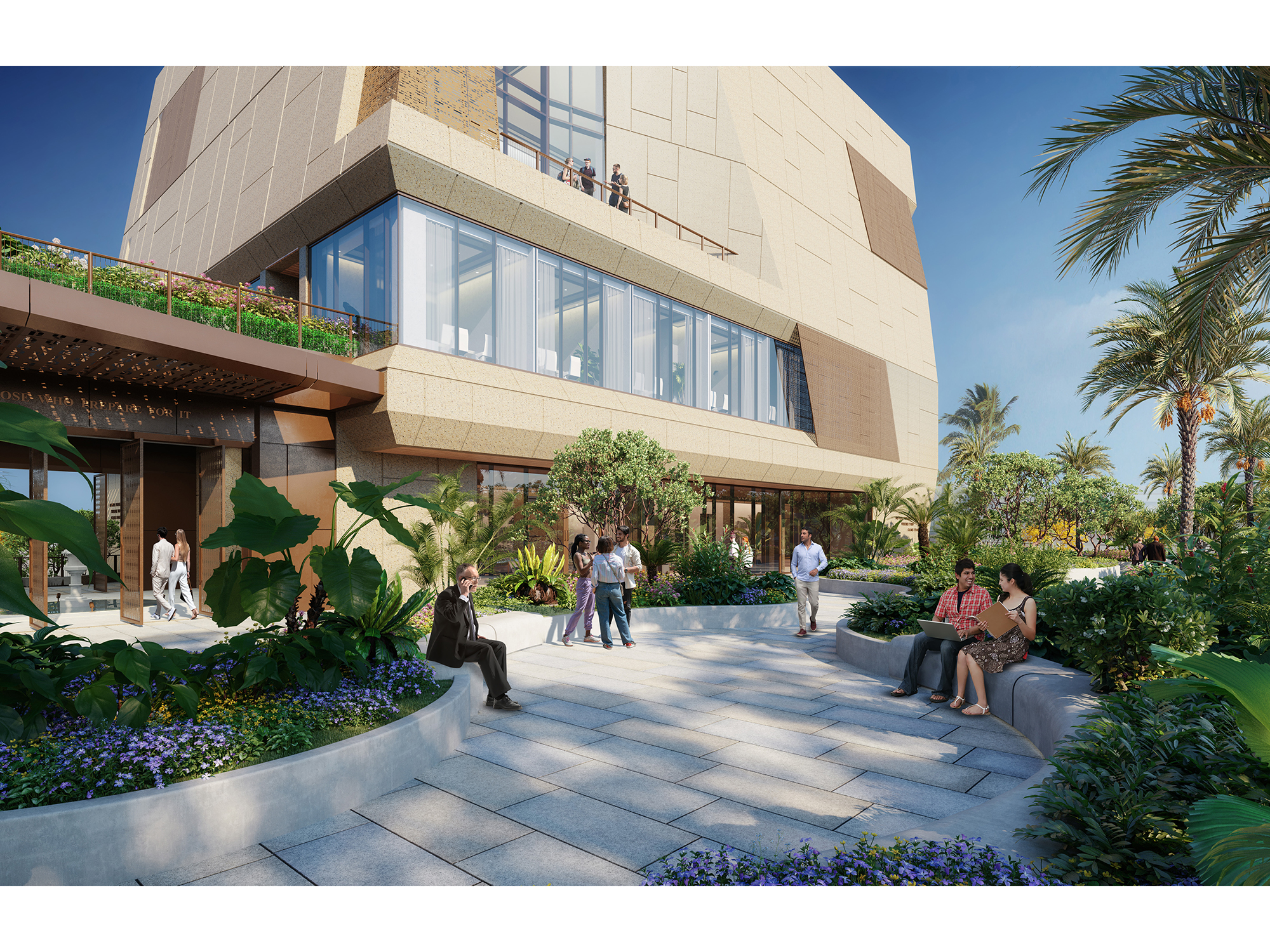Exterior Rendering 03: View of Foundation and Paseo from elevated plinth and hanging gardens