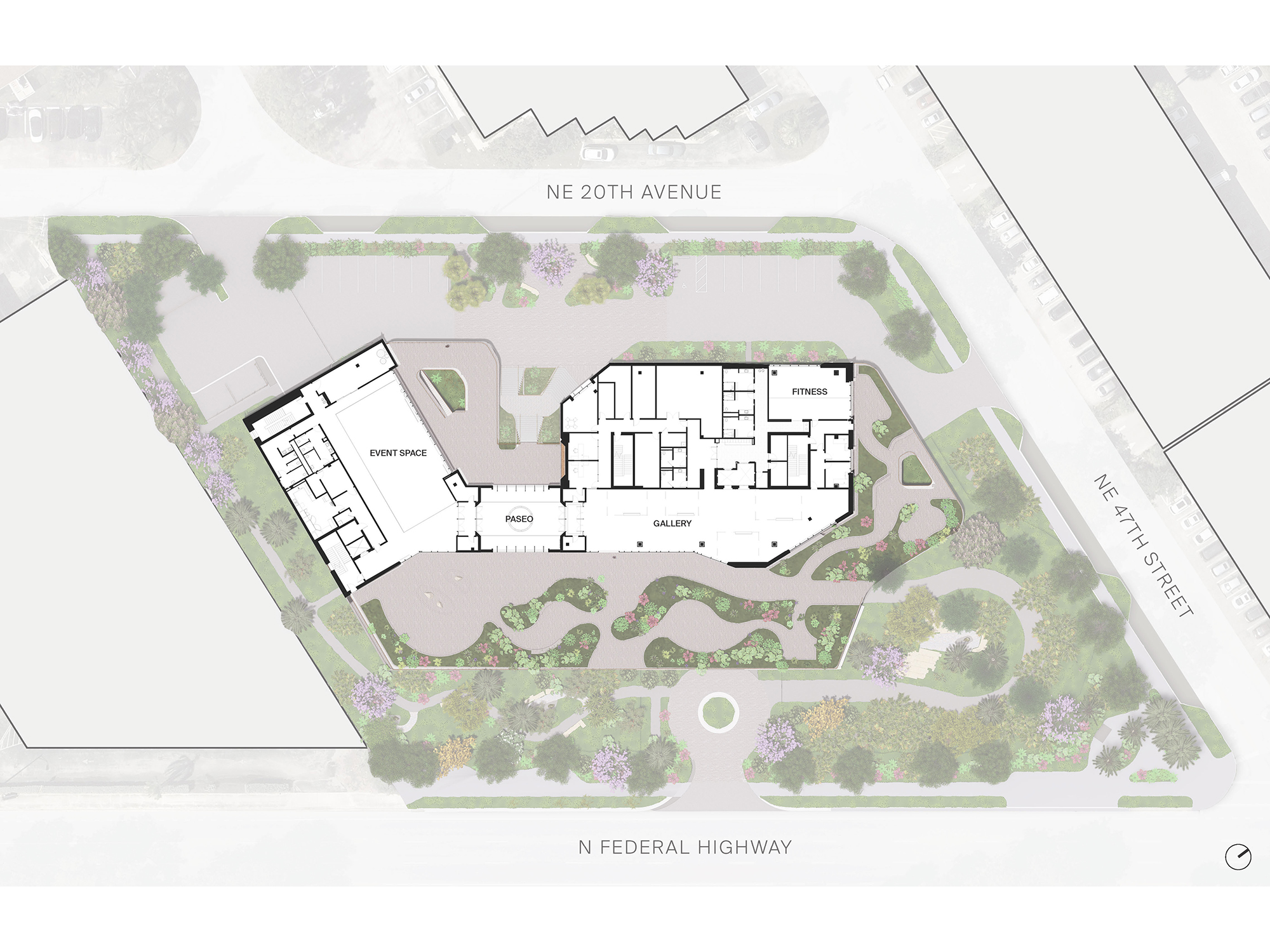The massing of the buildings is derived from resilient design strategies and key moments of discovery. The first occupiable floor is elevated 15’ above mean sea level in response to climatic considerations. This creates room for The Garden, which features over an acre of landscaped grounds punctuated with the rich local flora of South Florida. The Foundation and Institute are split into two volumes and rotated to give access to views, enhance moments of discovery, and create welcoming connections to the surrounding streets. The distinctive carves from the precast mass feature glazing oriented to nearby views that connect to Jim’s story, including the ocean and Holy Cross Hospital.