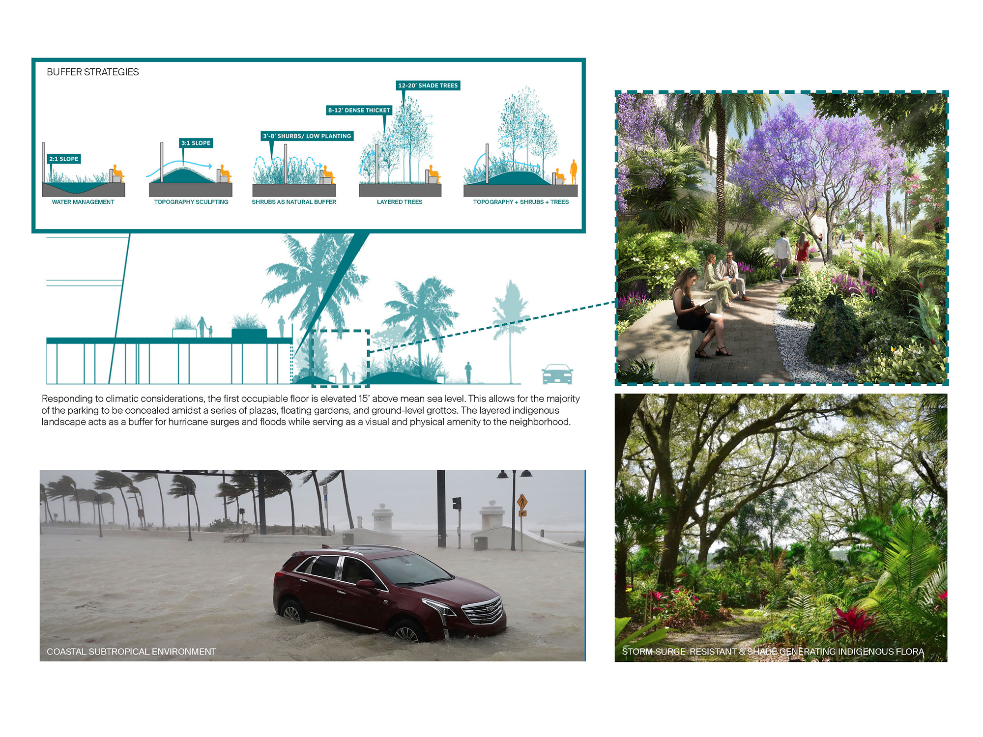 The first occupied floor is elevated 15’ above sea level with environmental resiliency in mind. The project is equipped with multiple backup generators in the event of an emergency, and the façade is designed to withstand a Category 5 hurricane event. The abundance of native landscaping and permeable surfaces slow the flow of water to the city’s stormwater management system, easing the burden on civic infrastructure.