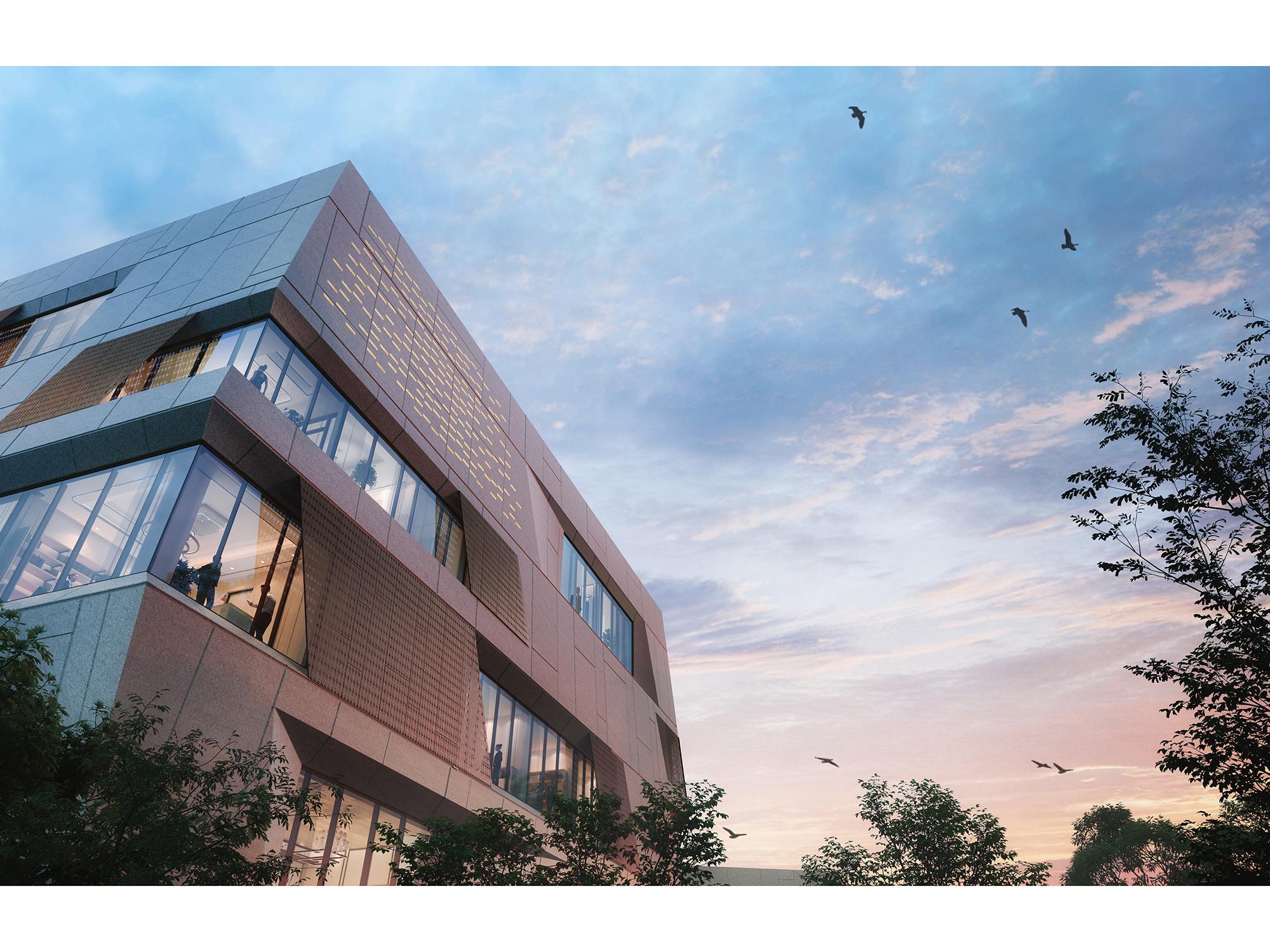 Exterior Rendering 06: View of backlit perforated precast panels which screen the building’s mechanical systems