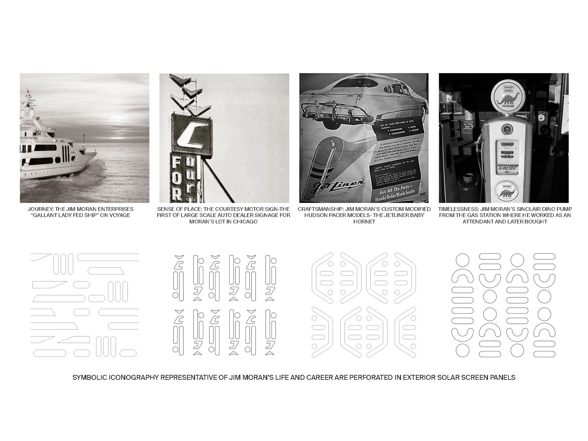 Materials and details are driven by experiential considerations and Jim’s legacy. The bronzed metal panels, which will patinate over time, are perforated with iconography derived from Jim’s career and thematically connect to the interior program. The exterior precast concrete panels feature a custom mix of aggregate predominately sourced from Florida, including local Coquina stone and shells that allude to Jim’s passion for boating. The geometry of the reveals within these precast panels is derived from automotive details that Jim added to his early Hudson stock vehicles. The interior custom millwork incorporates detailing inspired by Jim’s longstanding partnerships with Japan’s automotive industry and his belief in the value of craftsmanship.