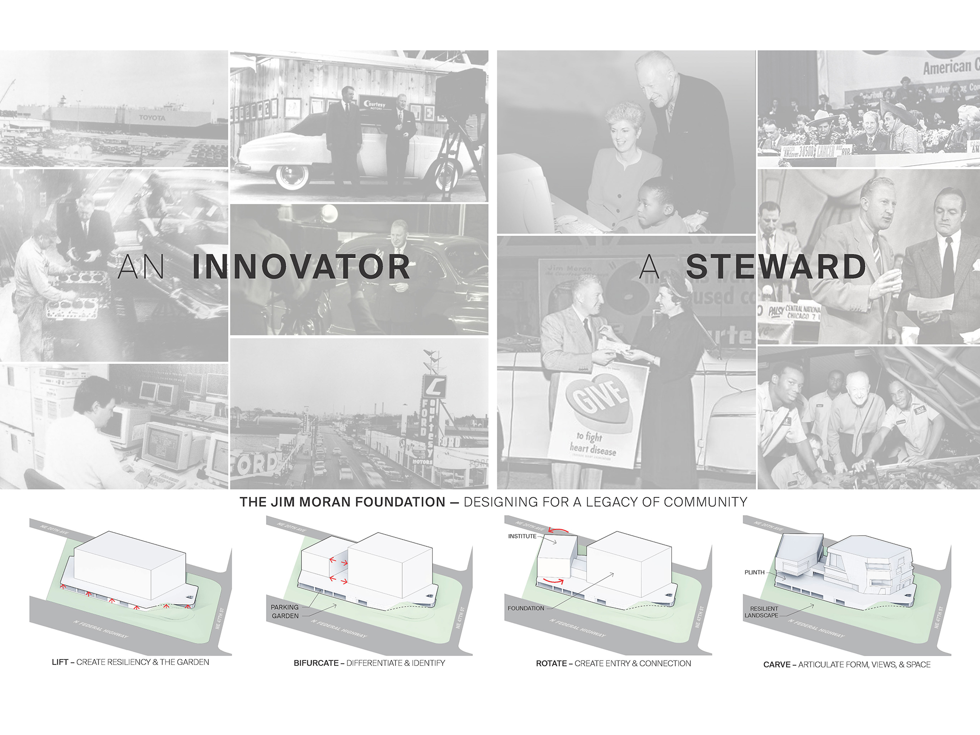 The new campus for the Jim Moran Foundation establishes an architectural identity for the Foundation derived from the visionary legacy of its eponymous founder. From modest beginnings as a Sinclair gas station lessee to his work bringing Toyota to the American market, Jim’s life was one of constant innovation. His legacy is entwined with the Foundation, which supports youth and family-focused nonprofits, as well as the Institute for Global Entrepreneurship, which partners with Florida State University to support rising entrepreneurial leaders. Charged with designing a new home for both the philanthropic Foundation and the educational Institute, the architect’s goal was to create a resilient icon that embodies the innovation and stewardship of the Foundation’s namesake.